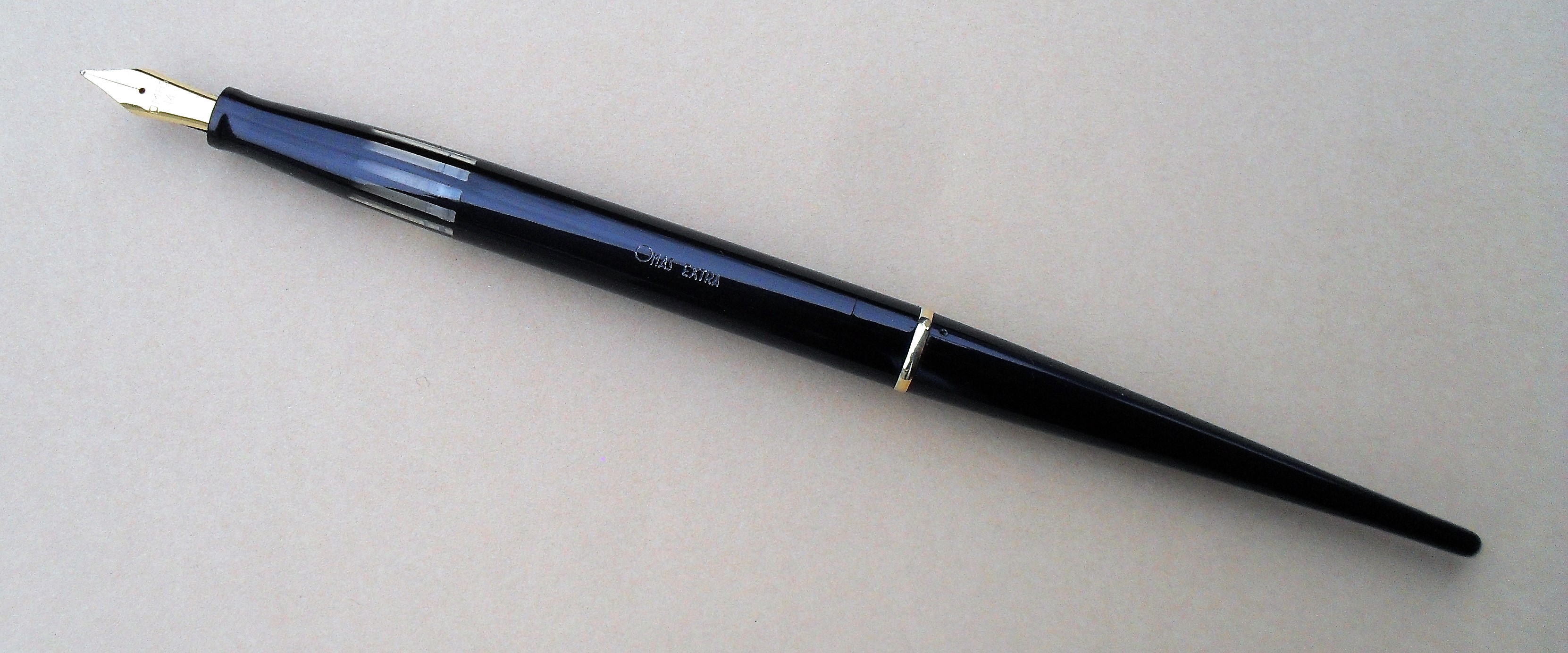 La parte terminale affusolata non sarebbe altro che il pomello, lo stesso che trovi nelle penne con carica a stantuffo. Se lo giri si comporta tale e quale e aziona lo stantuffo. In realtà la parola "stiloforo" si riferisce alla base che sostiene la penna. Impropriamente la parola indica anche questo tipo di penna da tavolo. La stessa forma la trovi anche nella Art Pen della Rotring, altre sono di marca Pelikan, On Line, le prime che mi vengono in mente. Normalmente,tutte a cartuccia, sono utilizzate per l'arte grafica e la calligrafia disponendo di molte gradazioni. I pennini della Omas e della serie minore Minerva che hanno il foro a forma di cuoricino sono flessibili, mentre quelli con il foro tondo sono rigidi.