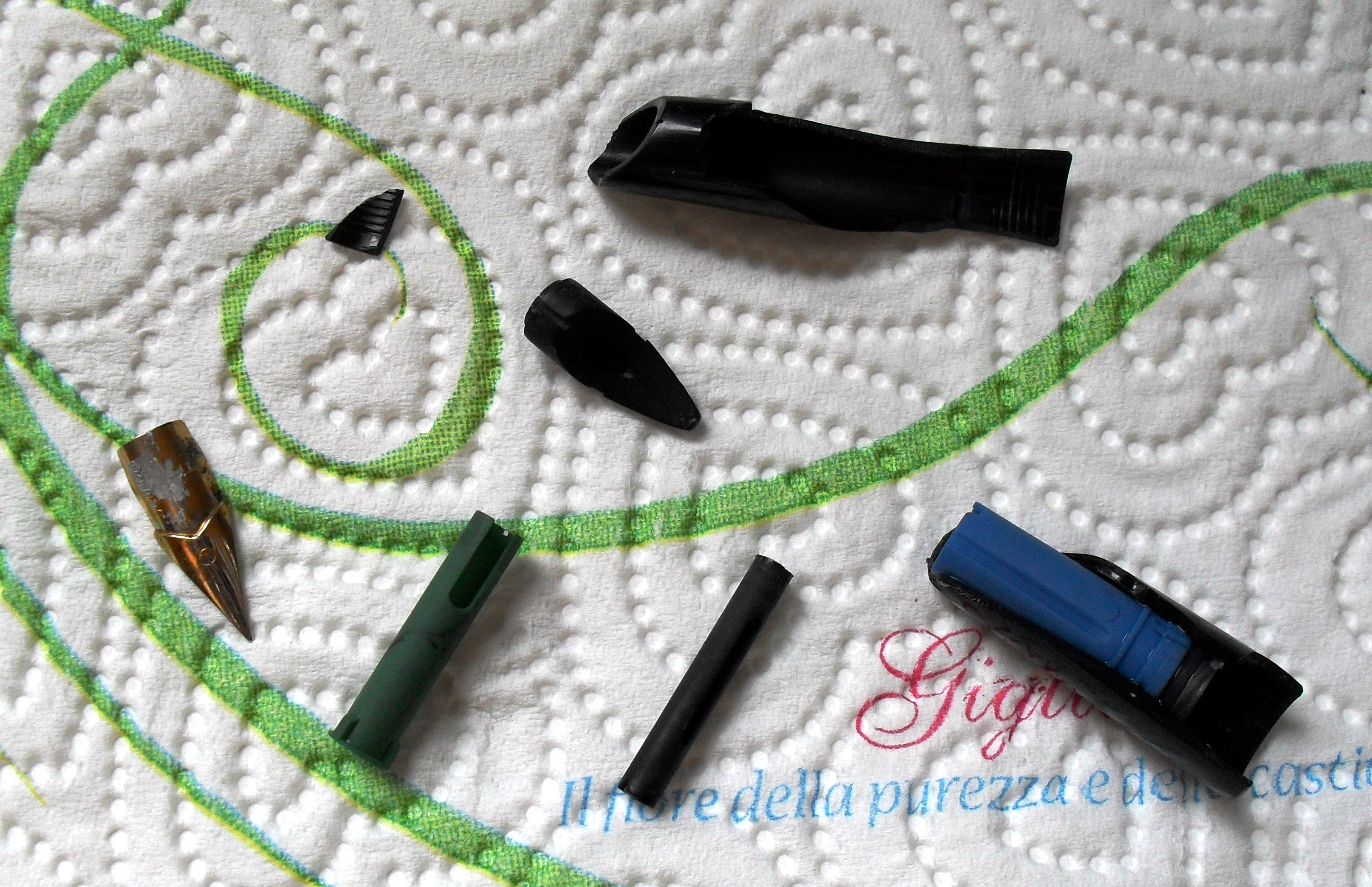 Perso per perso, ho deciso d’intervenire drasticamente, ottenendo questo “bel” risultato: la mia prima penna rotta. Poco male, ho pensato: innanzi tutto è mia, ergo non ho rovinato la penna di qualcun altro, e poi è di plastica, perciò, pur con le mie limitate abilità, la posso riparare. Ho cominciato dal pennino, che sembra fosse rimasto incollato, per una ragione che non riesco ad immaginare, alla superficie interna della guaina: alcune passate di carta abrasiva di grana via via più fine ed una lucidata con pasta Iosso hanno risolto il problema delle incrostazioni, rimuovendo ovviamente anche la parte rimanente della doratura, peraltro già irrimediabilmente rovinata: La guaina è stata ricomposta, incollando i vari pezzi con colla per plastica Faller. Dopo un giorno d’asciugatura, sono passato alla levigatura delle giunture, rifinite con carta abrasiva, pasta dentifricia e pasta Iosso. Il risultato era buono, in termini estetici, ma ad una prova di montaggio sul corpo (ricordate che l’avvitamento avviene in senso antiorario), i pezzi si sono di nuovo separati.