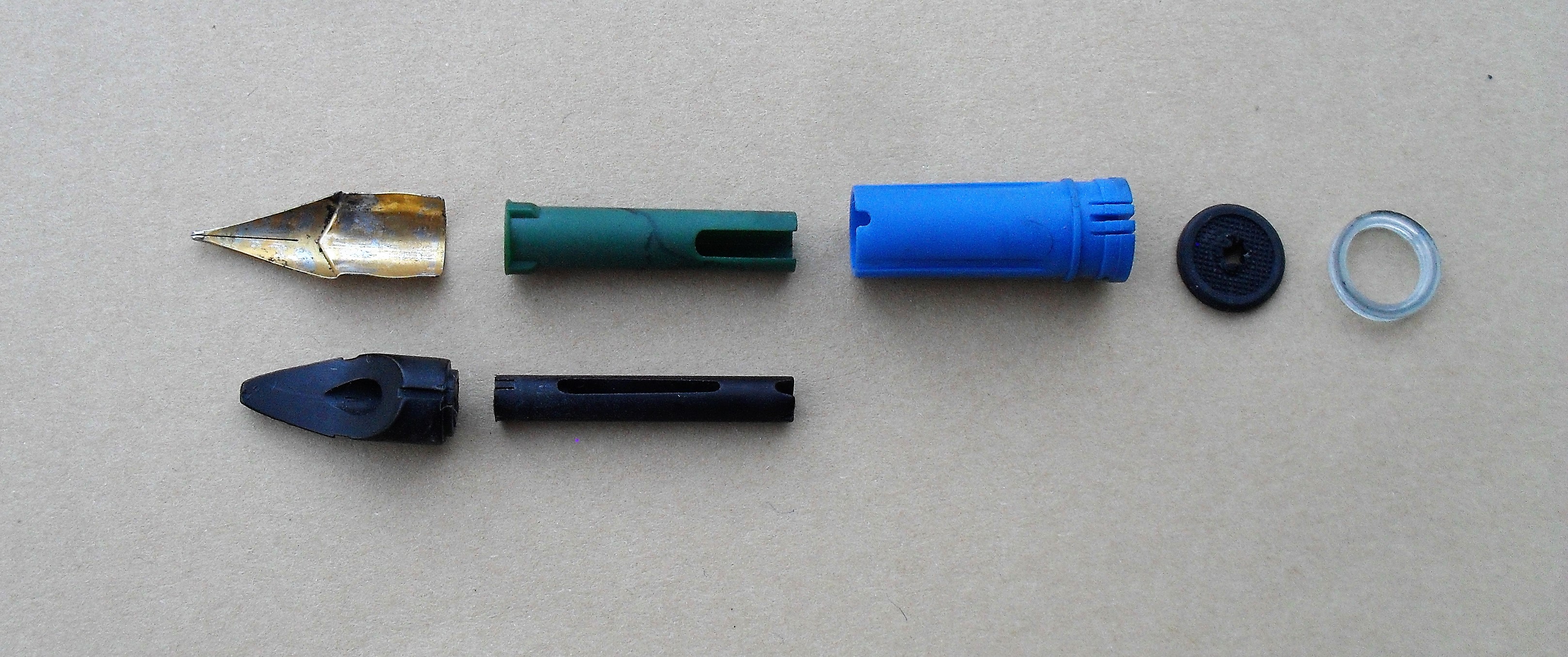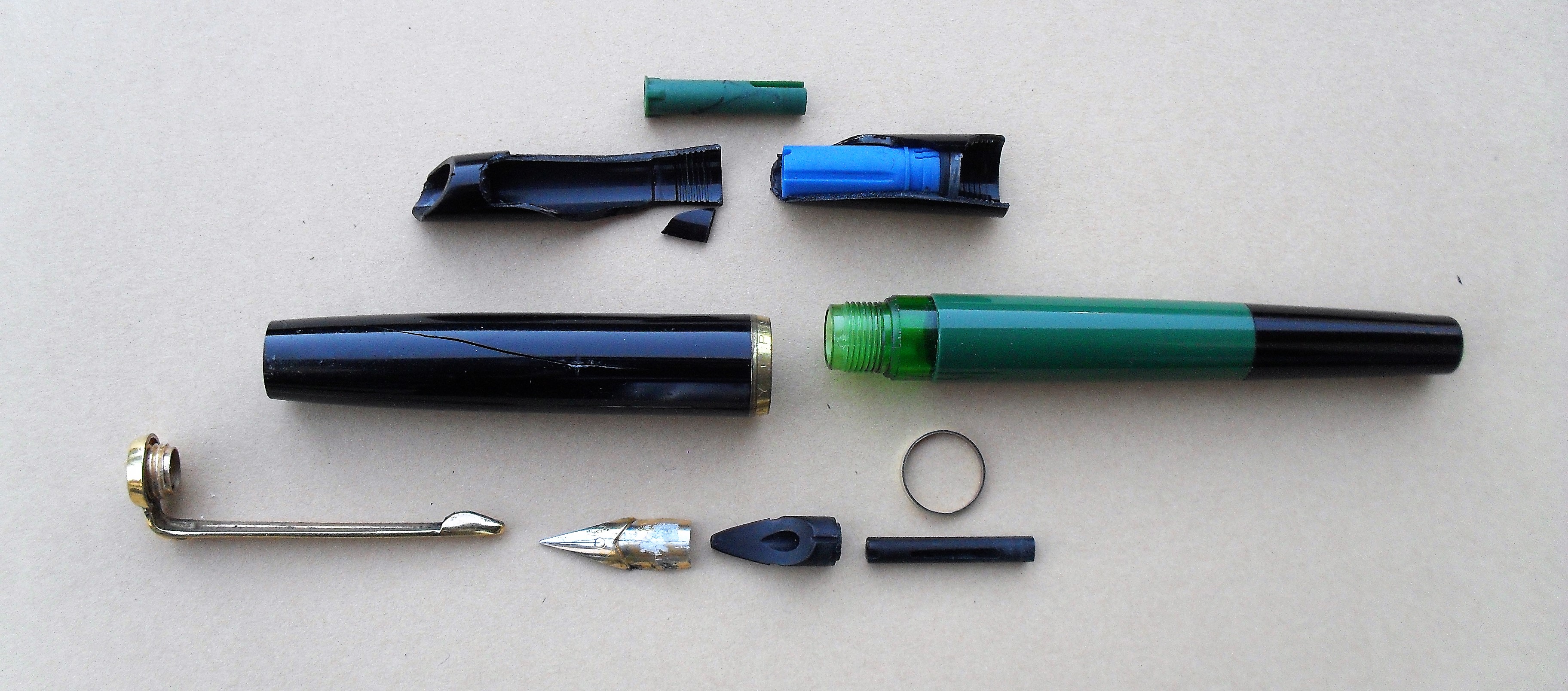 Anche l’alimentatore, che mi ricorda quello della Parker 45 ma che, grazie al cielo, non è così sottile, si è rotto. Qui un uso giudizioso e paziente di colla Faller ha risolto il problema.