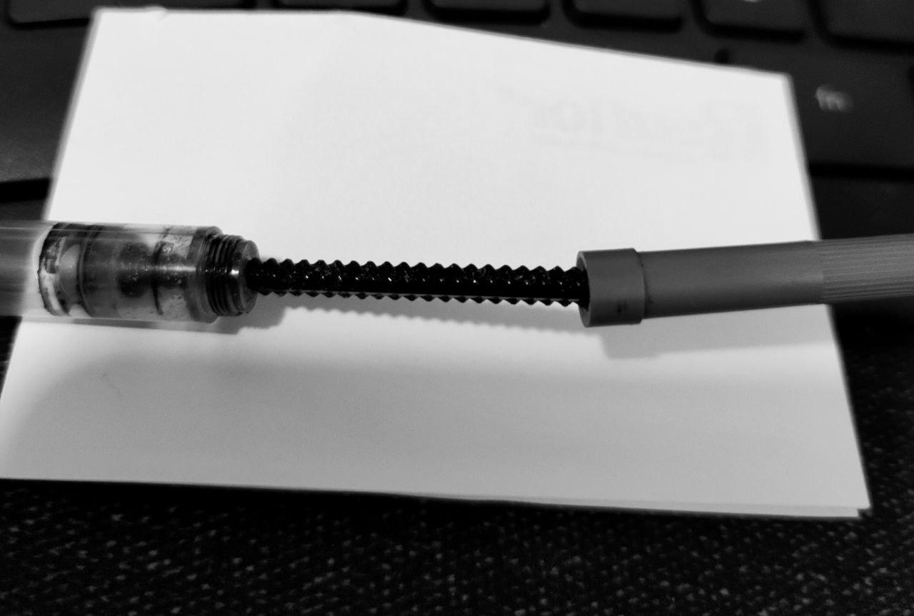 Come dicevo nella presentazione mi diletto a restaurare penne. ME ne è capitata una con tante incrostazioni di vecchio inchiostro. Son 2 giorni che provo con acqua, aceto e liquido herbin a togliere i residui. Alla fine ci son quasi riuscito, ora l'acqua che carico con lo stantuffo diventa solo di una venatura celestina. Però ho fatto danno. Lo stantuffi è in plastica e si vede che a son di caricare si è spanato. E non prende più i dentini. Vi allego foto del pezzo. Purtroppo sto sempre attento a tante cose, ma a questo ahimè non avevo pensato.