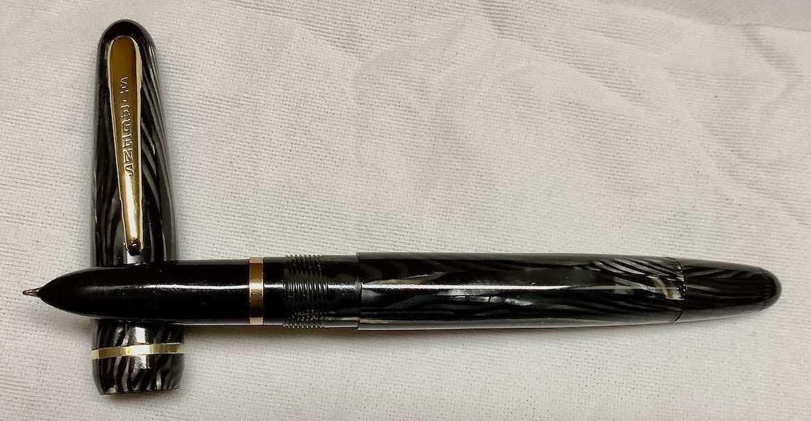 Bellina stilo a marca Surgens, in celluloide grigio-verde striata (da un ubriaco sembrerebbe...) carenata. Riempimento a pulsante di fondo.