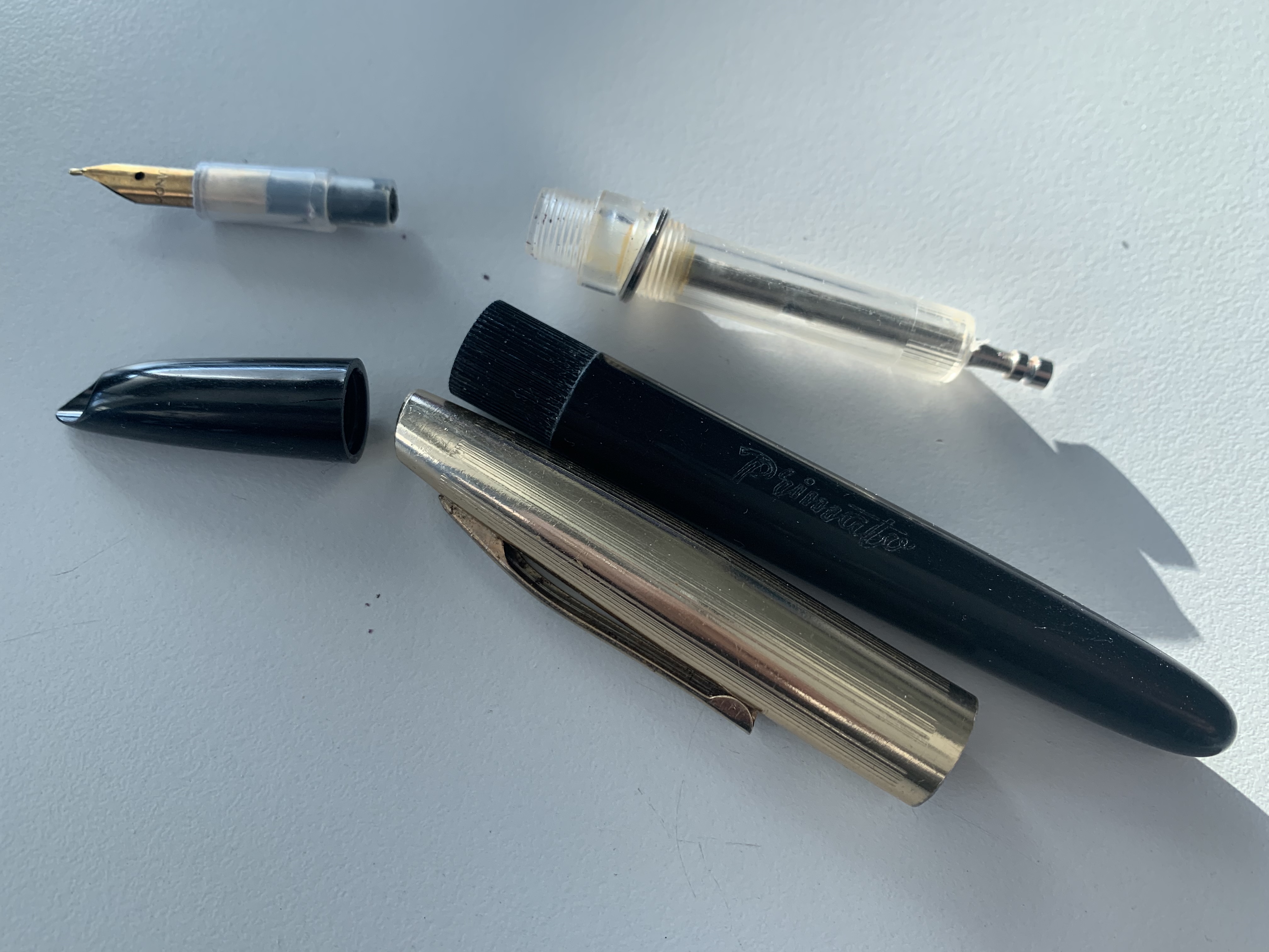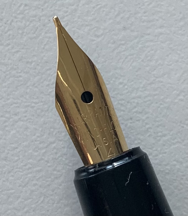 Il pennino in genere è un wingflow n. 1, anche lui a punte ripiegate, un po' duro ma che scrive bene. Il tuo magari è stato sostituito, ma mi sembra molto simile. Fai giusto attenzione a non rompere il collarino trasparente (polipropilene?) perché è il pezzo che si trova di meno.