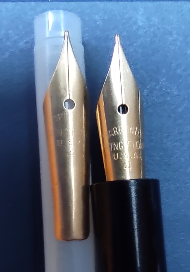 Il pennino a destra (come il tuo) risulta avere una punzonatura più profonda e con la scritta Warranted posta a qualche millimetro sotto il foro di sfiato, e scrive molto bene. Il secondo pennino a sinistra, con l'incisione più superficiale e posto immediatamente a ridosso del foro, scrive meno bene (sostanzialmente gratta di più e non è così scorrevole come il primo. Comunque si può usare tranquillamente).