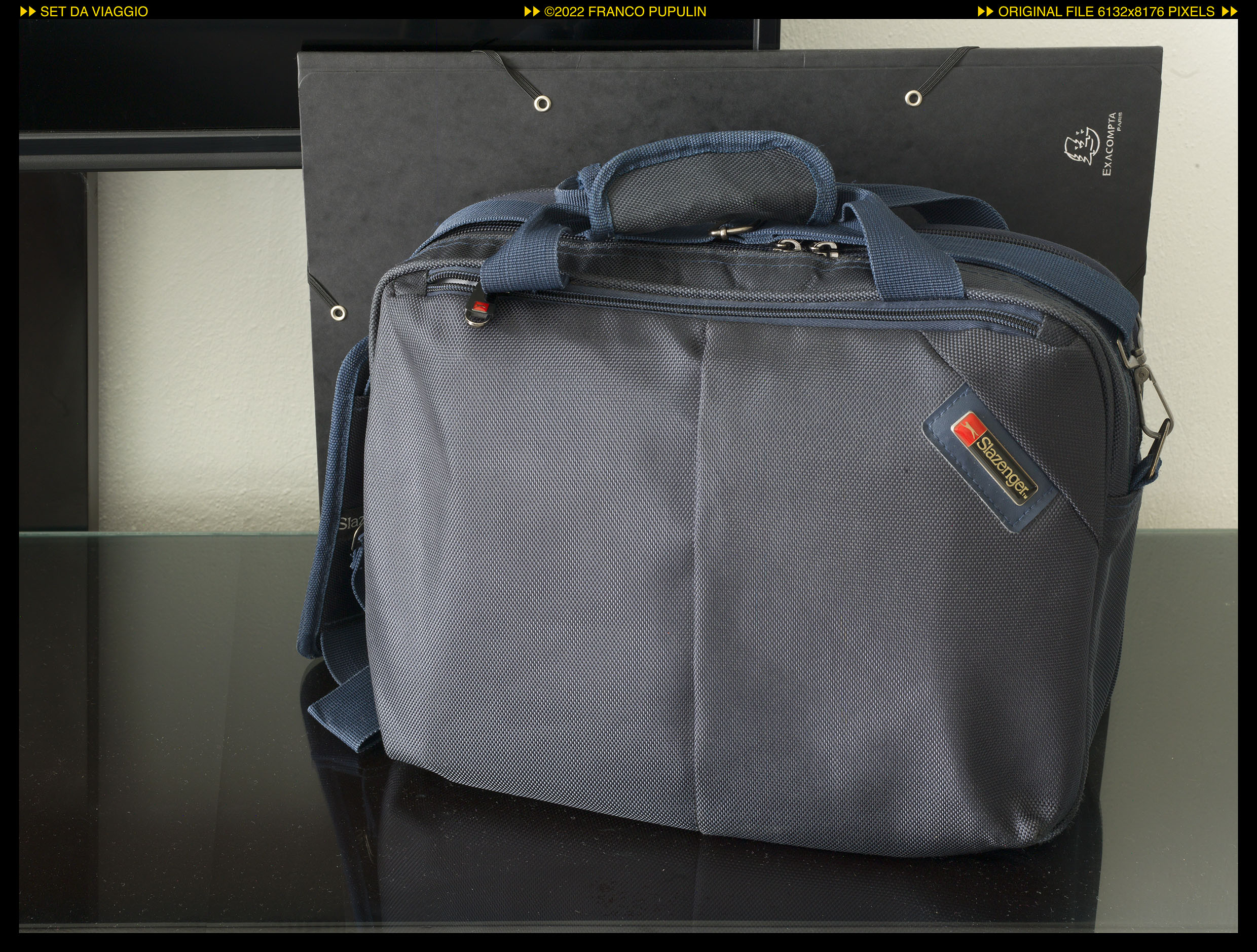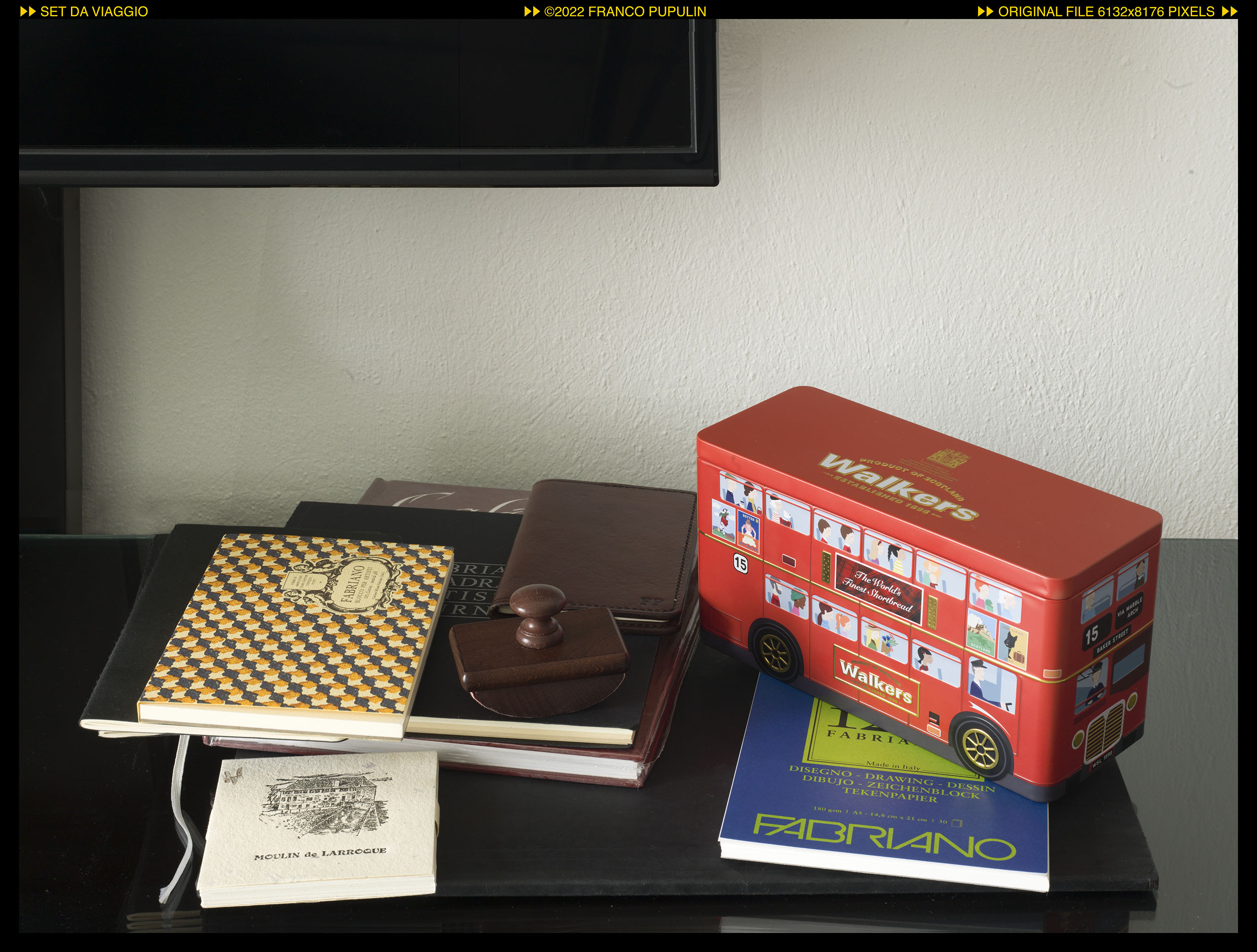 Preparo, per avere con che giocare, il mio “set da viaggio” per la scrittura. Consta di una cartelletta A3 con vari fogli di varie carte differenti in vari colori, e una borsa, che potete vedere nella fotografia.