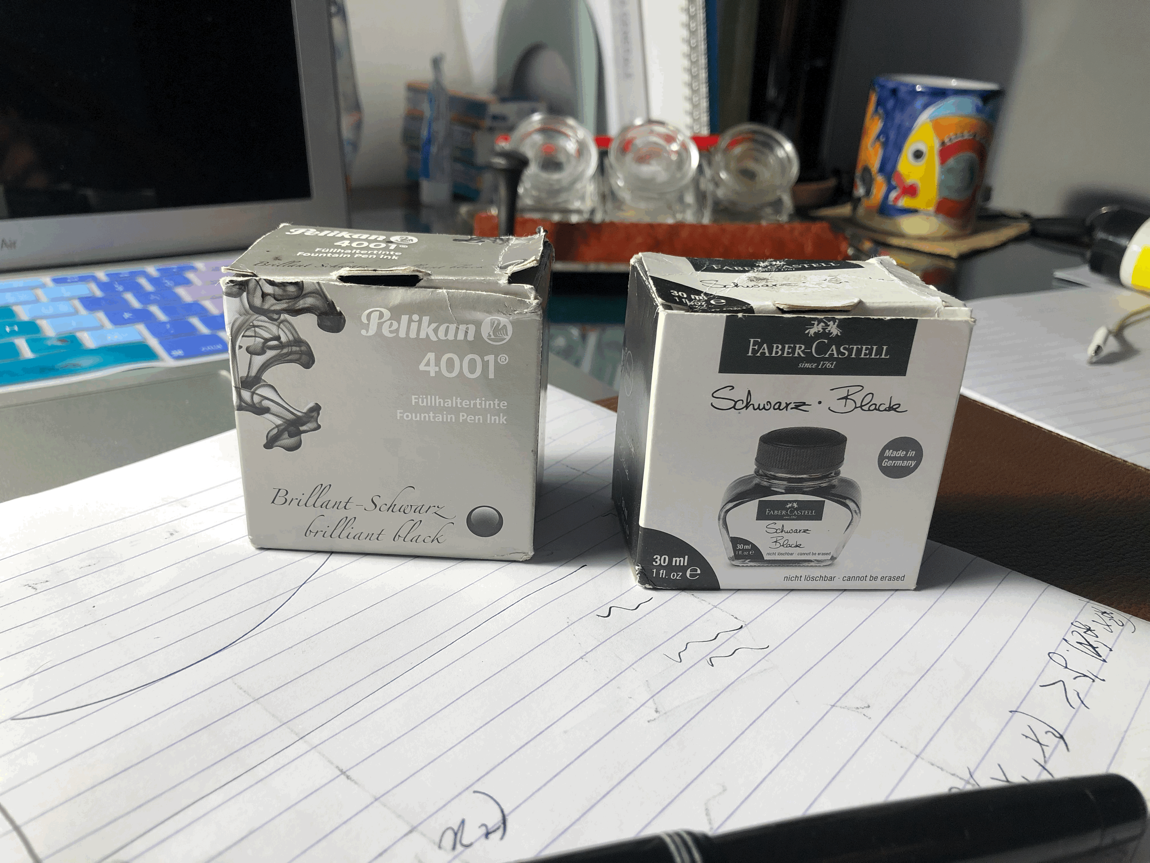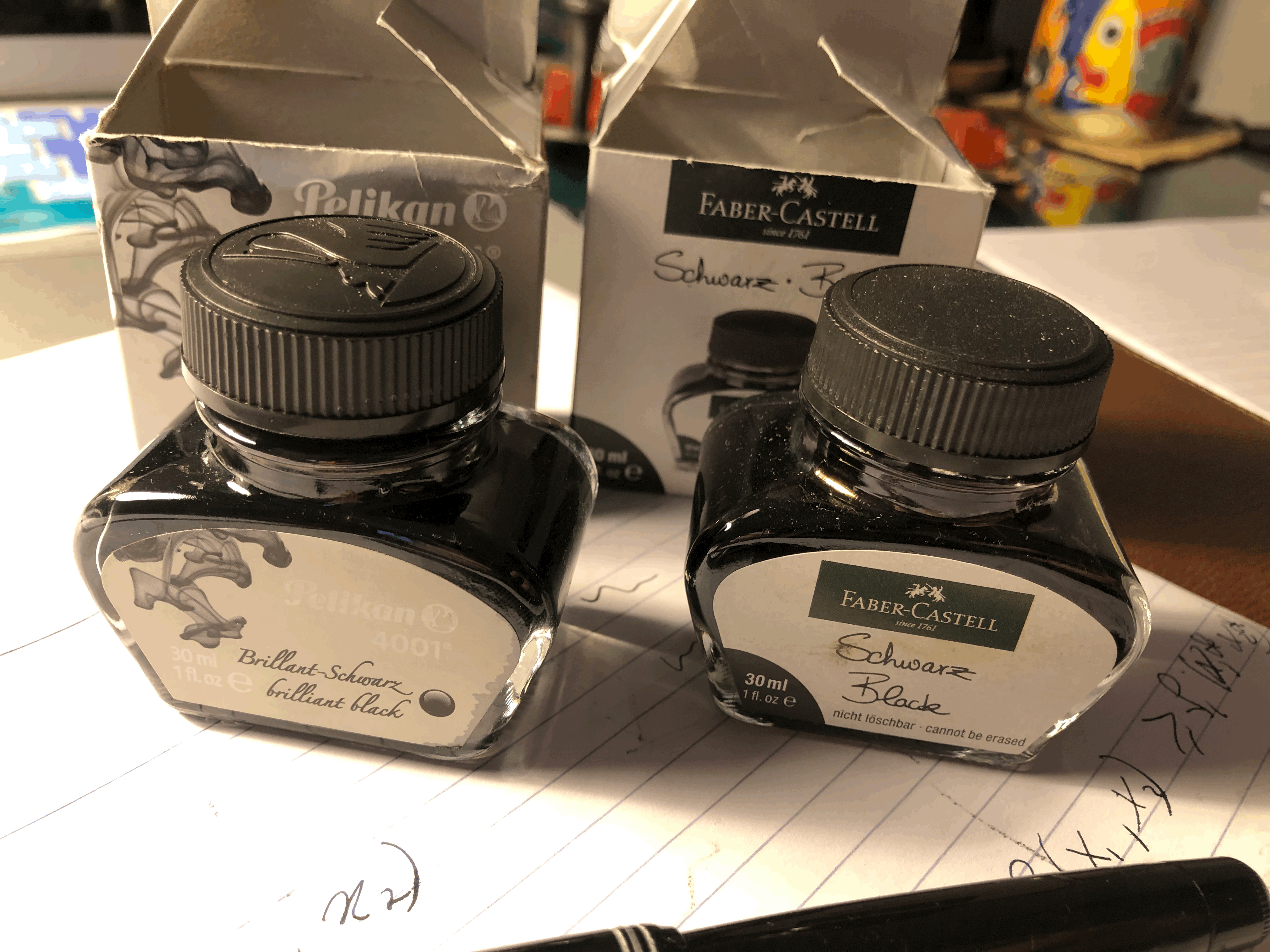 possiedo due inchiostri che mi sembrano molto simili, sono il Pelikan Brillant-Schwarz e il il Faber-Castle Schwarz, lascio le foto.