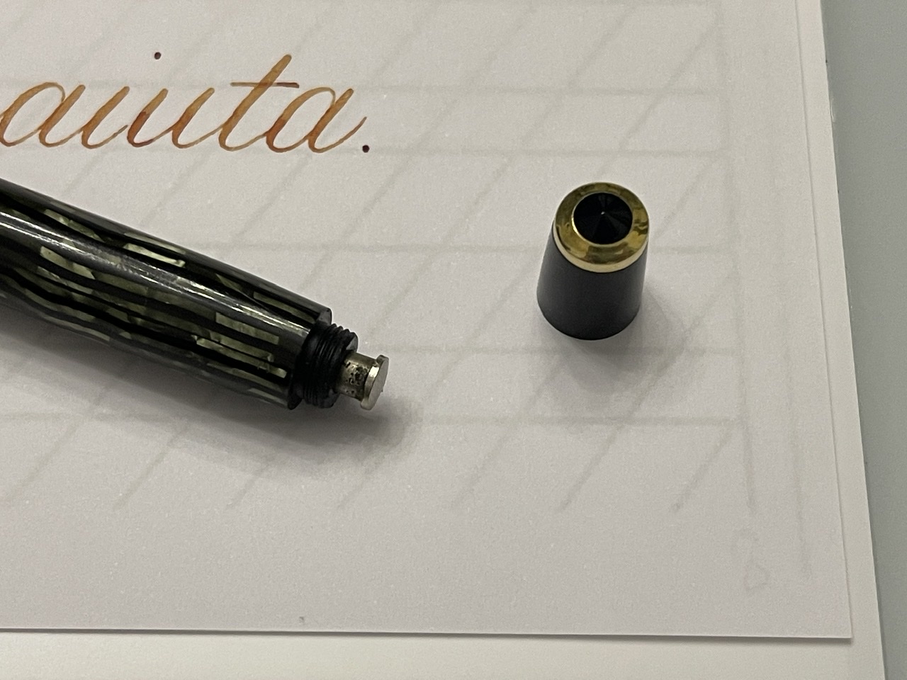 Il caricamento è a pulsante di fondo, perfettamente funzionante, con sacchetto di inchiostro appena sostituito e riempito solo una volta con Diamine Misty Blue dal venditore per la prova di scrittura. Arrivata con qualche residuo di inchiostro, ma lavo sempre le penne prima di caricarle.