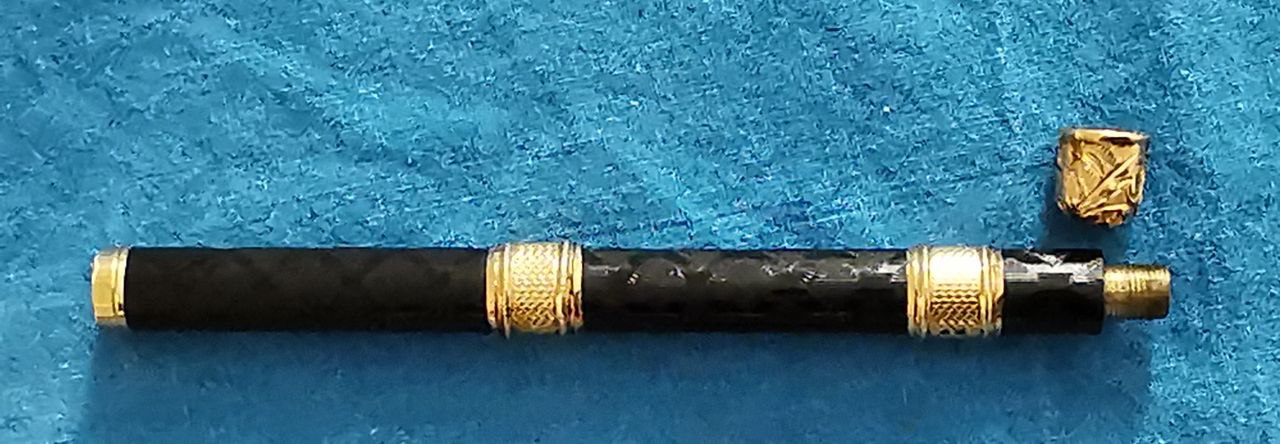 Portamine e portapennino da viaggio, devi far scorrere gli anelli dorati in modo da far uscire, pennino e mina dall'estremità con foro e taglio a semicerchio.
