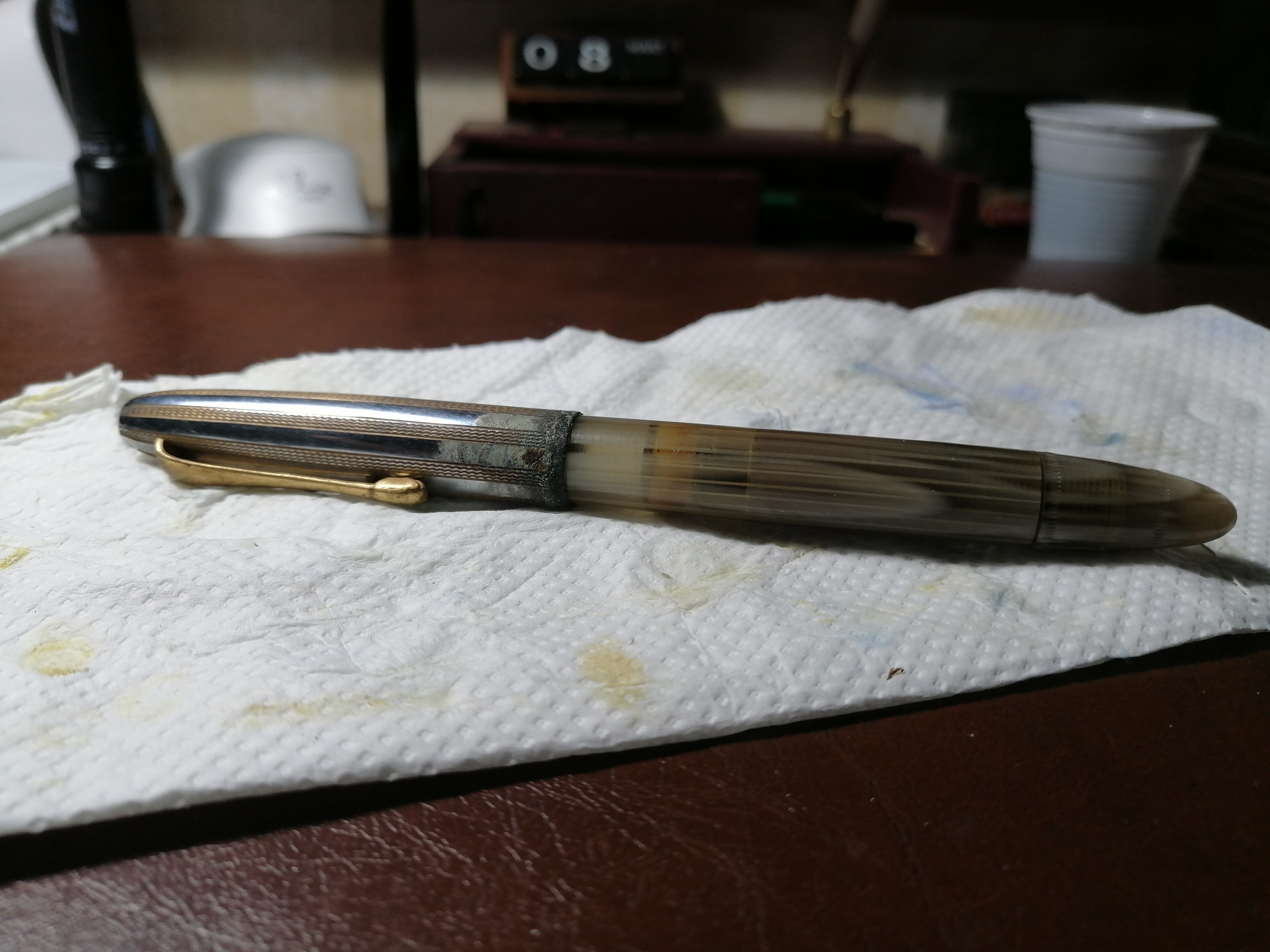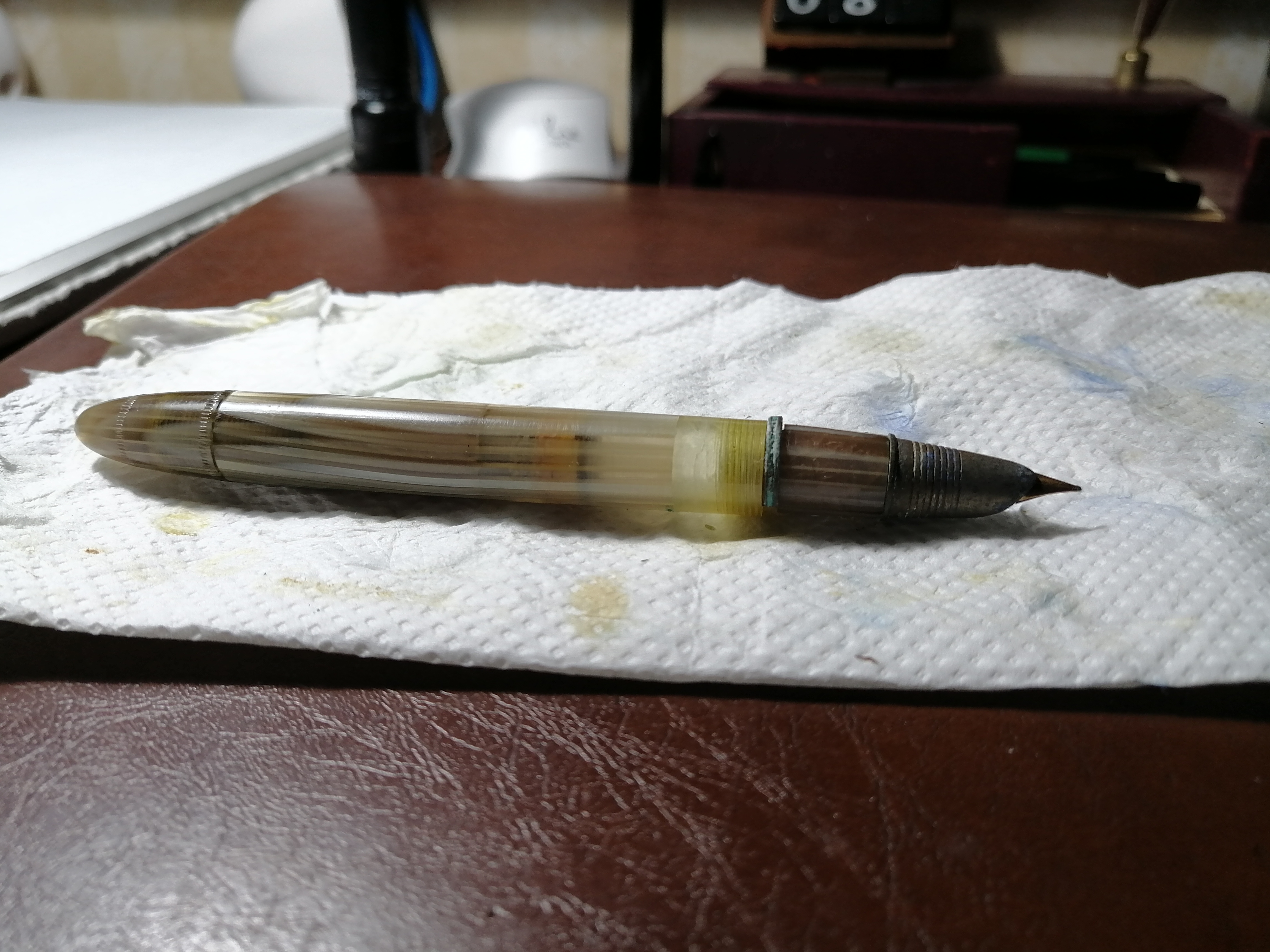 Ho comprato, nella nota cartoleria di Cagliari, una Titania dei primi anni 50, in una bellissima celluloide color avorio (credo anellata, ma correggetemi se così non fosse), che ha visto senza dubbi giorni migliori (tra celluloide crepata, corrosione e ossidazione su tutte le parti metalliche e pistone completamente bloccato) ma con un fantastico pennino in 14 kt Titania OSMIO flessibile (misura M credo) che ovviamente andava salvato. Ora lascio la parola alle foto.