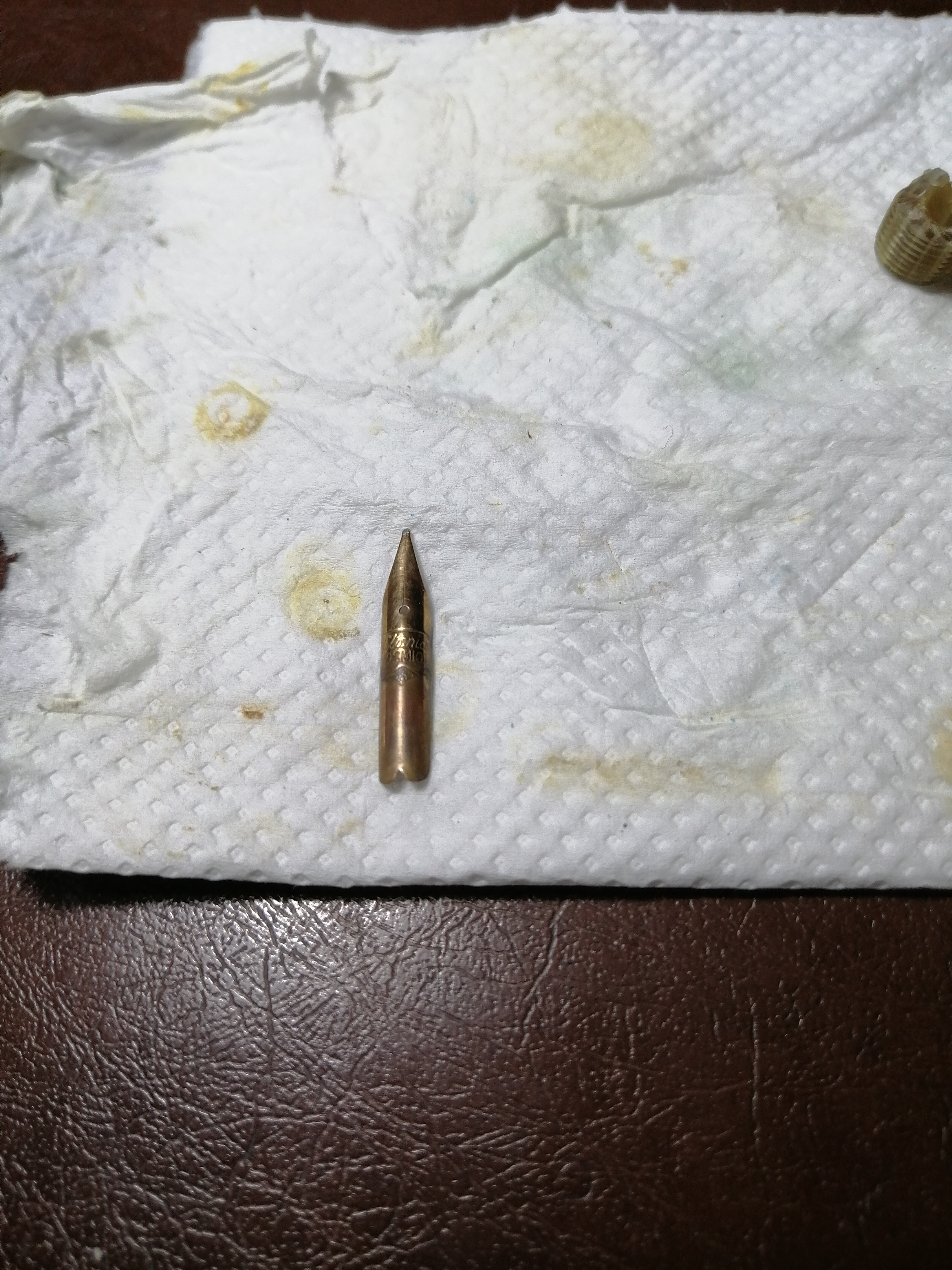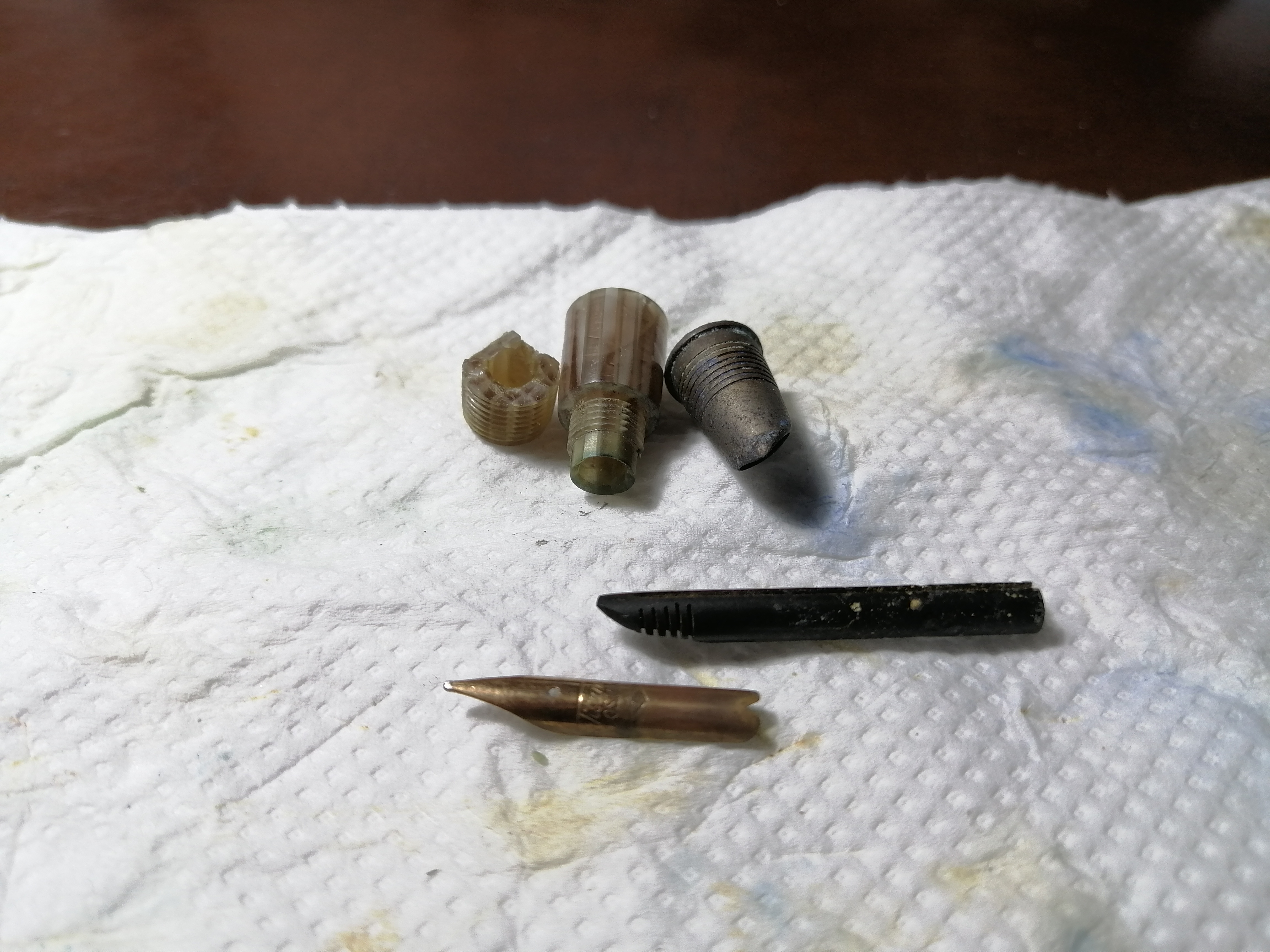 Oltre alla celluloide, pennino, alimentatore e cappuccio, ho recuperato anche il meccanismo del pistone (l'alberino - con la vite della guarnizione - e la sede in cui scorre) e la sezione, che sono riuscito a riparare con il cianoacrilato (quest'ultima non so ancora a cosa verrà destinata, ma per sicurezza la tengo). Viva il riciclio!