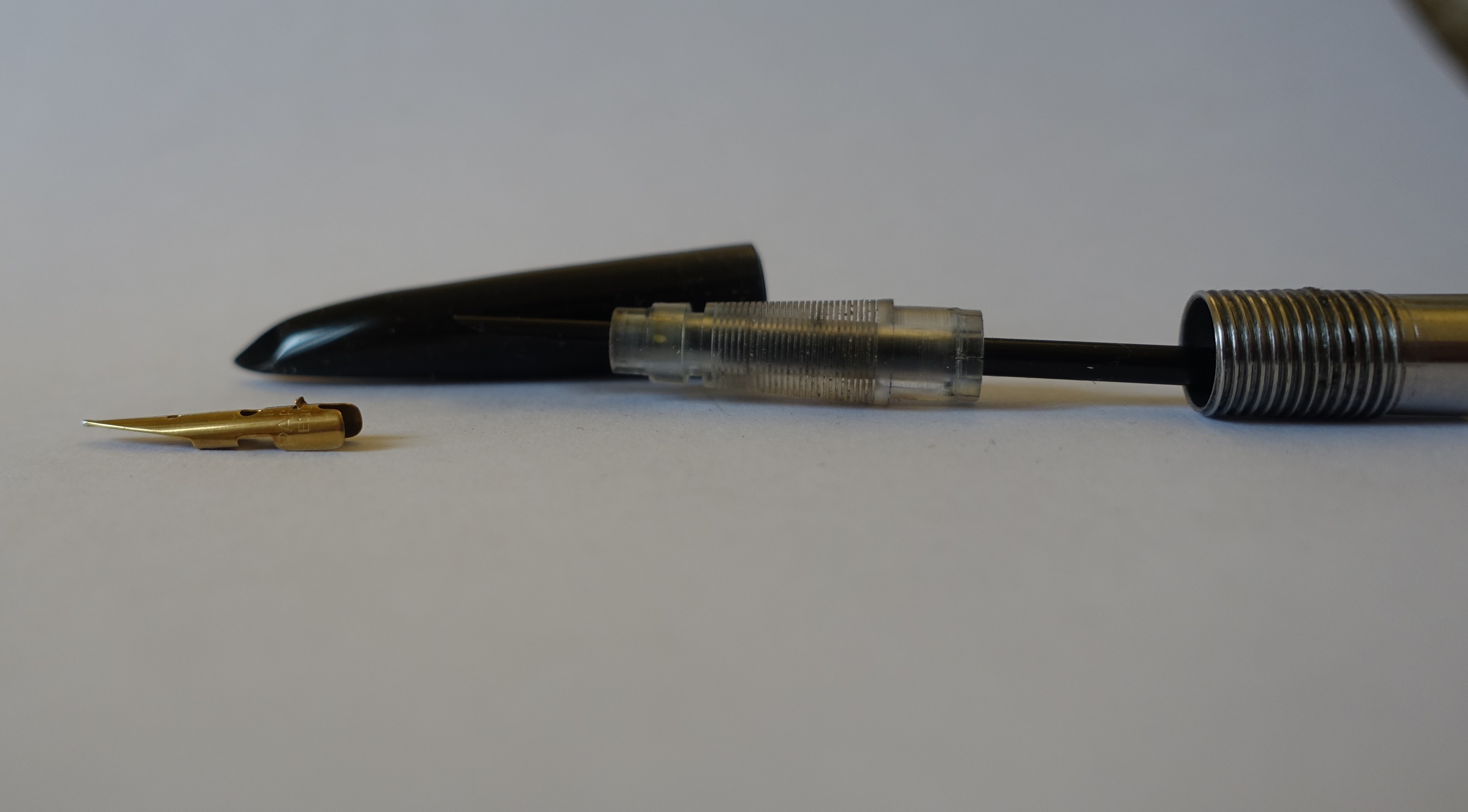Infatti c'è un tubicino metallico nel raccordo sezione- converter nel quale va ad innestarsi il converter; ma il vero punto sig.ri è: come rimuovo il pennino-alimentatore (sperando che ci sia e non sia rotto) dalla sezione ? Spingendo il pennino all 'indietro nulla; forse c'è un qualche fermo ( una specie di rondella ? Vedendo non si capisce bene) che ne impedisce il cammino a ritroso ... e se c'è come si toglie ?