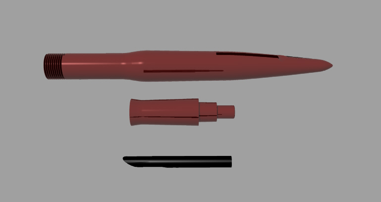 Cari amici, ecco uno schema realizzato in Rhinoceros, di come penso che riparerei il mio Skyline, caso parte dell'impugnatura si è fratturata, lasciando la parte del beccuccio che entra nella sacca d'inchiostro, incastrata nel corpo della penna stilografica...
