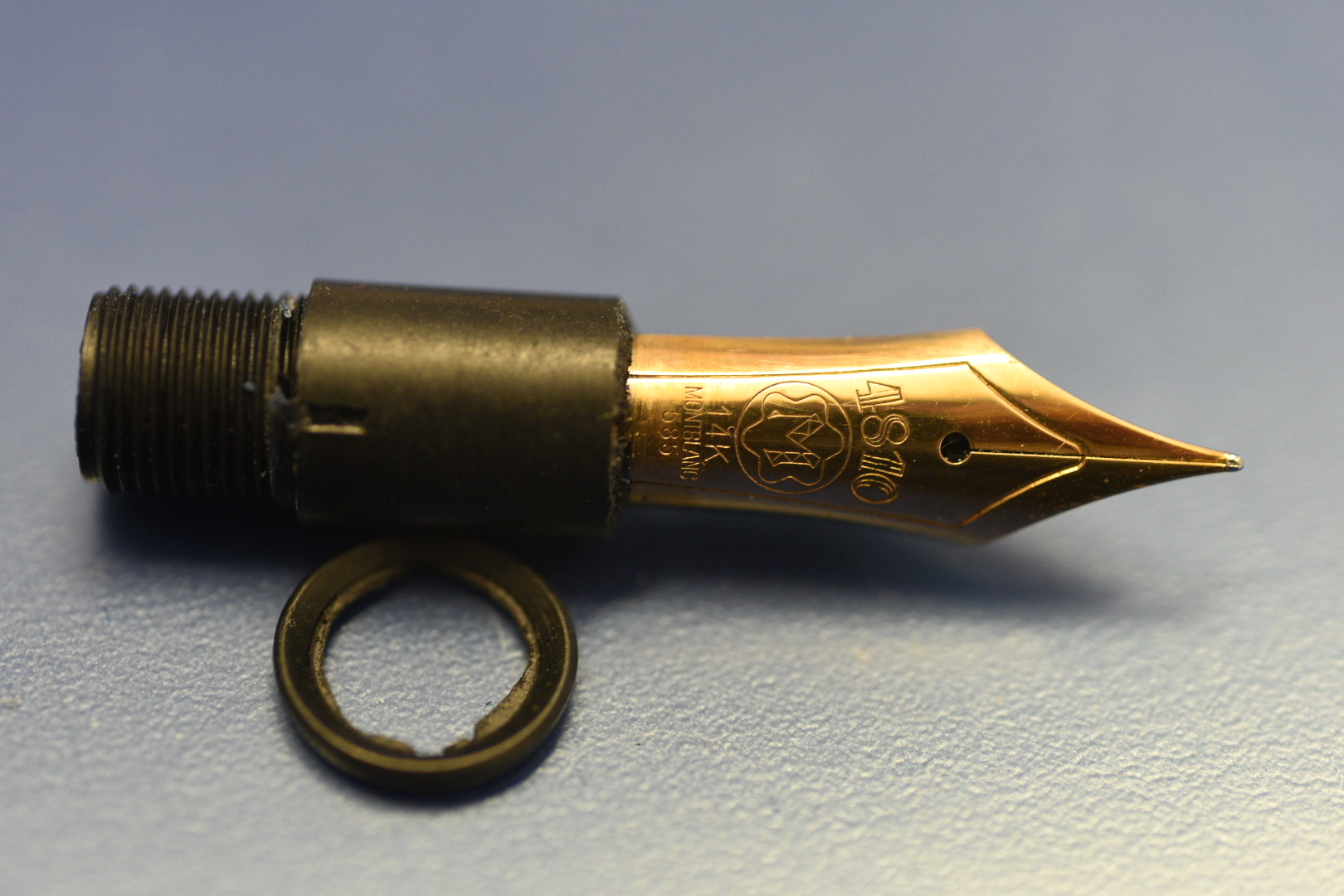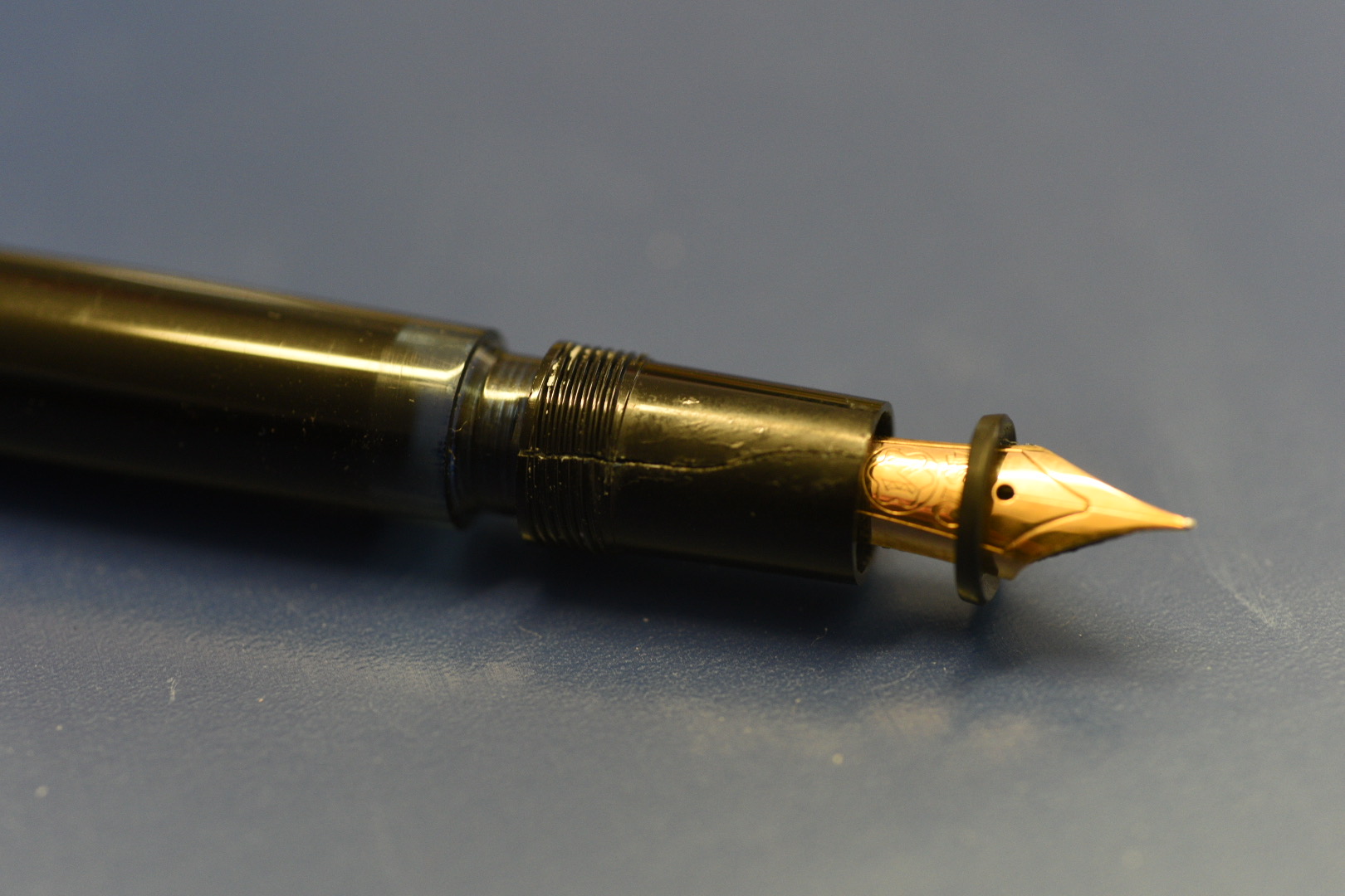 Ha la sezione spezzata verticalmente e il collarino rotto. Ho provato a inchiostrarla, il pistone funziona e il pennino scrive molto bene, morbido, credo sia un F o M. Secondo voi vale la pena provare a ripararla?