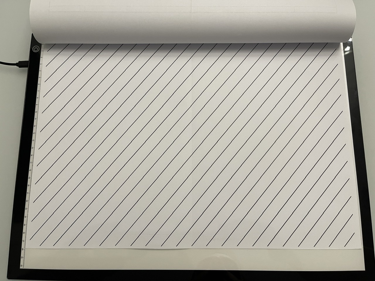 Per il corsivo inglese, ti consiglio di stampare su un foglio le linee parallele a 55º (o altra inclinazione, da 45 a 55º vanno bene tutte) e su un altro la falsa riga con le varie altezze del testo (es. una per il corpo testo da 8mm, una da 10mm, una da 6mm…).