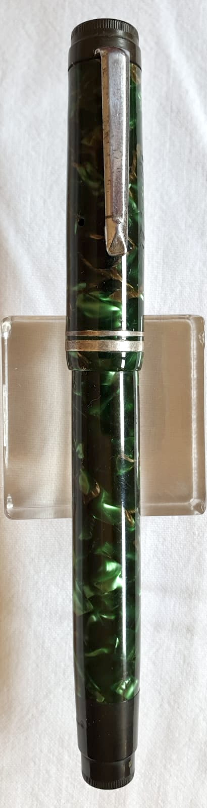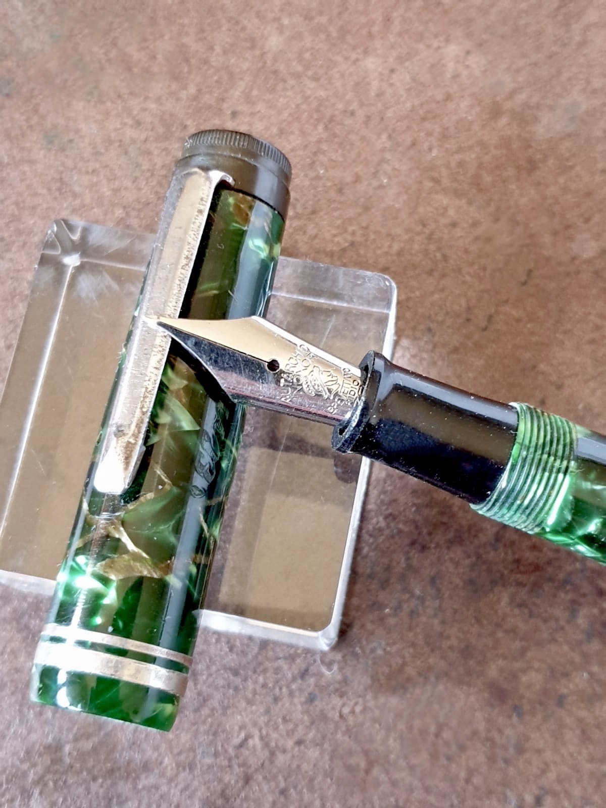 Bella ELMO anni ‘30, con caricamento a pulsante con camme nel codolo per non doverlo svitare. Lunghezza 15 cm. Notevole il pennino in "Autarchic Inoxor", così battezzato da Monte Grappa come, in quegli anni di autarchia, Ancora (Zanio), Aurora (Platiridio), Omas (Permanio), Kosca (Nichroma) e Stilus (Osmiria).