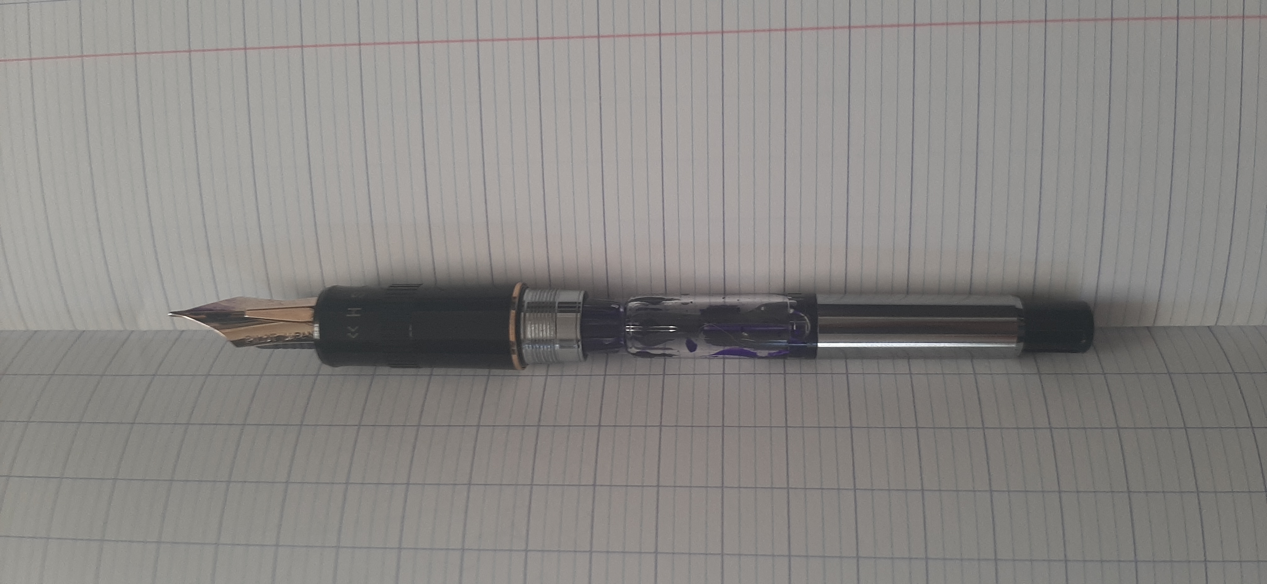 La Pilot è arrivata, scrive piacevolmente sia in posizione H che S (che personalmente preferisco), è una bella penna ma, sempre personalmente, non mi trasmette il "piacere dell' oggetto" della ( per rimanere su forme simili) Pelikan m 800 - 1000 ( che però sono più costose). Vi chiedo ... ma come si carica questa Justus ? ho compreso che va pigiato il pulsante ma mi sembra che comunque ( anche con un rilascio "controllato" del pulsante) raccolga poco inchiostro ( vedere foto allegata); poi una curiosità... il converter immagino possa essere rimosso considerato che in confezione vi è una ( non avranno esagerato ?) cartuccia ... il converter è avvitato o a pressione ? Grazie come sempre