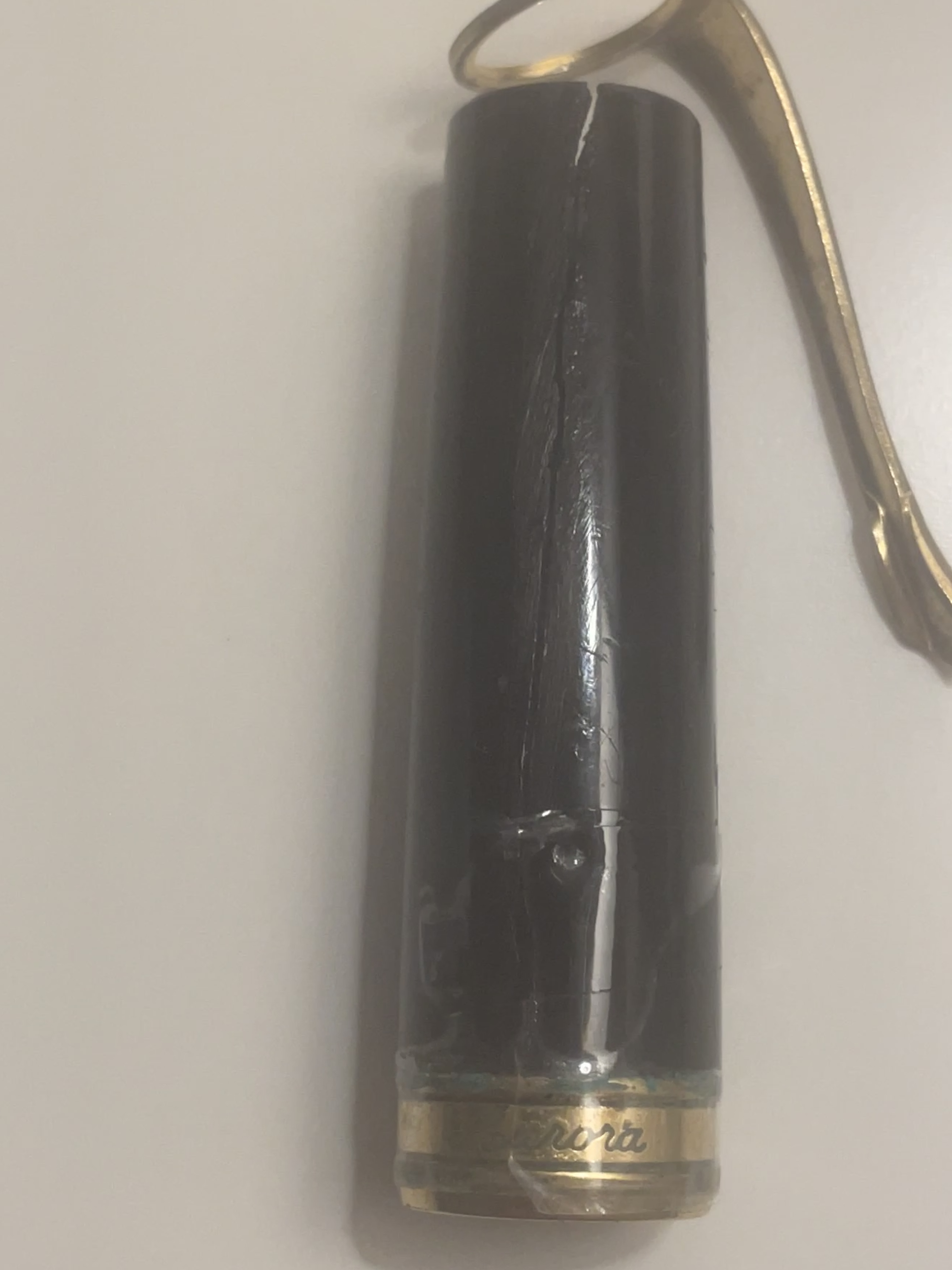 La seconda è più facile ed è solo una questione “economica”. SI tratta di una bella Aurora (88, credo) il cui cappuccio, come vedete, è andato in frantumi. Per il solo cappuccio alla Aurora mi è sta chiesta una cifra esagerata….. avete idea di dove si possono trovare pezzi di ricambio, usati, e a poco prezzo (mi sembra improbabile si possa riparare :-)