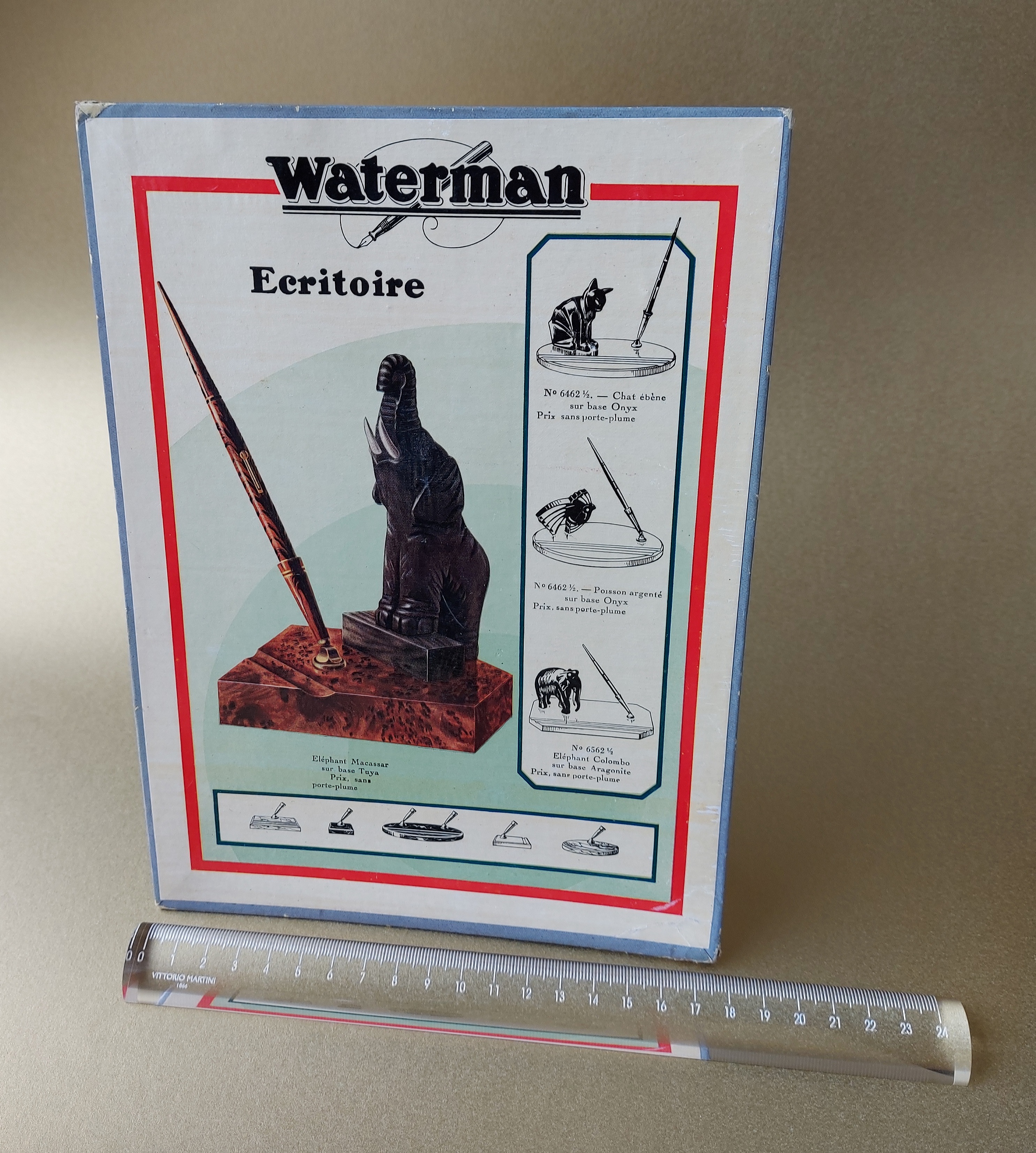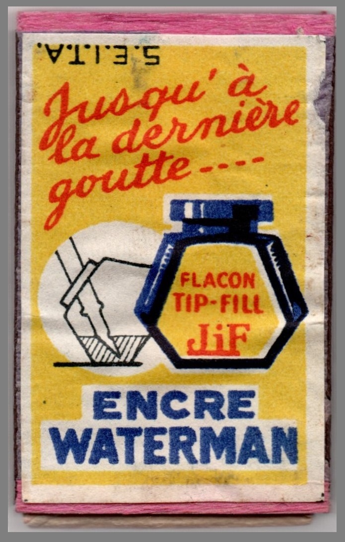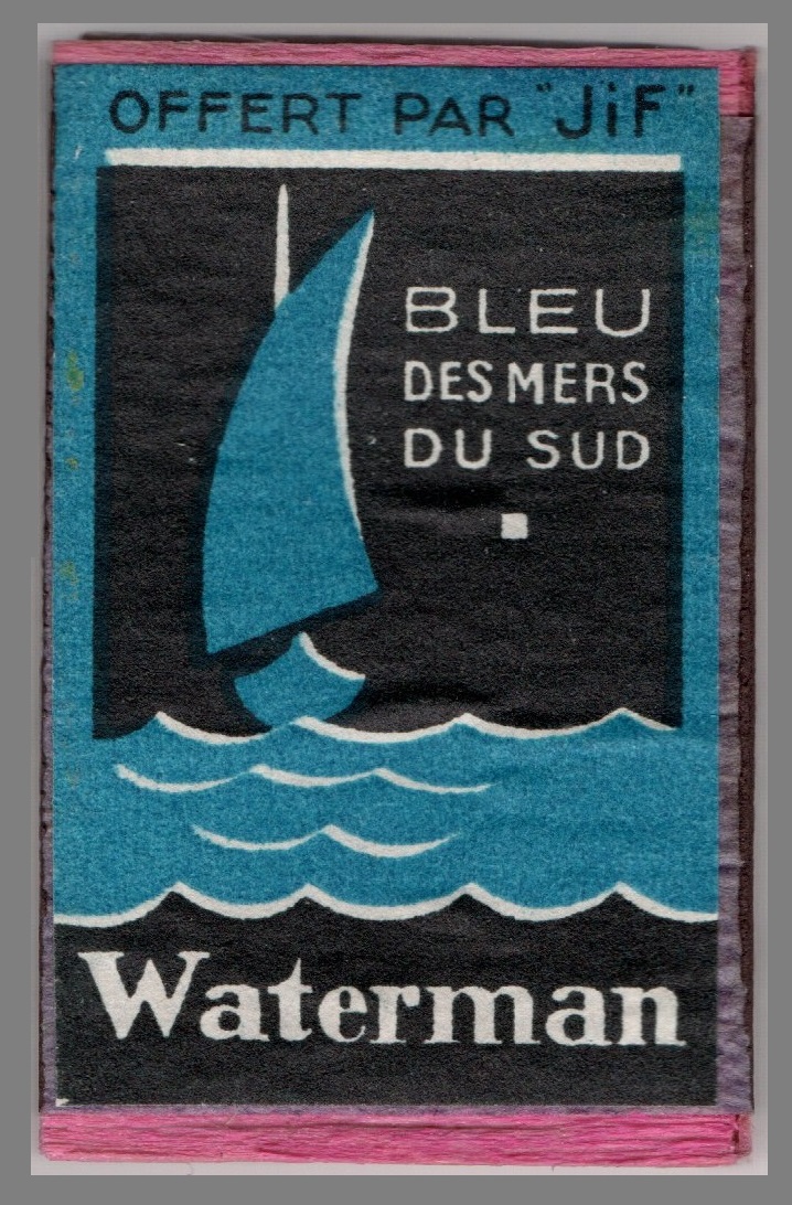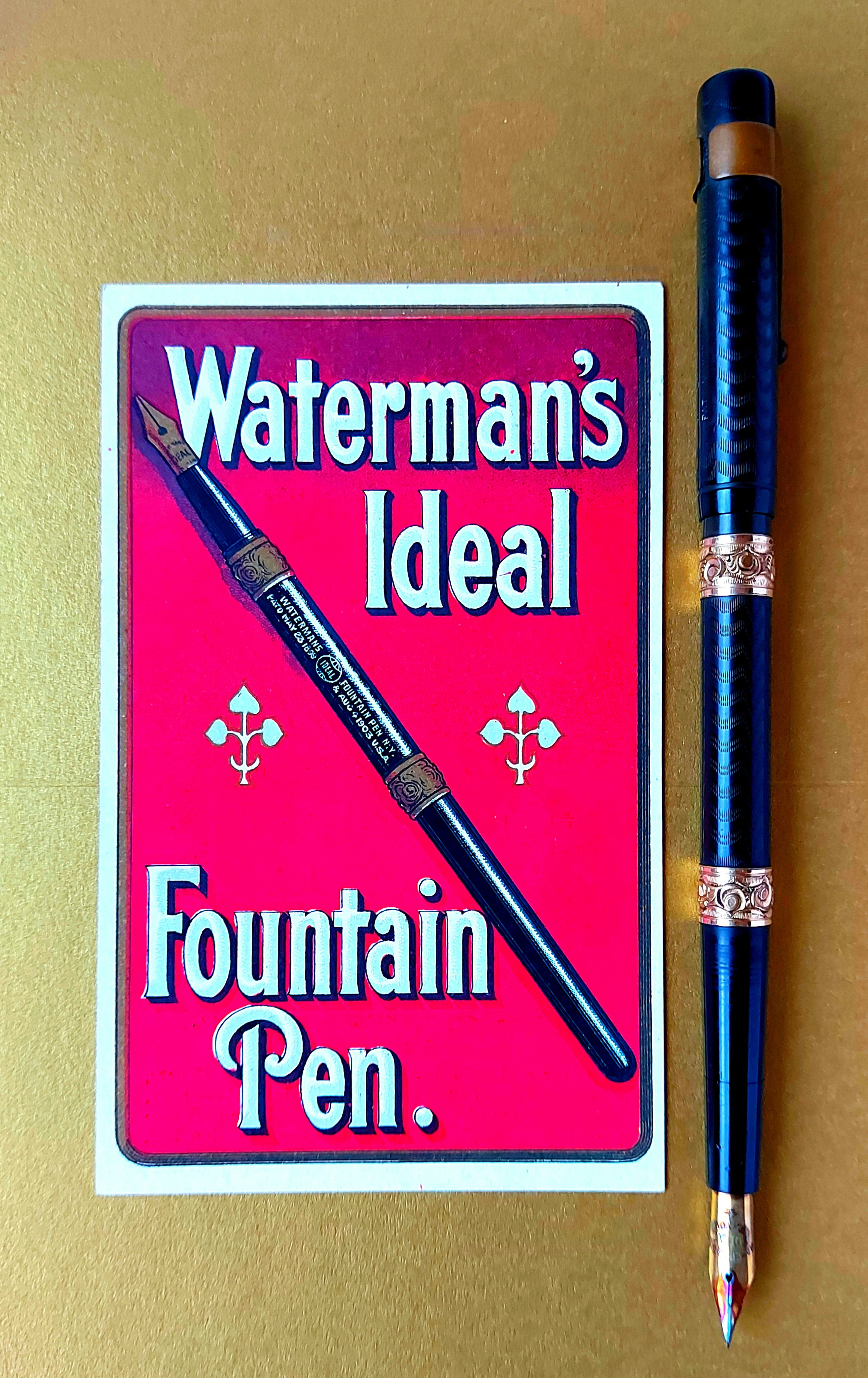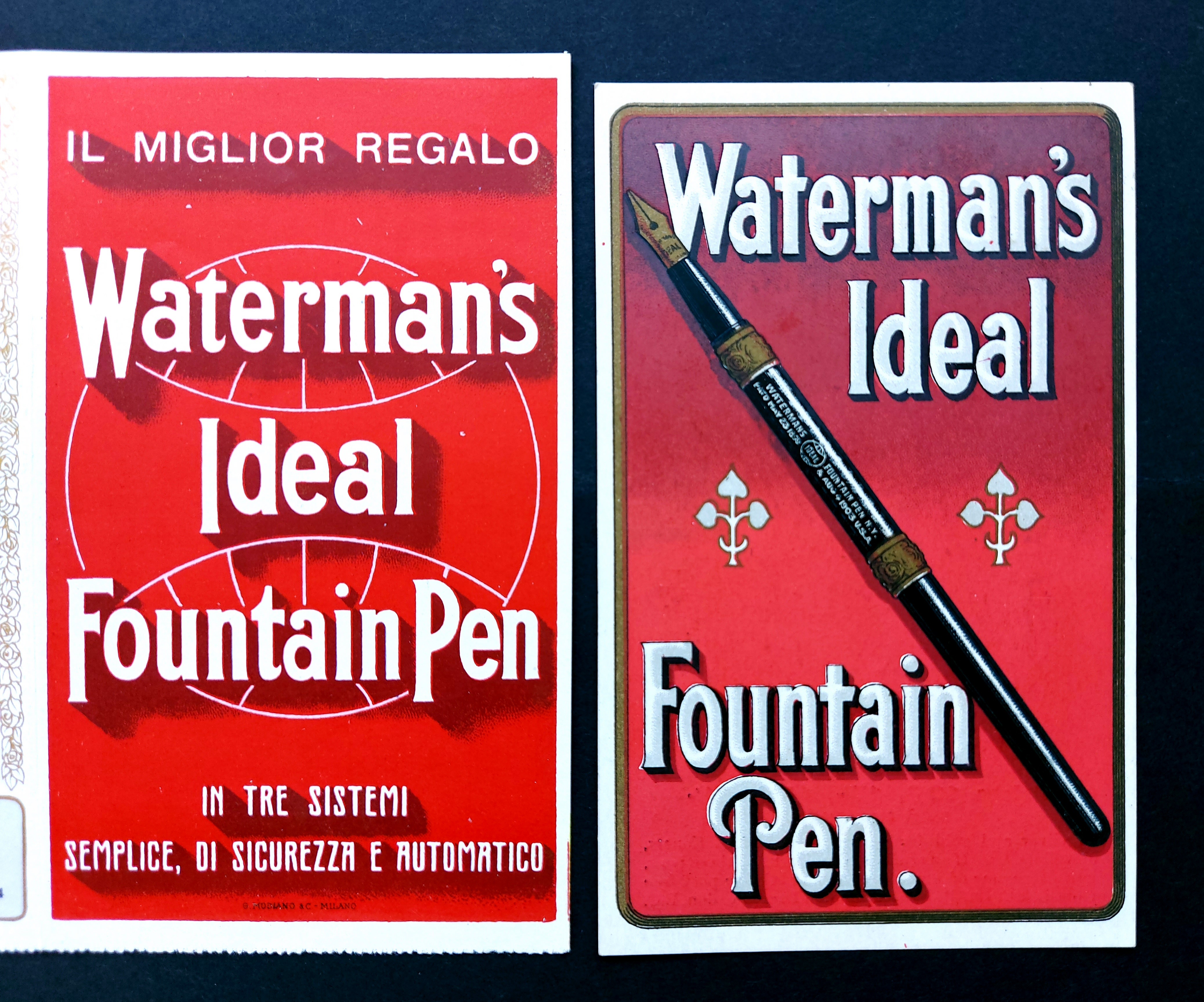 Raffigurate in inchiostro bluastro sul retro, le stilografiche (di cui ci vengono comunicati solo i prezzi) sono tutte con caricamento a contagocce (Eyedropper), “early models” per noi sul Wiki (https://www.fountainpen.it/Modelli_iniziali_Waterman). Confrontando i modelli “presenti” (e notando quelli “assenti” perché non ancora commercializzati, come le rientranti) e i prezzi riportati, daterei questa pubblicità intorno al 1908.