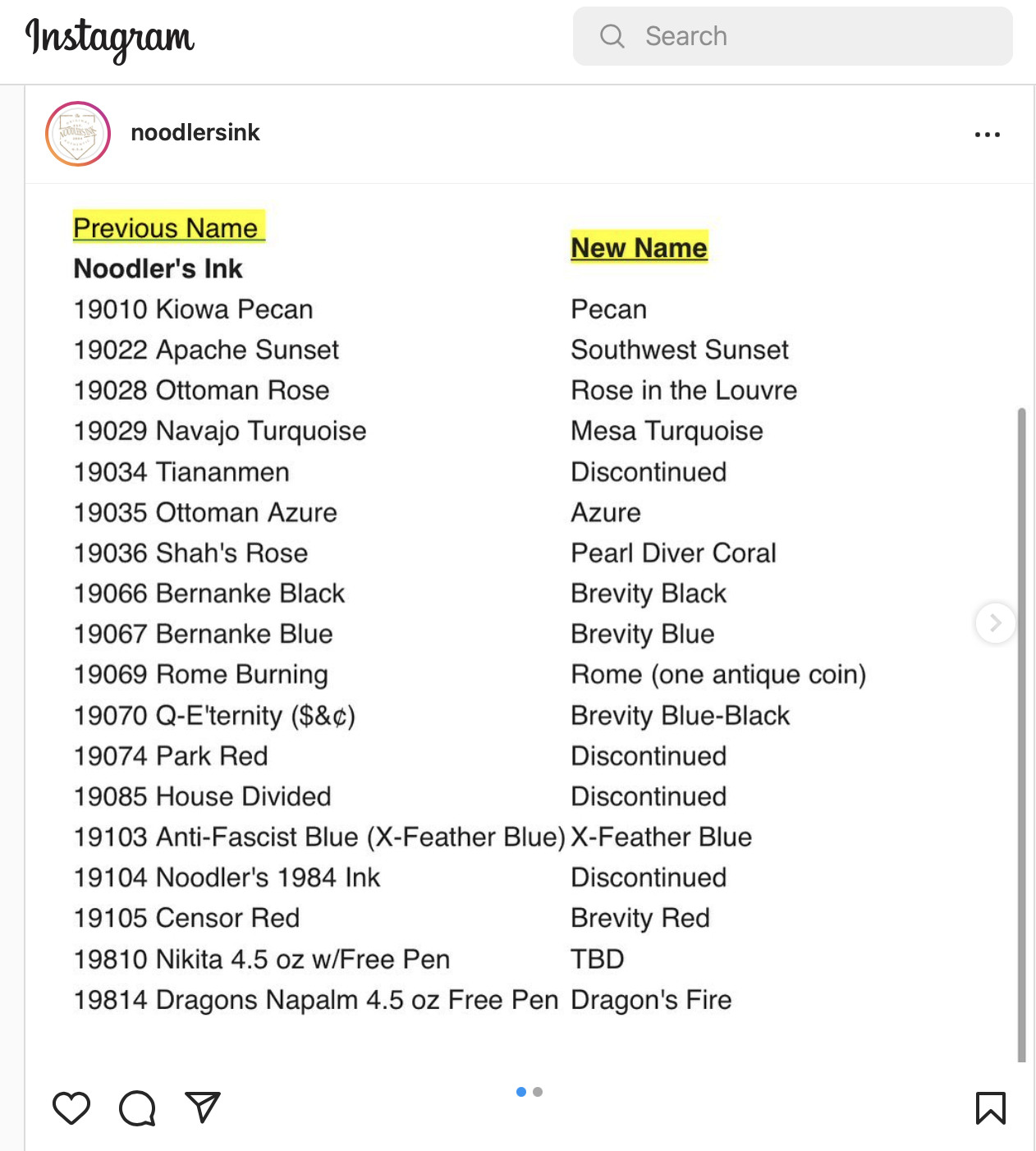 Noodler's ha comunicato ieri il cambio dei nomi di molti dei suoi inchiostri. Come si vede ha "normalizzato" qualsiasi nome che potesse anche solo minimamente turbare la sensibilità di qualcuno.