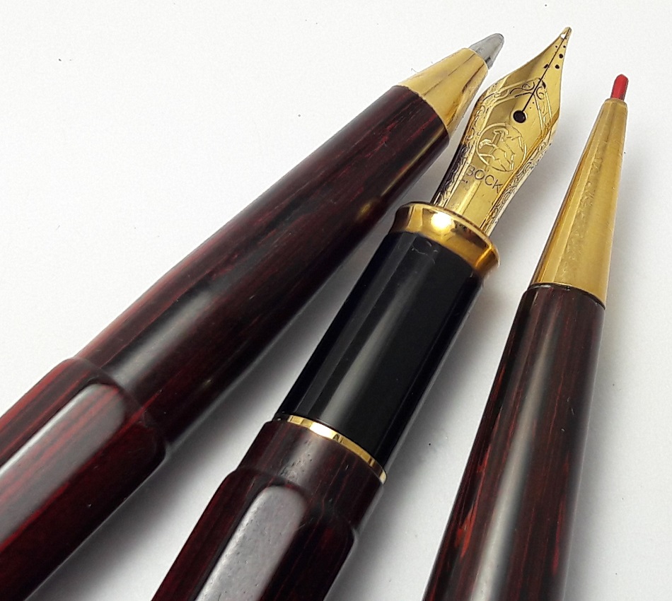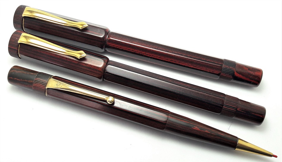 Gli strumenti di scrittura sono realizzati in ebanite marmorizzata rosso-marrone (increspatura rossa) e finiture placcate in oro. Corpo e cappuccio di forma ottagonale.