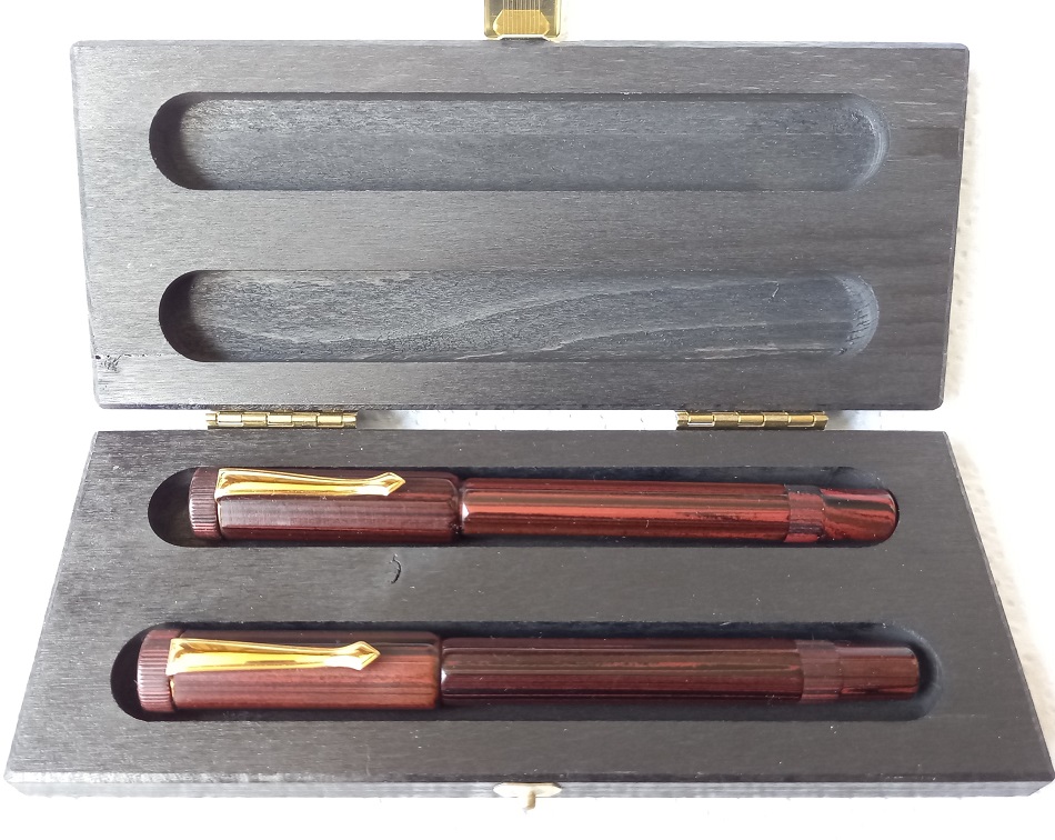 Il set di 2 che ho acquistato qualche anno fa consisteva in un astuccio di legno, la penna stilografica e il roller (rullo d'inchiostro).