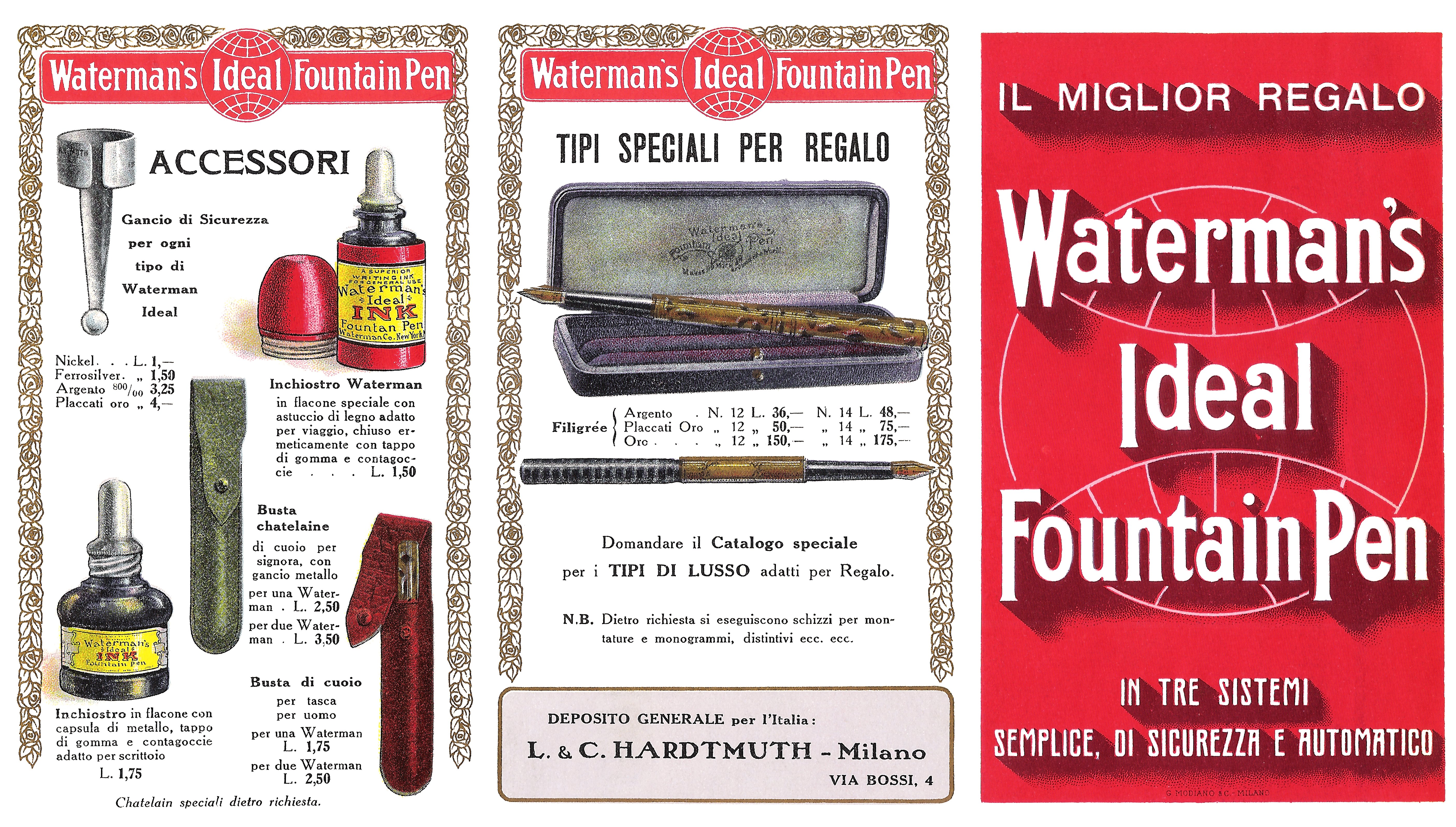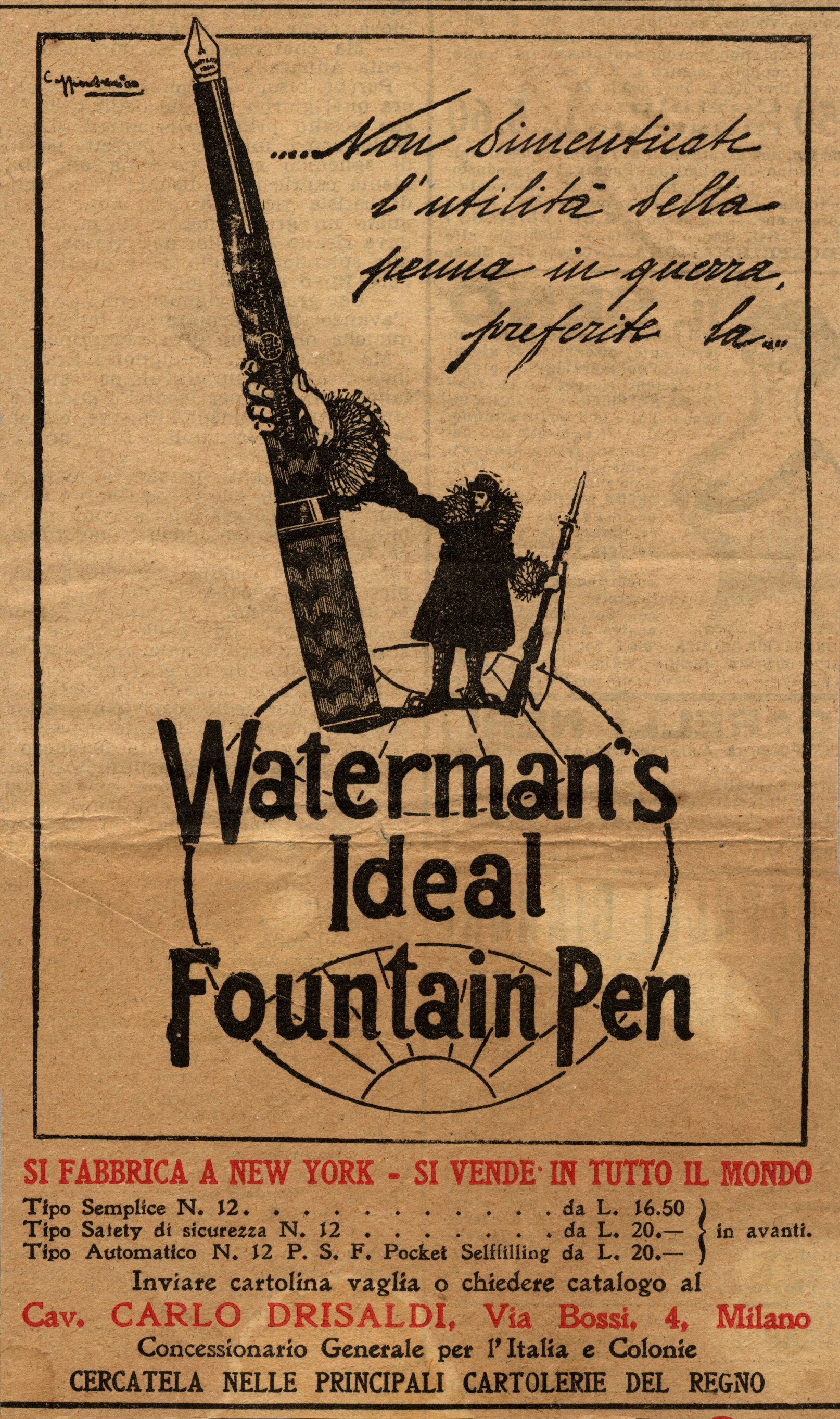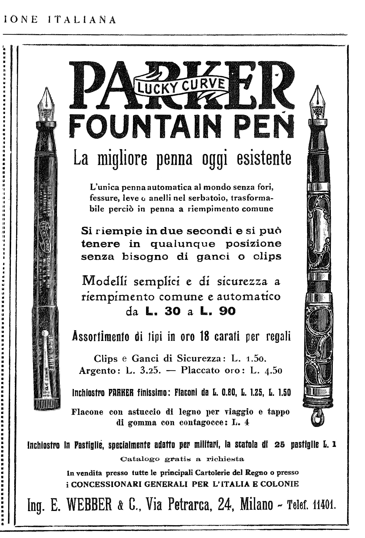 Concessionario Waterman 1912, Concessionario Parker 1918. Come si può osservare, tuttavia, trattandosi di nomi commerciali spesso depositati/protetti (Clip-Cap e Washer-clip) era facile che penetrassero immutati nelle altre lingue (fianco a fianco, in attesa che la Lingua operasse la selezione) come i sistemi di caricamento, cosa per me ideale: Si crearono, tuttavia, anche degli orrendi ibridi