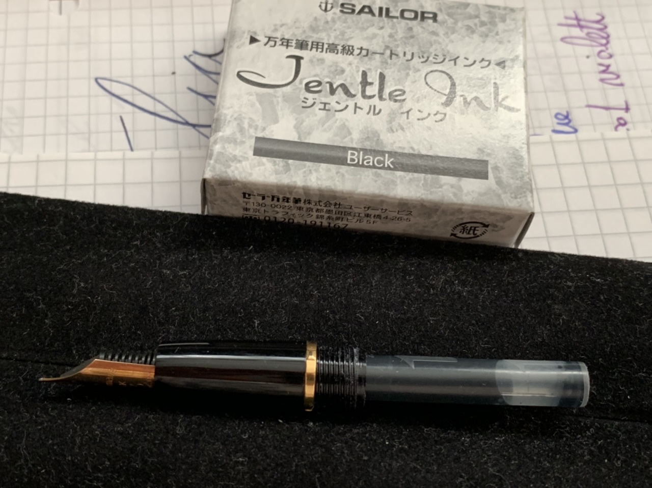 Dopo una breve lavaggio durante il quale la penna NON ha rlasciato inchiostro (è la seconda volta che mi capita con una penna usata) ho provato a innestare una cartuccia waterman lunga per provare a vedere se scrive....