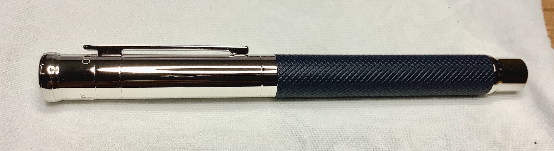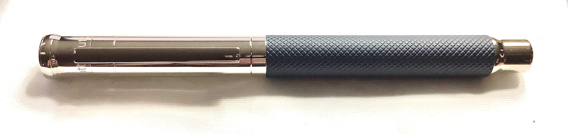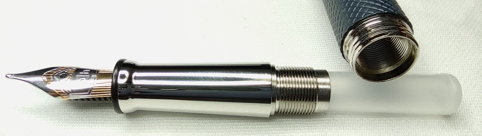 Per il pennino in acciaio bicolore (forse Bock ?) sono disponibili i tratti extra fine, fine, medio e broad. Per il prezzaccio al quale sono riuscito a portare a casa la penna, era disponibile solo il tratto broad, che risulta essere con linea di dimensioni comunque modeste ed utilizzabile , e con punta di ottima scorrevolezza senza però dare la sensazione di scivolare sul ghiaccio.