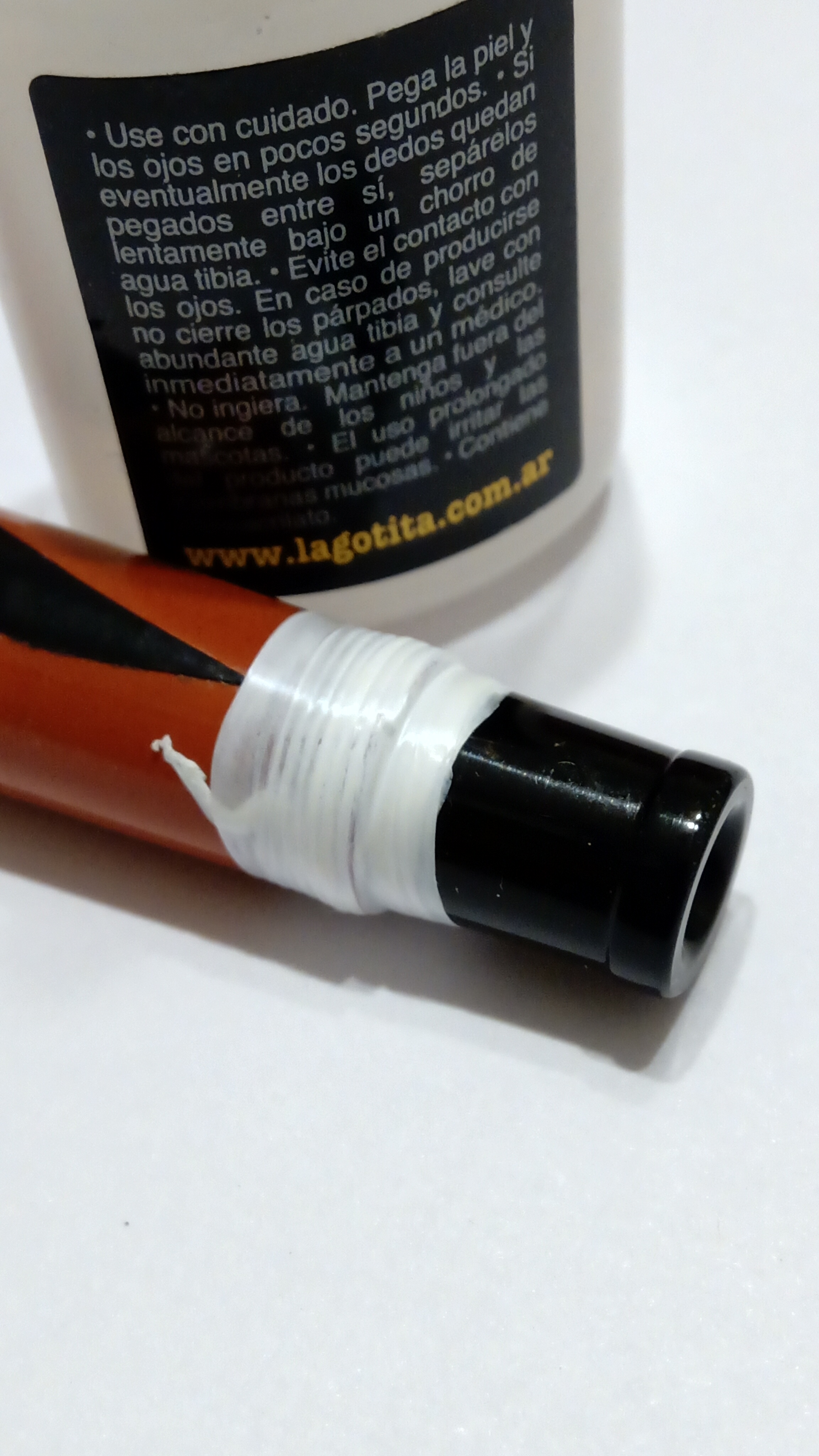 In order not to lose and respect these threads, in the case of the internal thread, I used the thread of the same grip as an internal mold, carefully protected with Teflon tape, which after gently placing a drop of cyanoacrylate on the internal threaded part of the barrel, I quickly screwed on the grip...