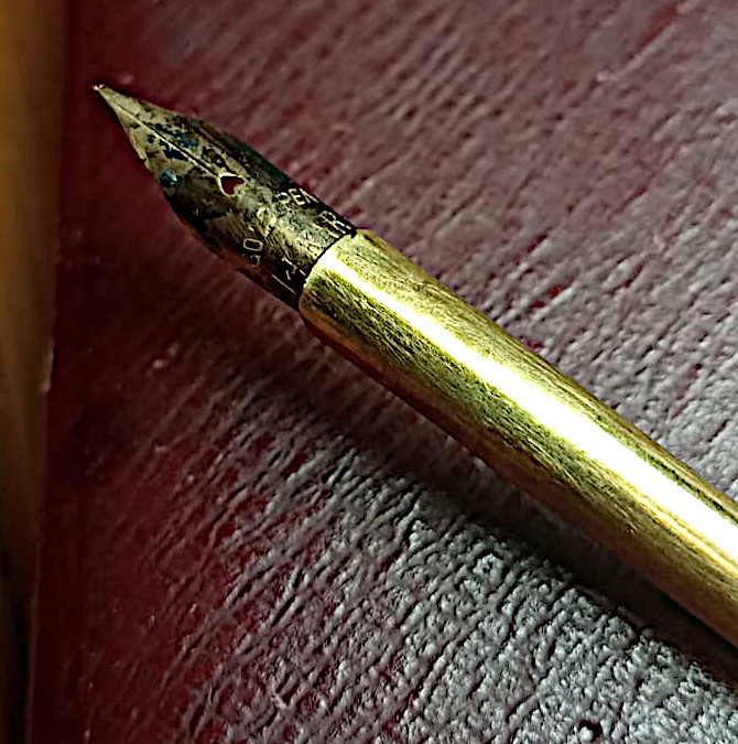 Si tratta di una penna con calamo in oro 18K e pennino d'oro 14K (reca incisa la scritta GOLD PEN 14 KAR)