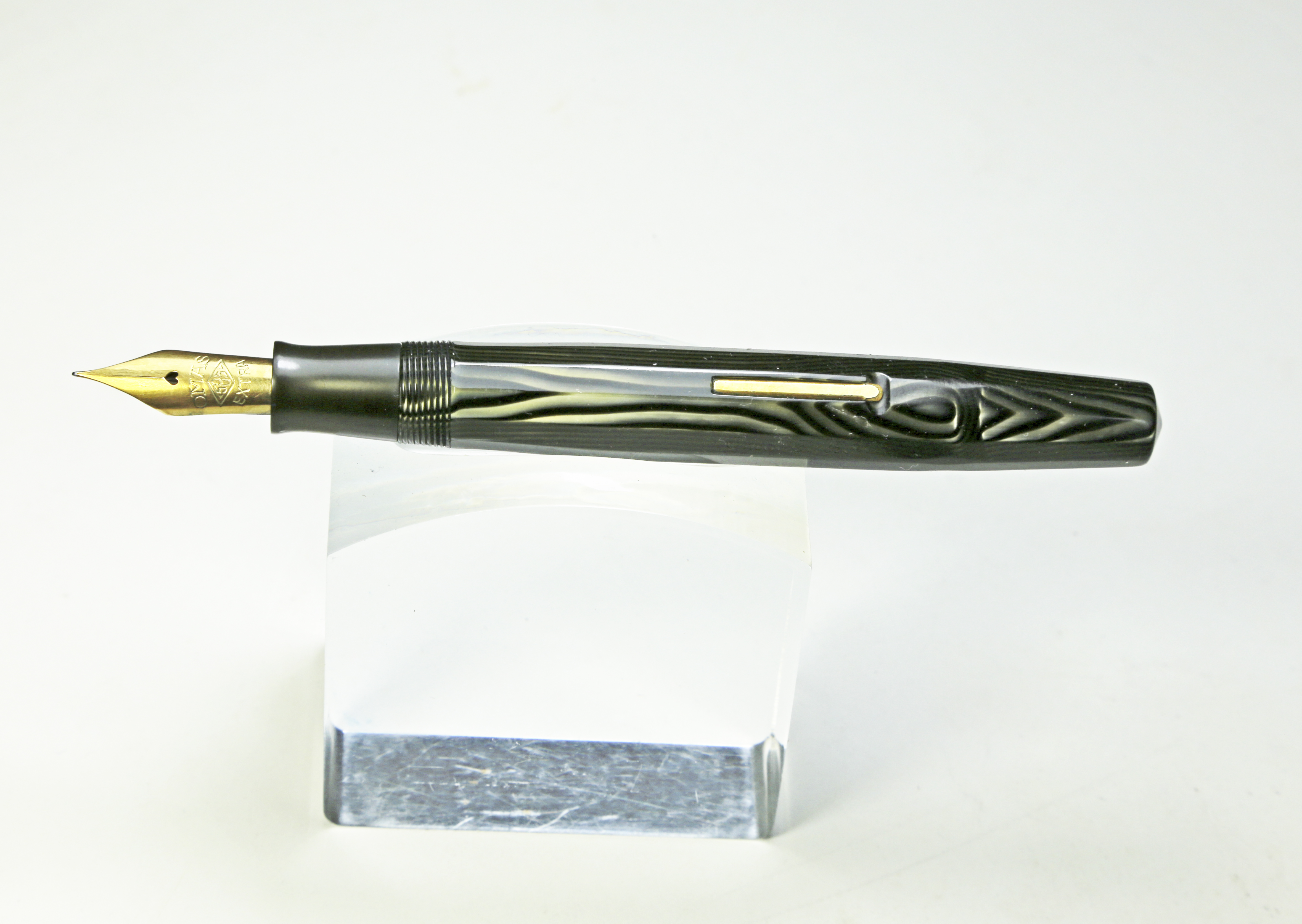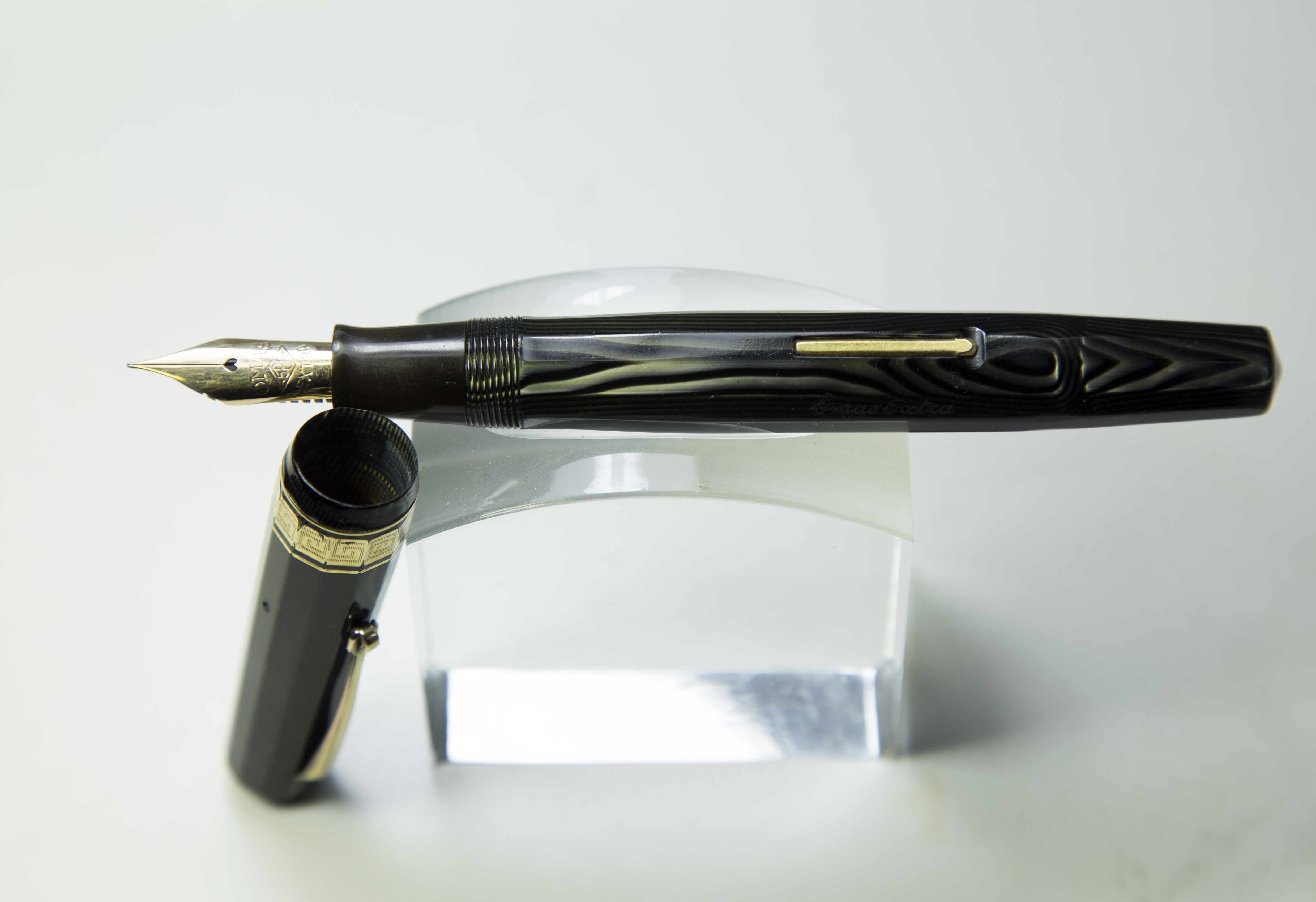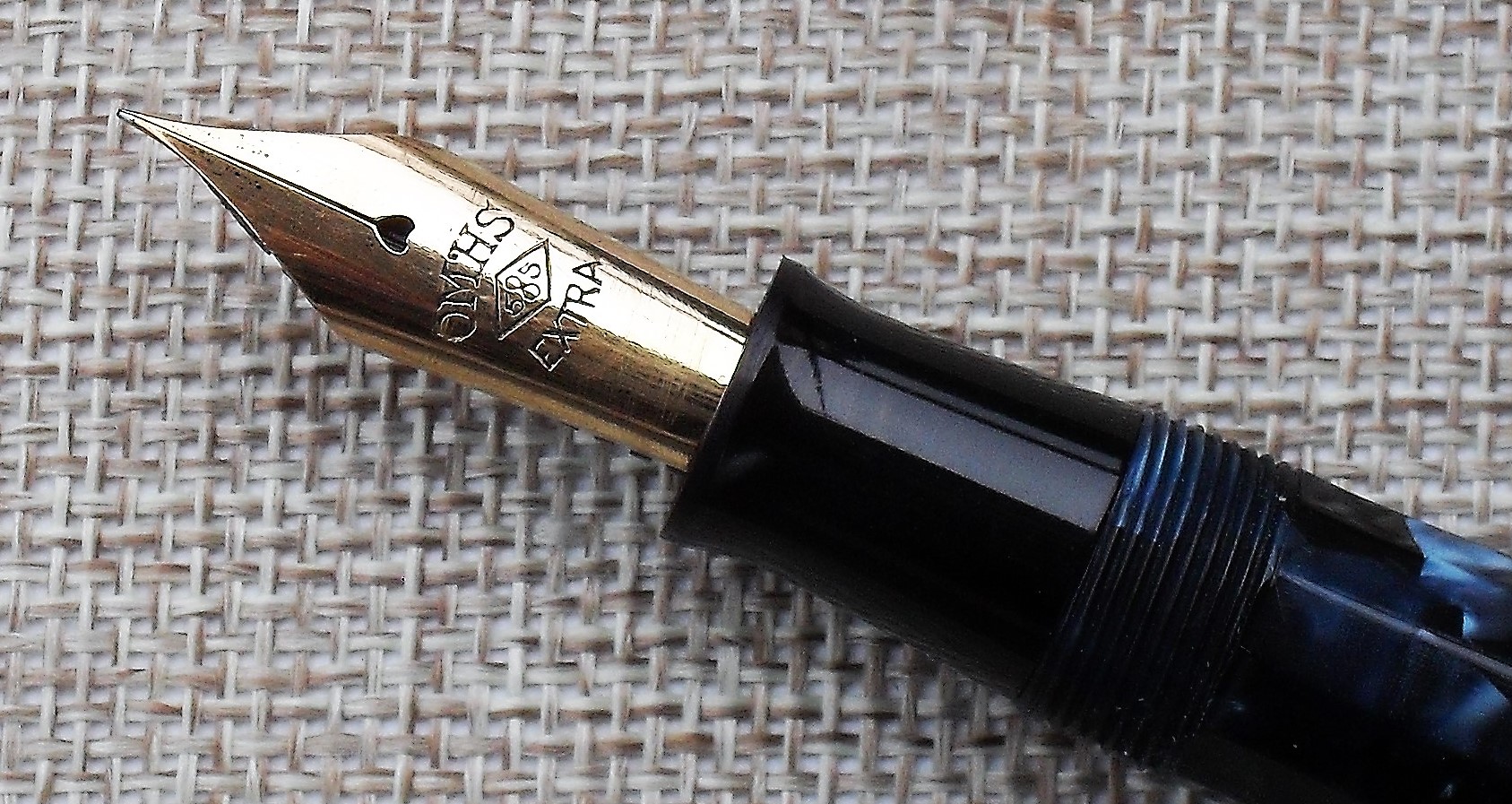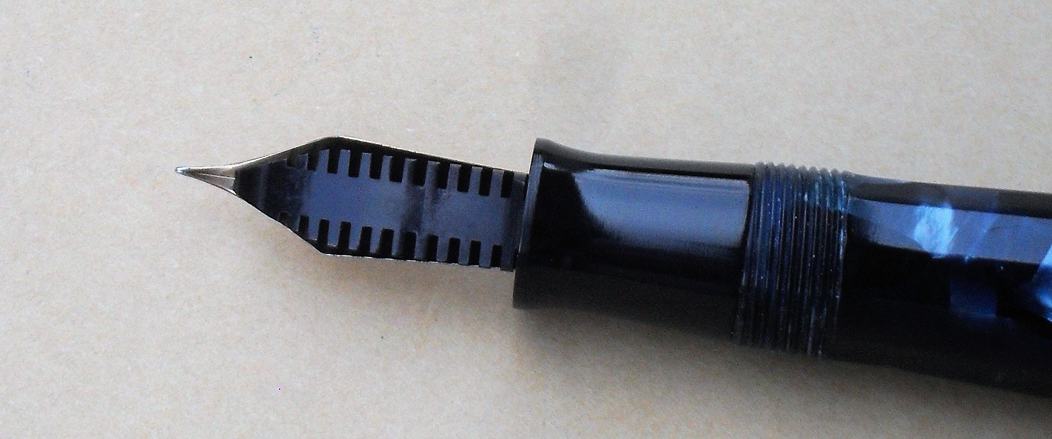 Il pennino, da sempre il cuore d’una stilografica, è grande e dotato d’una certa flessibilità. La punta fine consente una piacevole variazione di tratto, con un uso giudizioso della pressione. Non sono ancora in grado d’ottenere risultati brillanti, ma credo che imparerò. Ottima davvero la scrittura: flusso generoso ma molto ben controllato dal grande alimentatore in ebanite, mai un’incertezza d’alcun tipo, partenza sempre prontissima. Un autentico piacere, anche perché la scorrevolezza, che c’è tutta, non rende il pennino “burroso”, ma consente un ottimo controllo.