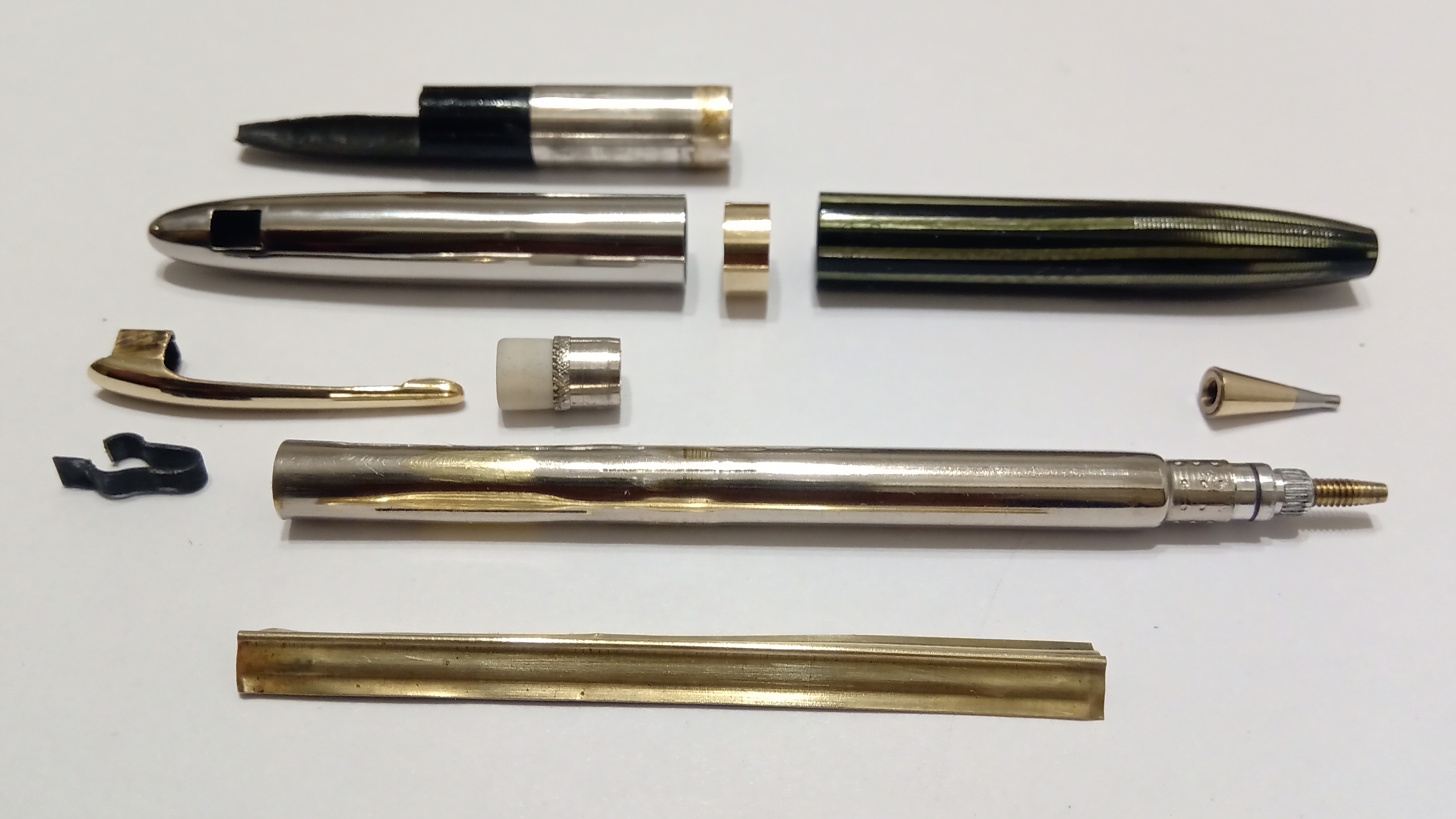 Nel caso del portamine, devi solo procurarti un portagomma e tagliare un pezzo di gomma a forma di fusto, che sarà molto buono, posizionare il foglio di ottone separatore che funge da deposito, inserire il meccanismo all'interno la canna e fissarla con la punta filettata,