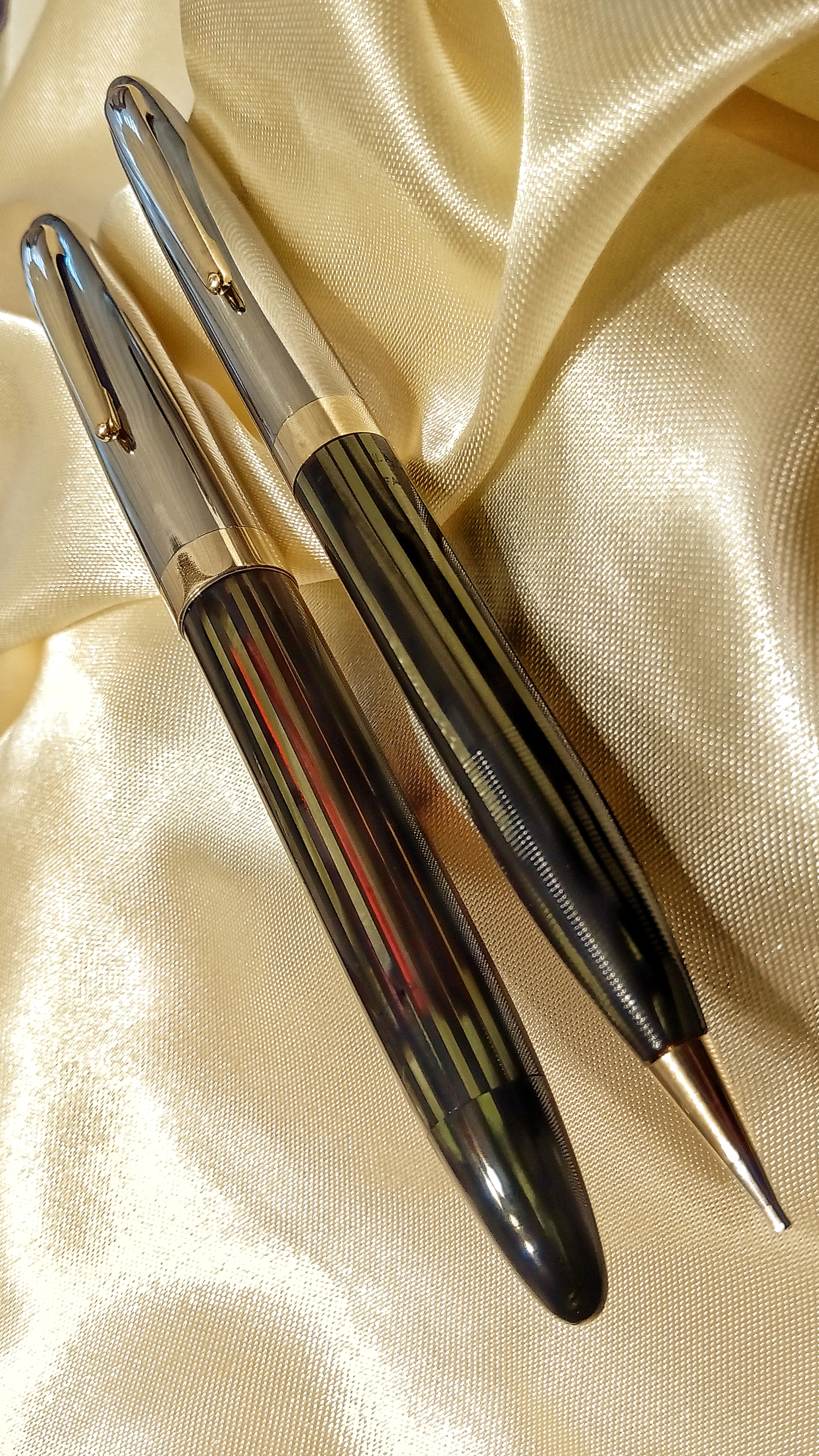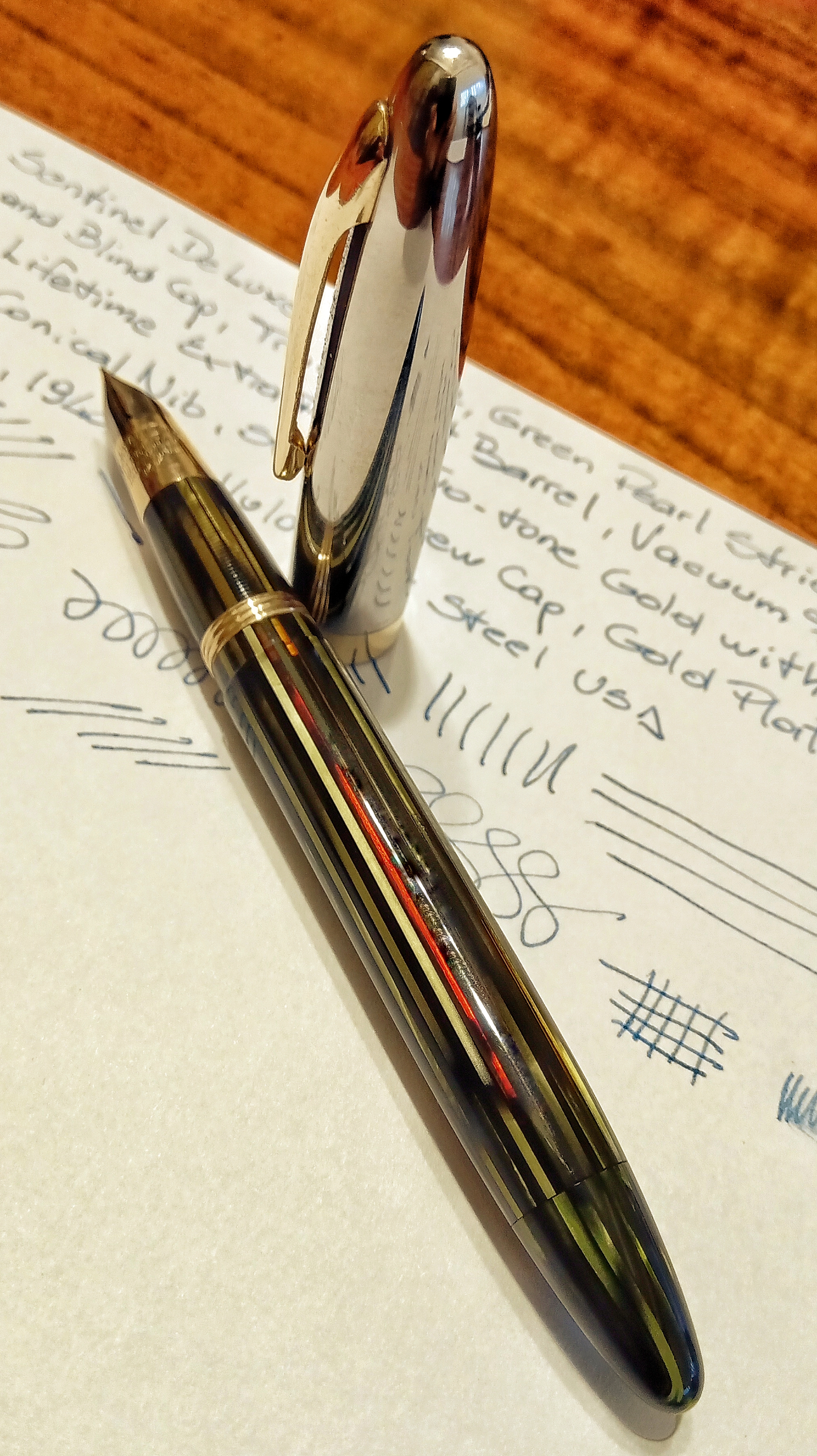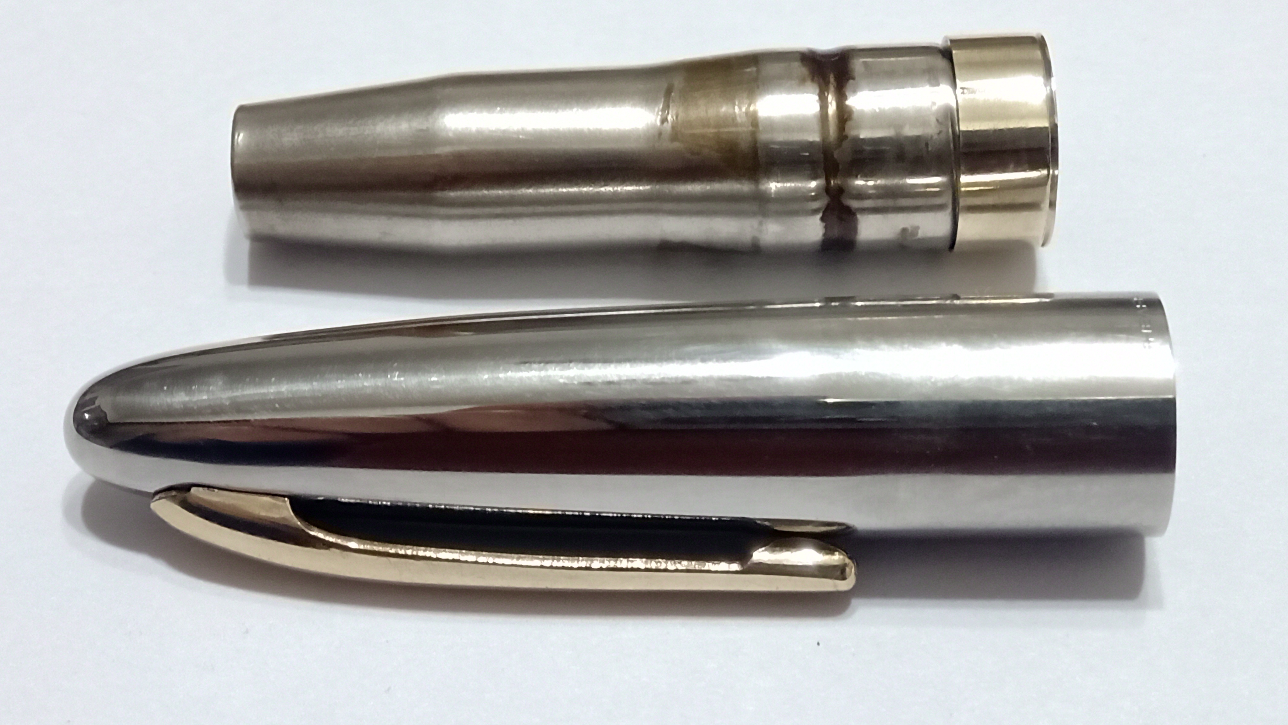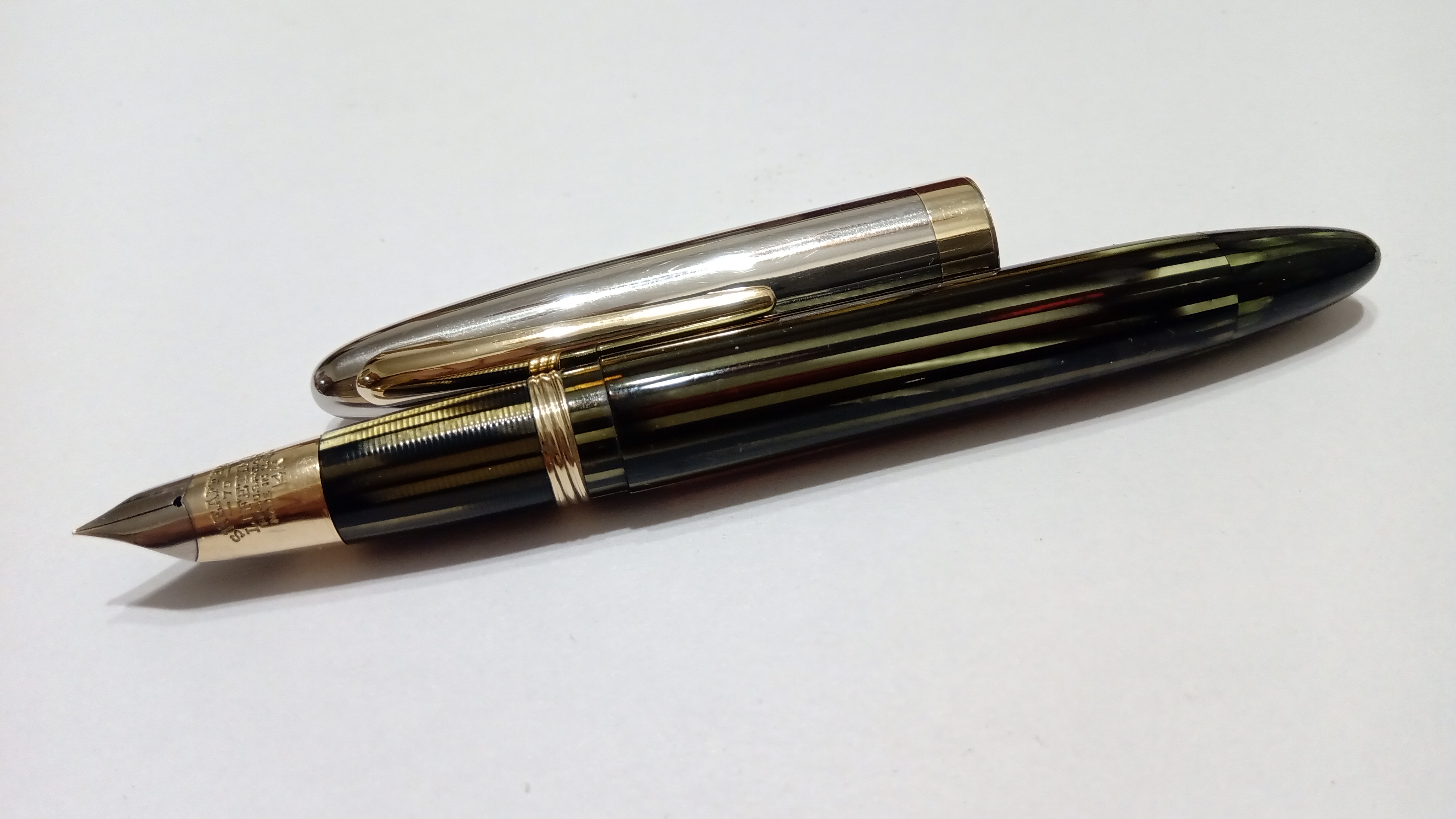 Il set in questione era una Sheaffer's Sentinel Deluxe, Lifetime, riempimento sottovuoto, con cappucci in acciaio inossidabile e fascia e clip dorate, con corpi in celluloide laminata con nervature verde perla, e soprattutto il corpo della stilografica Era traslucido, qualcosa di impossibile da percepire per lo sporco con cui è stato ritrovato.