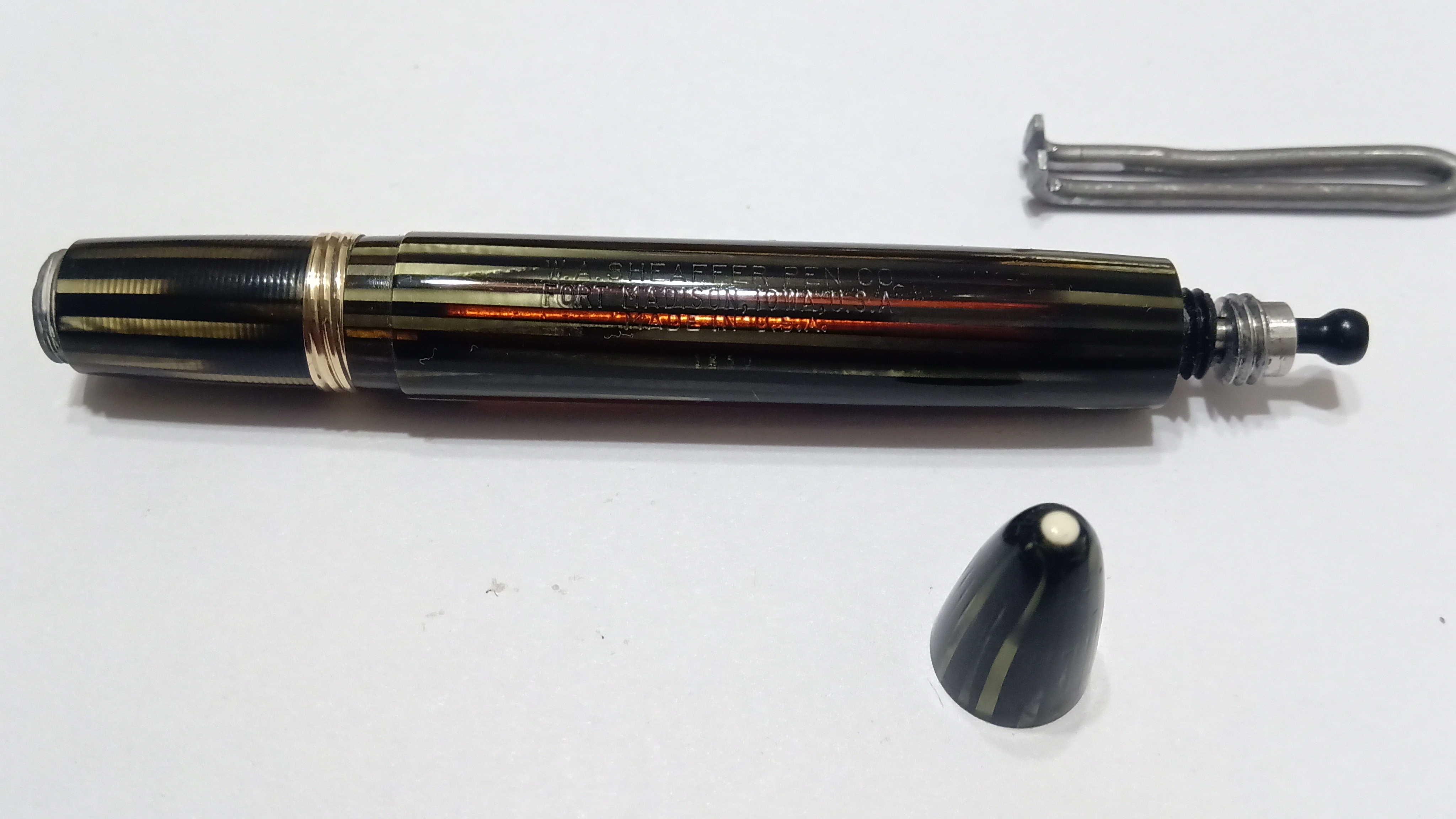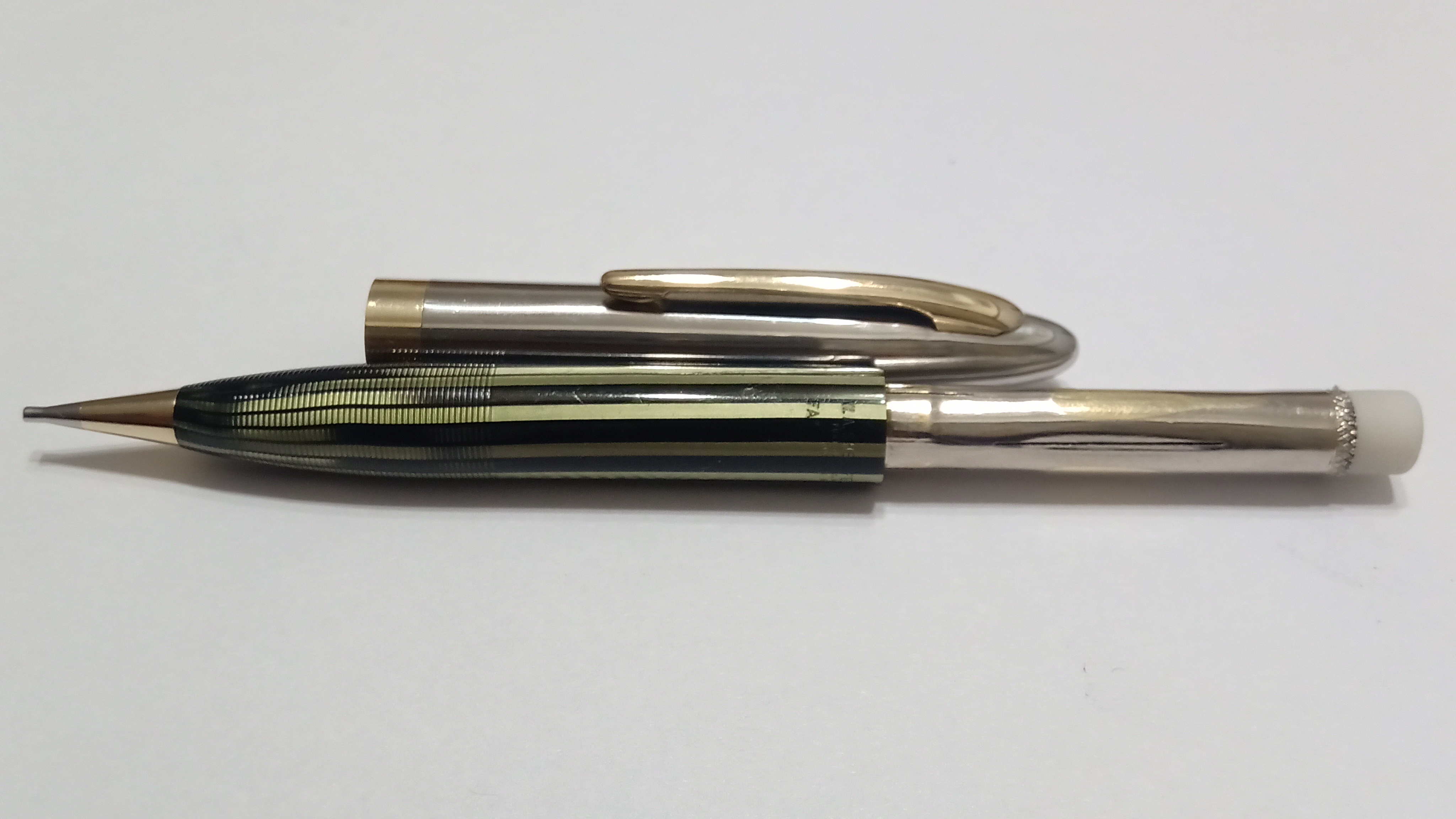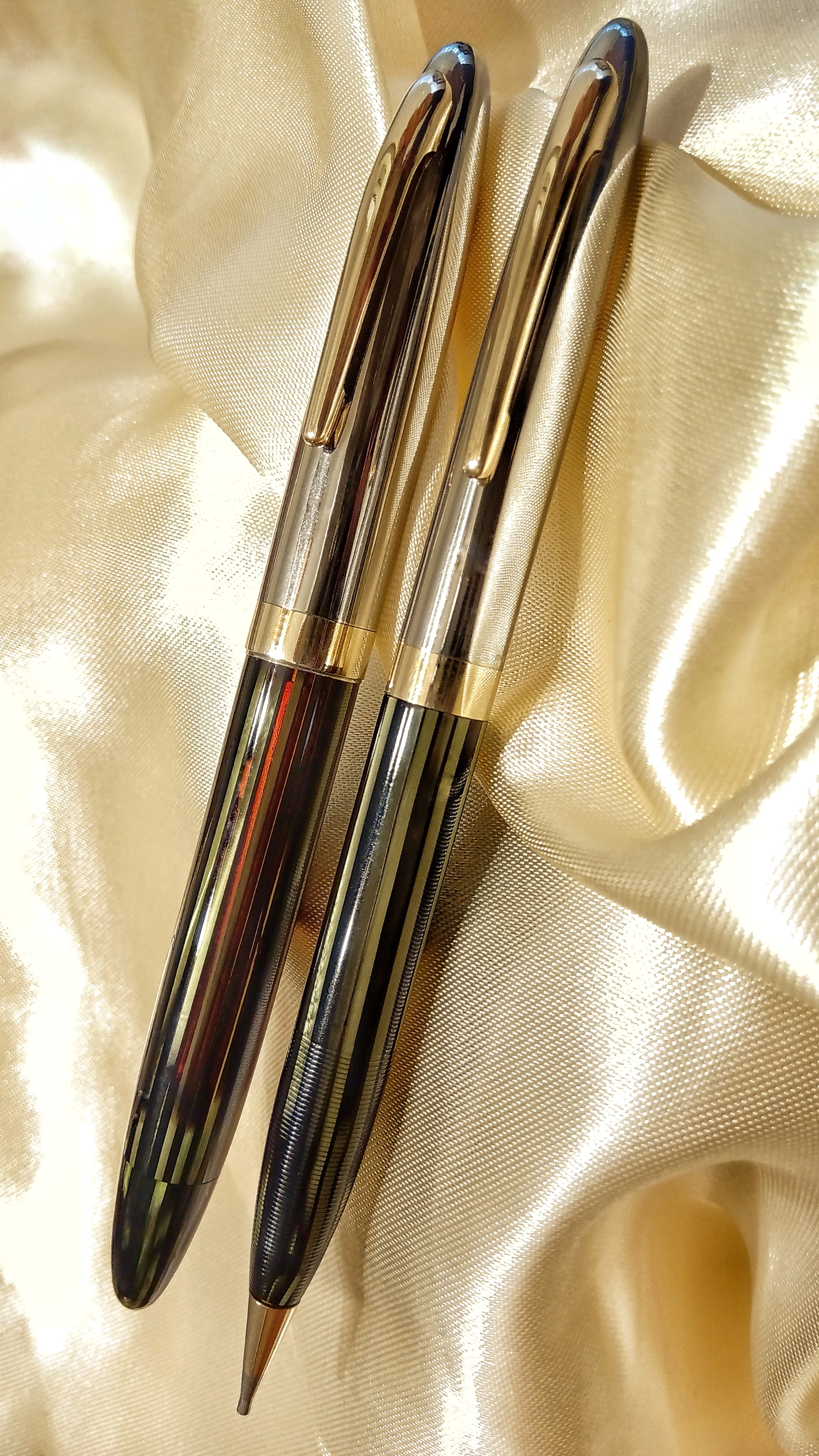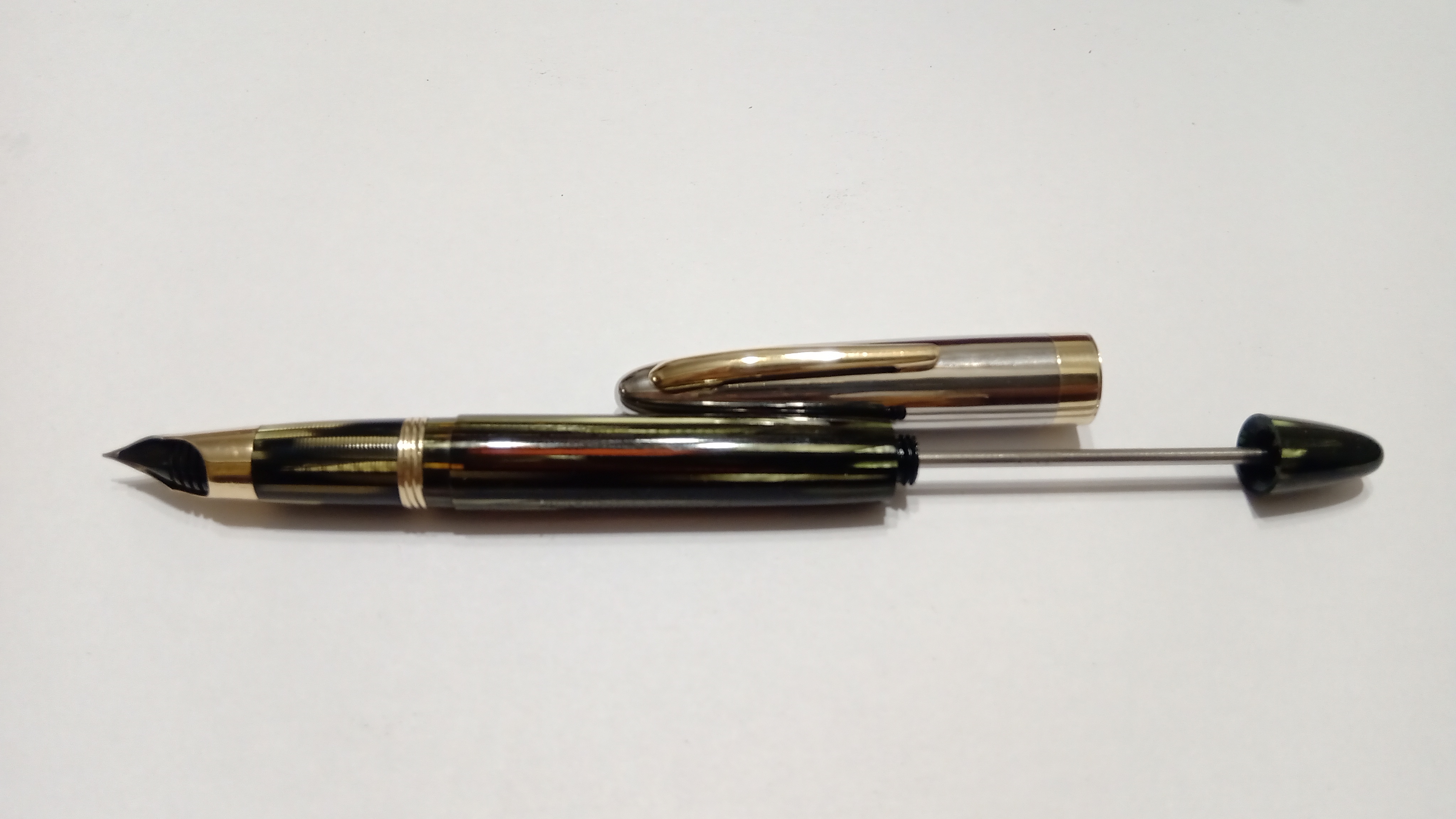 Il set in questione era una Sheaffer's Sentinel Deluxe, Lifetime, riempimento sottovuoto, con cappucci in acciaio inossidabile e fascia e clip dorate, con corpi in celluloide laminata con nervature verde perla, e soprattutto il corpo della stilografica Era traslucido, qualcosa di impossibile da percepire per lo sporco con cui è stato ritrovato.