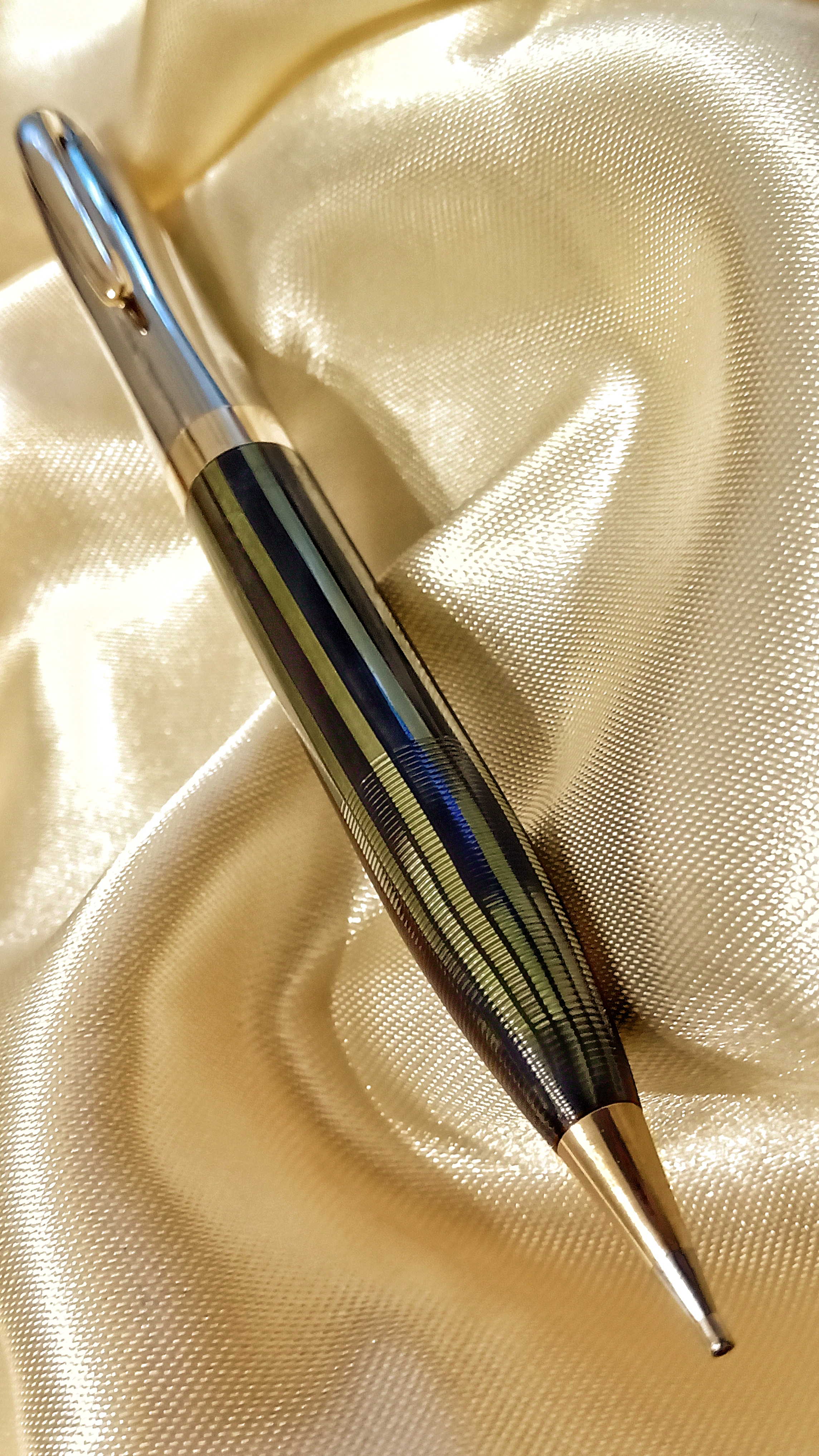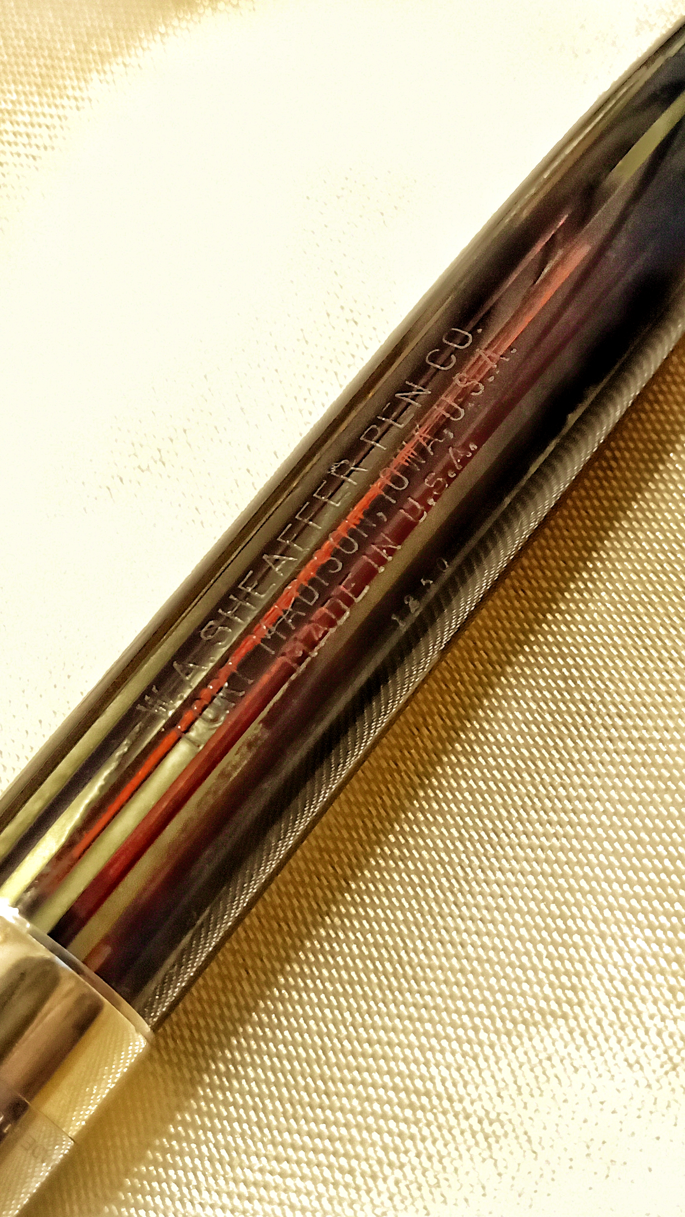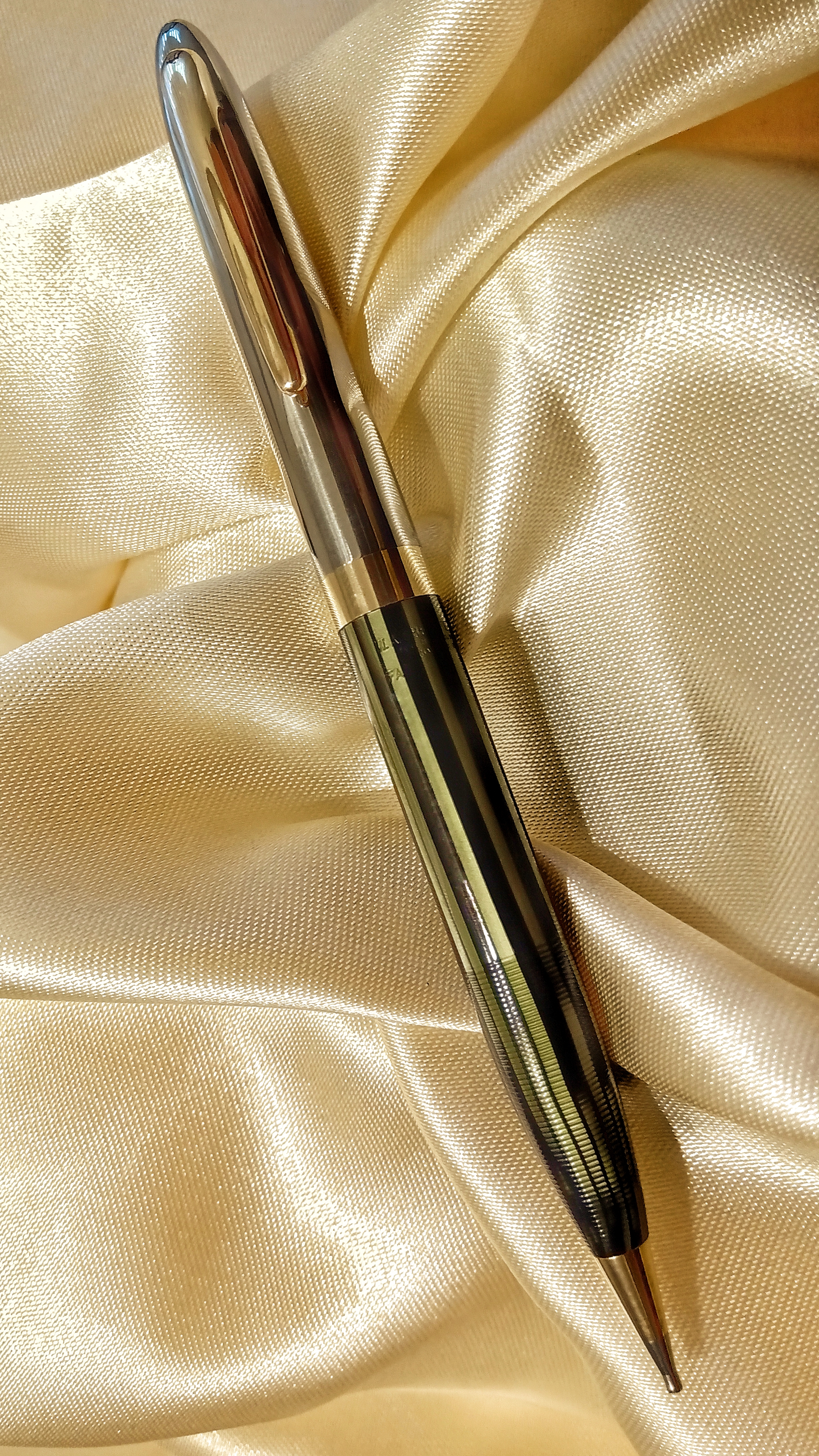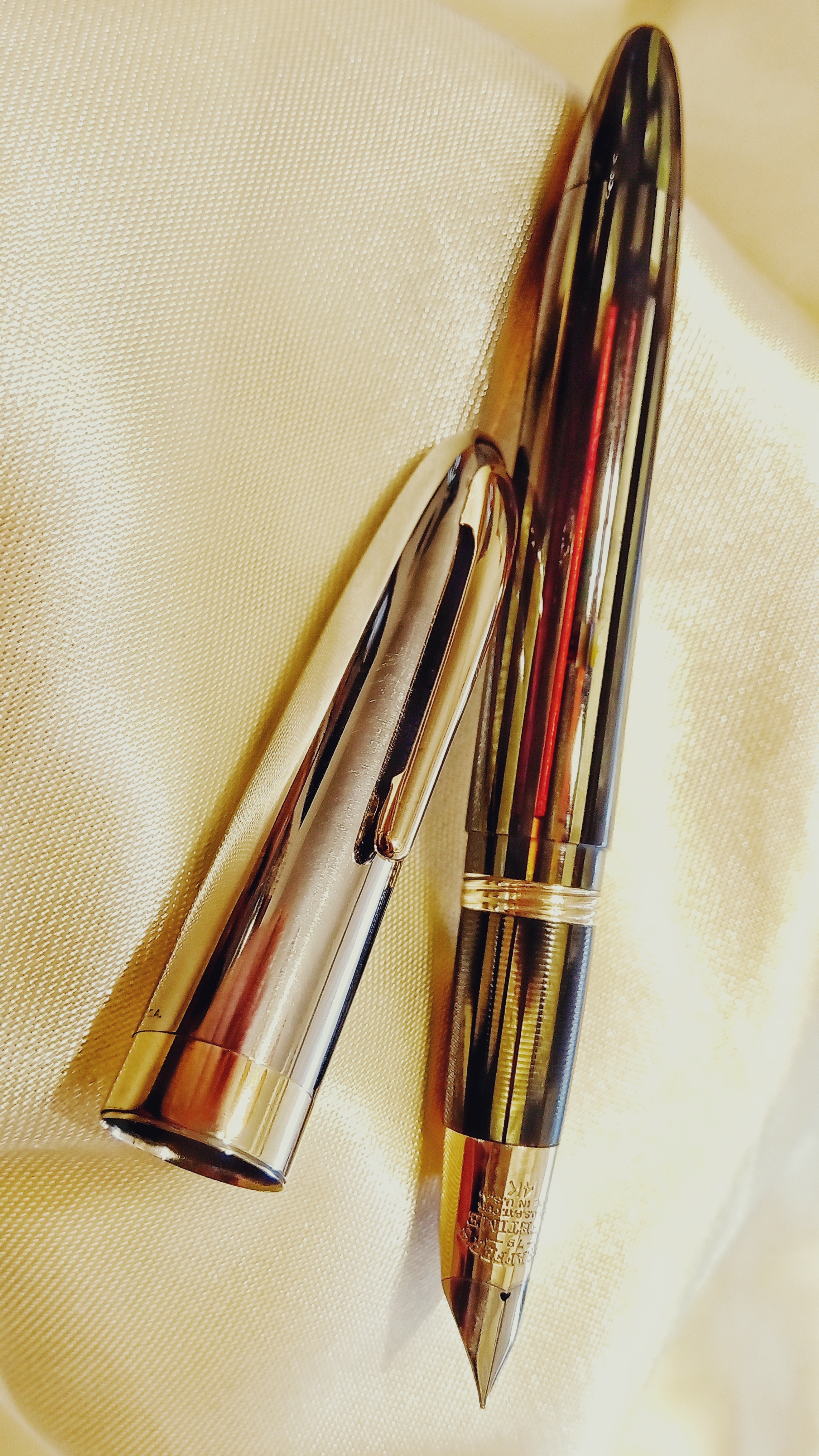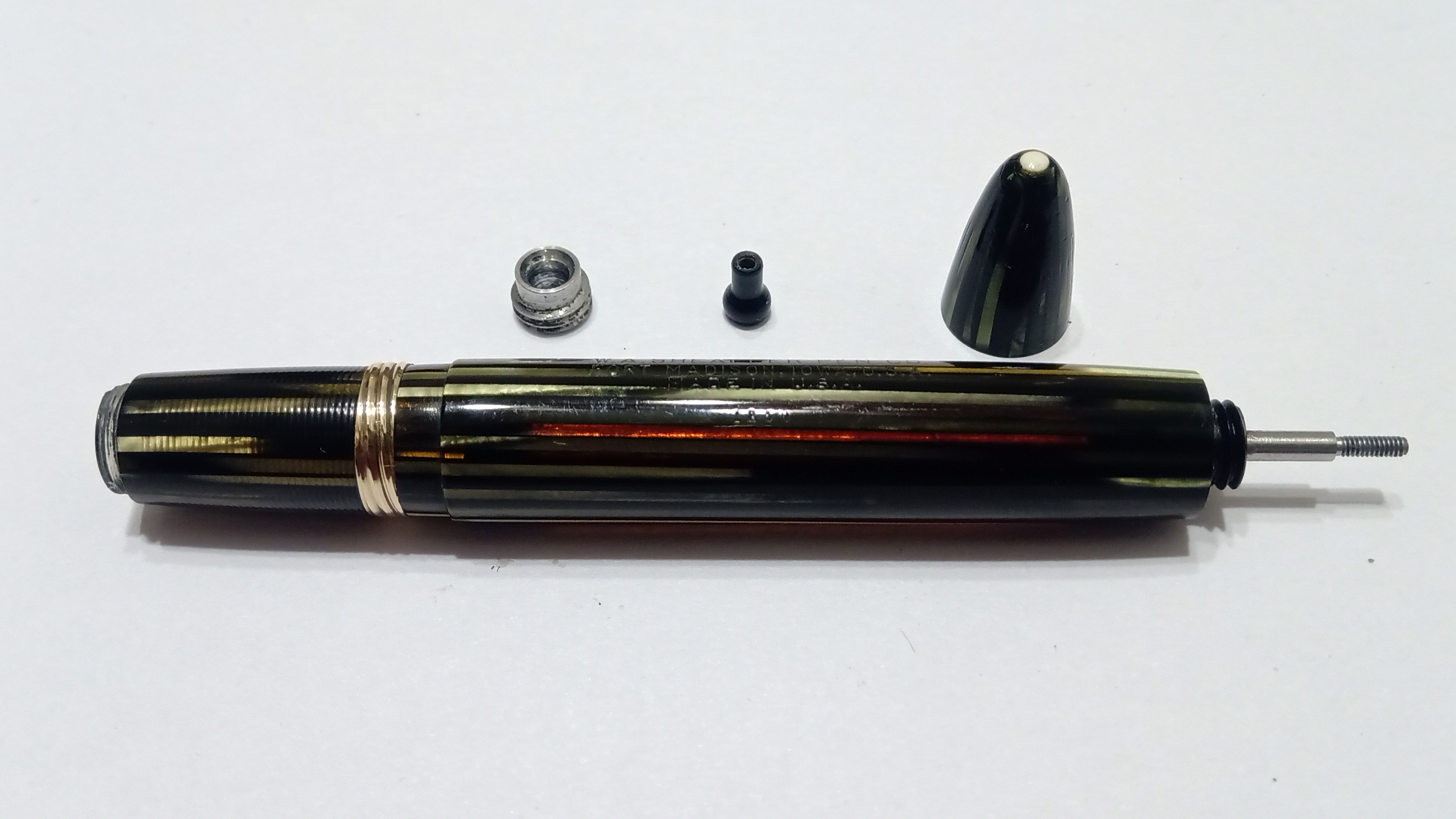 Il set in questione era una Sheaffer's Sentinel Deluxe, Lifetime, riempimento sottovuoto, con cappucci in acciaio inossidabile e fascia e clip dorate, con corpi in celluloide laminata con nervature verde perla, e soprattutto il corpo della stilografica Era traslucido, qualcosa di impossibile da percepire per lo sporco con cui è stato ritrovato.