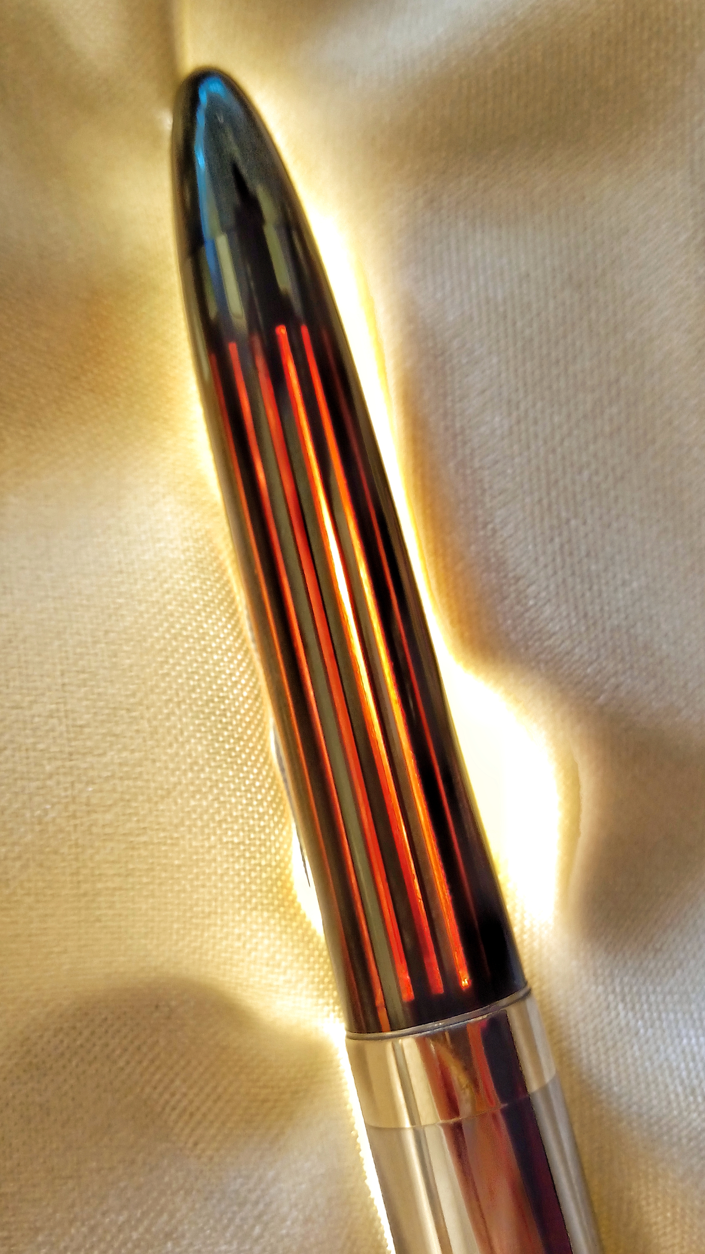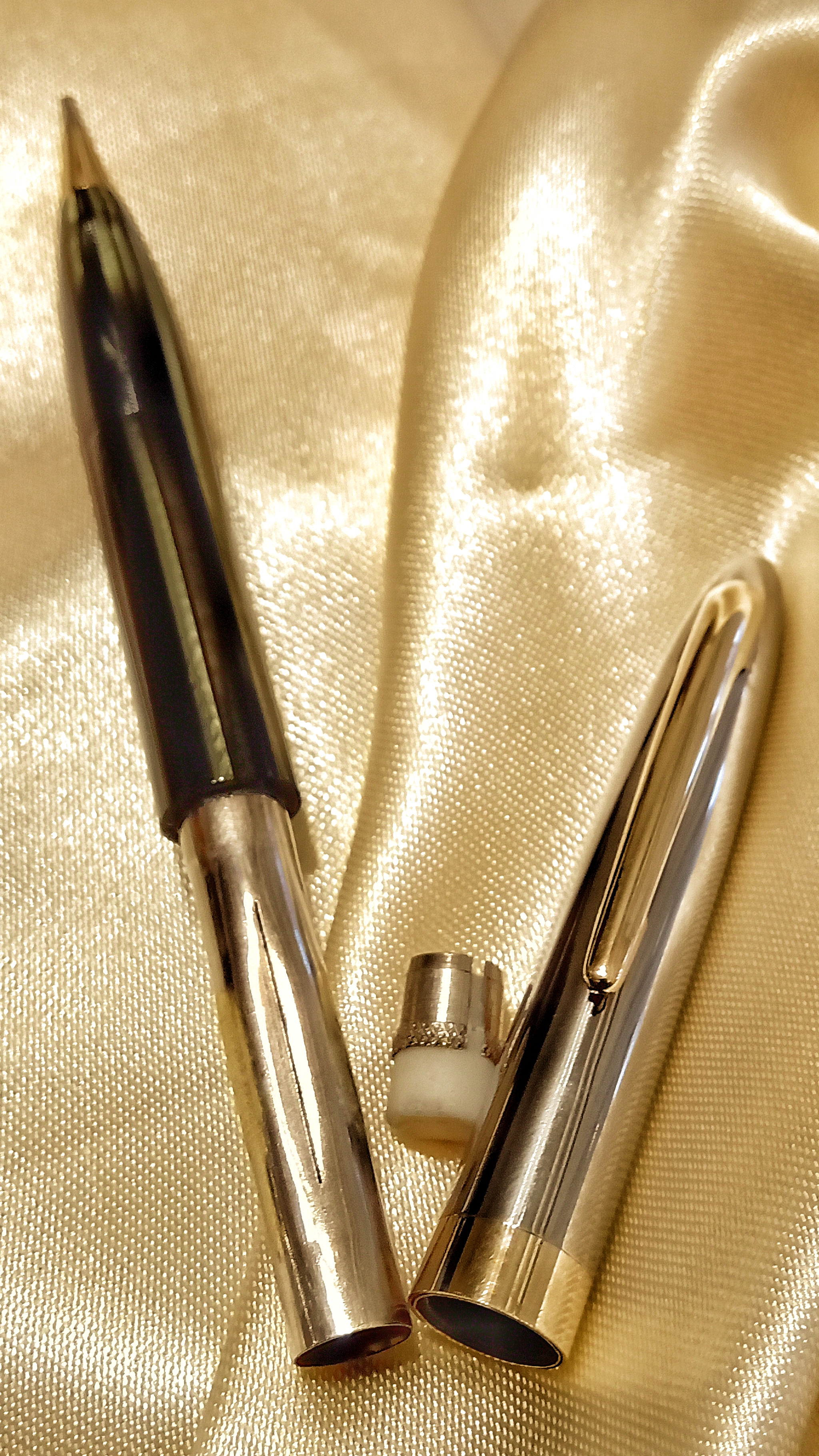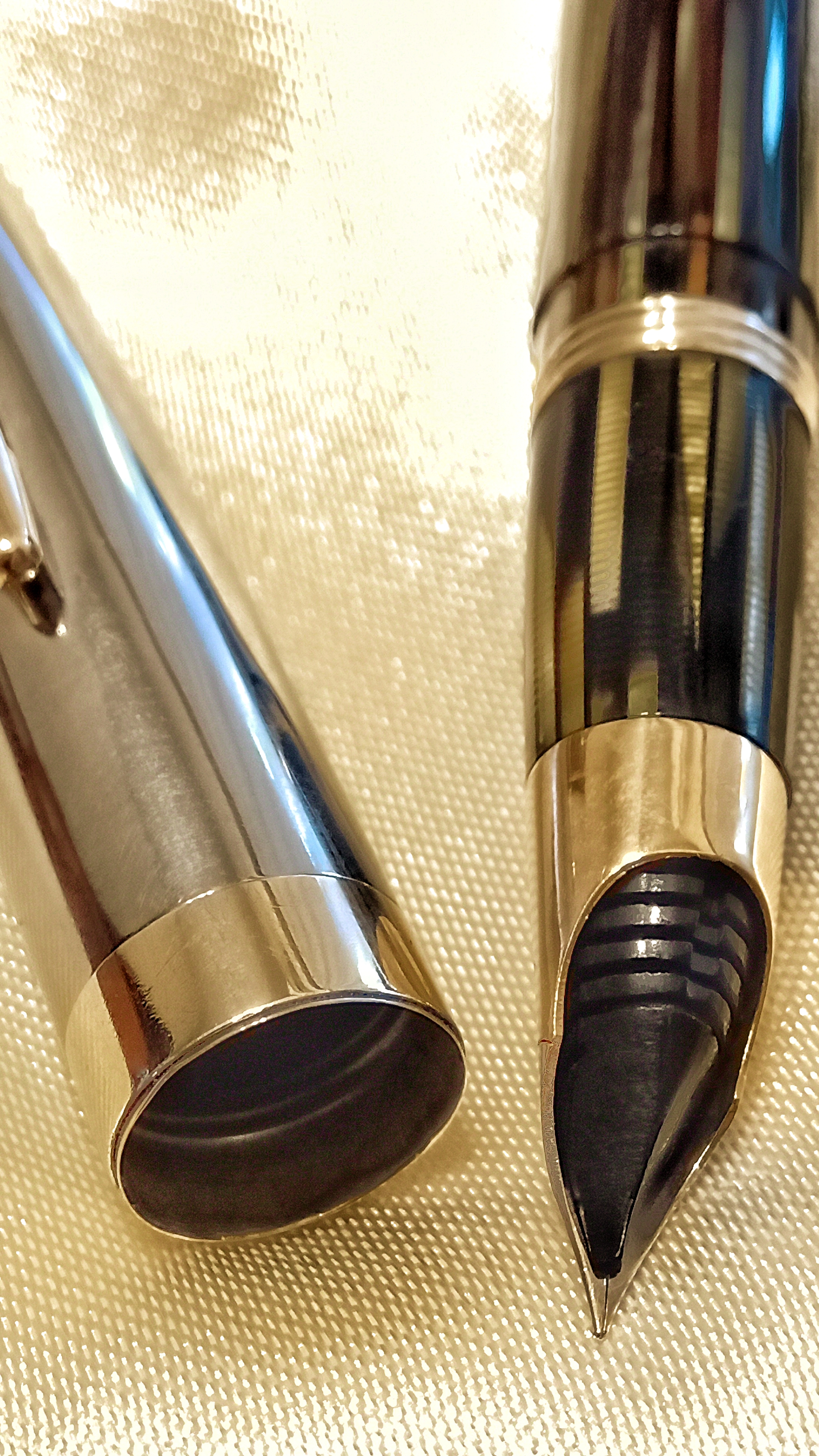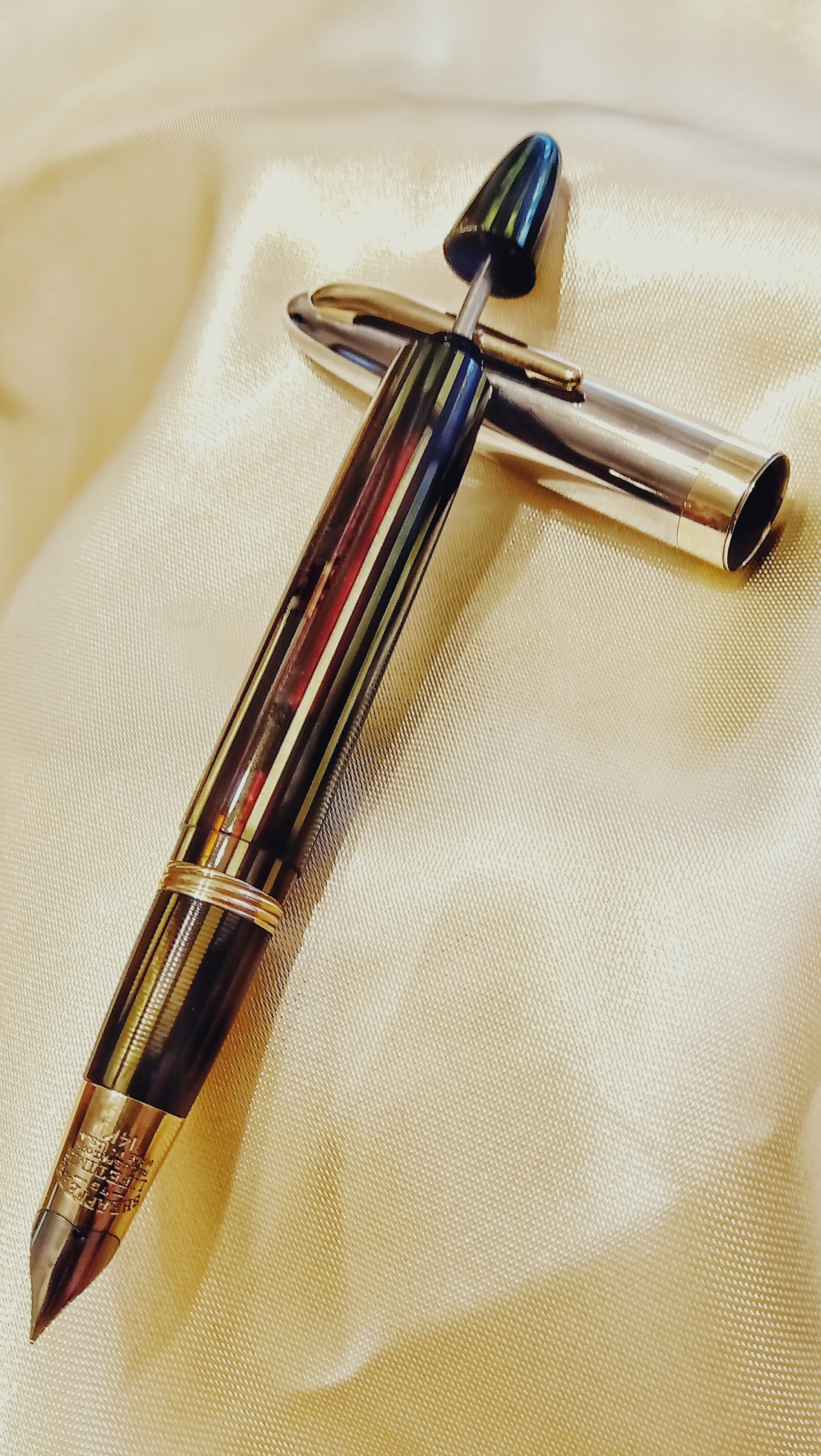 Il set in questione era una Sheaffer's Sentinel Deluxe, Lifetime, riempimento sottovuoto, con cappucci in acciaio inossidabile e fascia e clip dorate, con corpi in celluloide laminata con nervature verde perla, e soprattutto il corpo della stilografica Era traslucido, qualcosa di impossibile da percepire per lo sporco con cui è stato ritrovato.