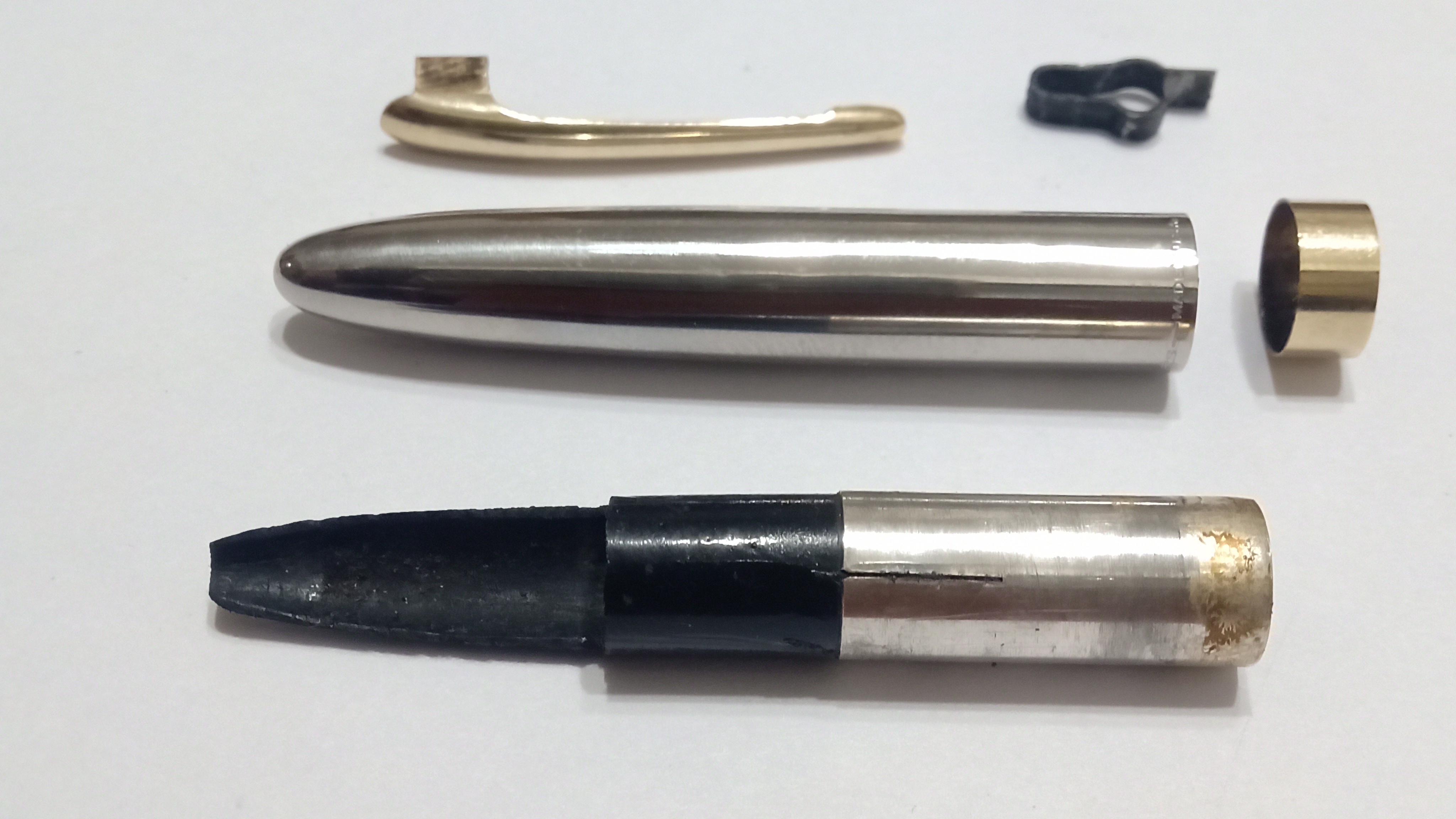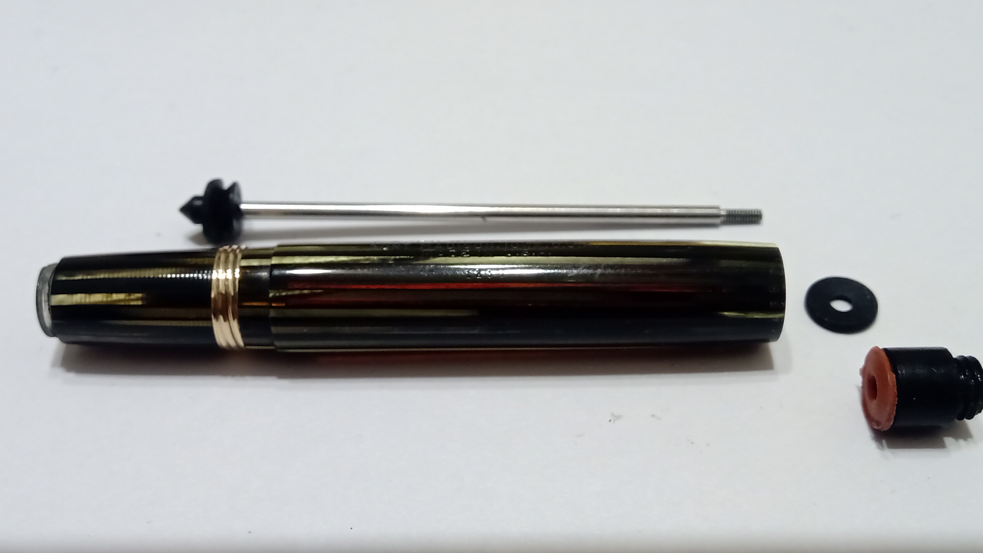 Smontando il corpo della stilografica, rimuovendo il coperchio cieco, il suo fermo, lo stelo in acciaio, il fermo gambo, la flangia interna, la penna e l'alimentatore, sono state necessarie circa due settimane di acqua con detergente neutro (50 e 50%) per ammorbidire l'inchiostro pietrificato che era nel serbatoio, alternandolo ad alcuni giorni di WD40 per sciogliere tutte le gomme e le gomme interne.