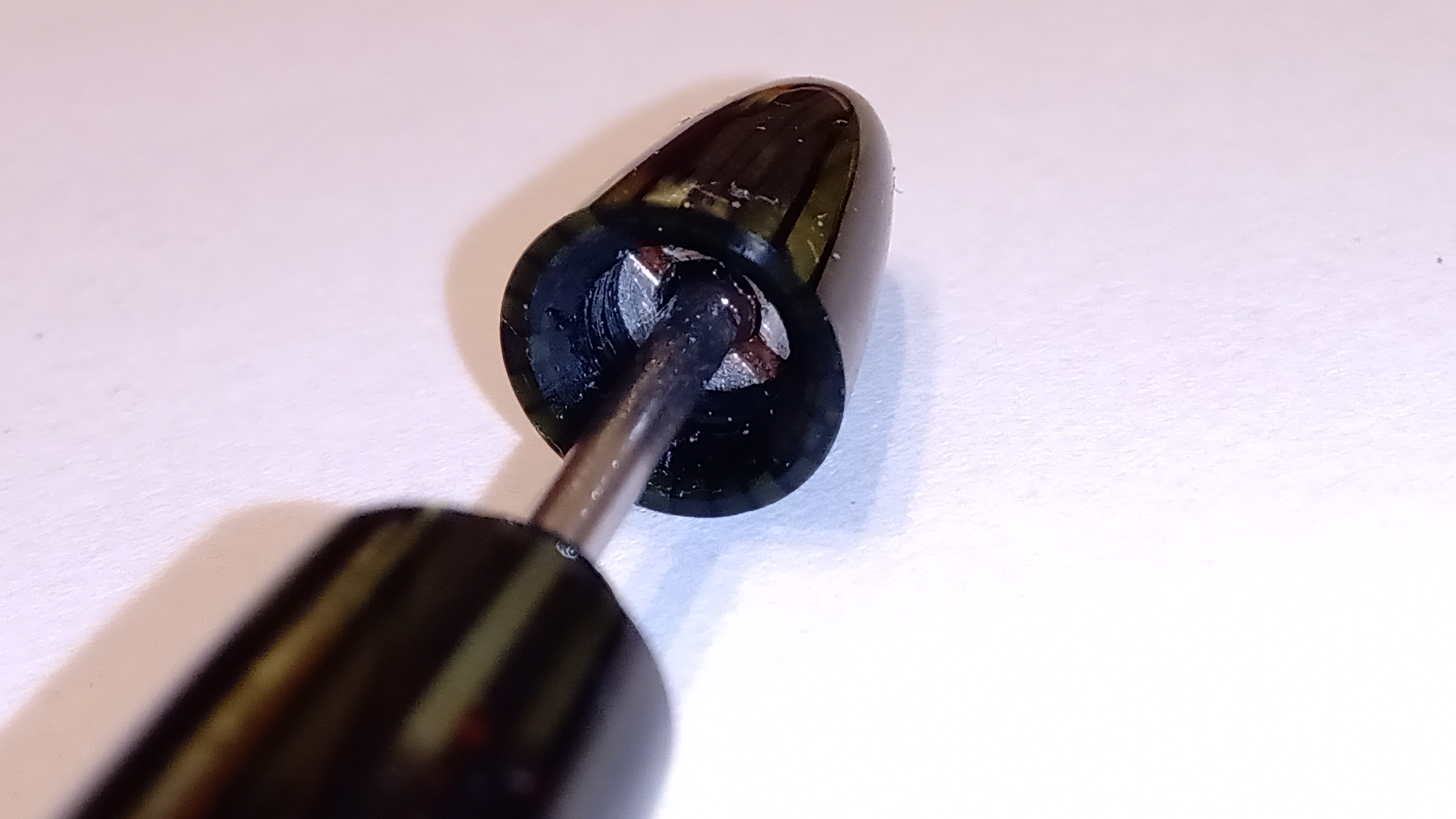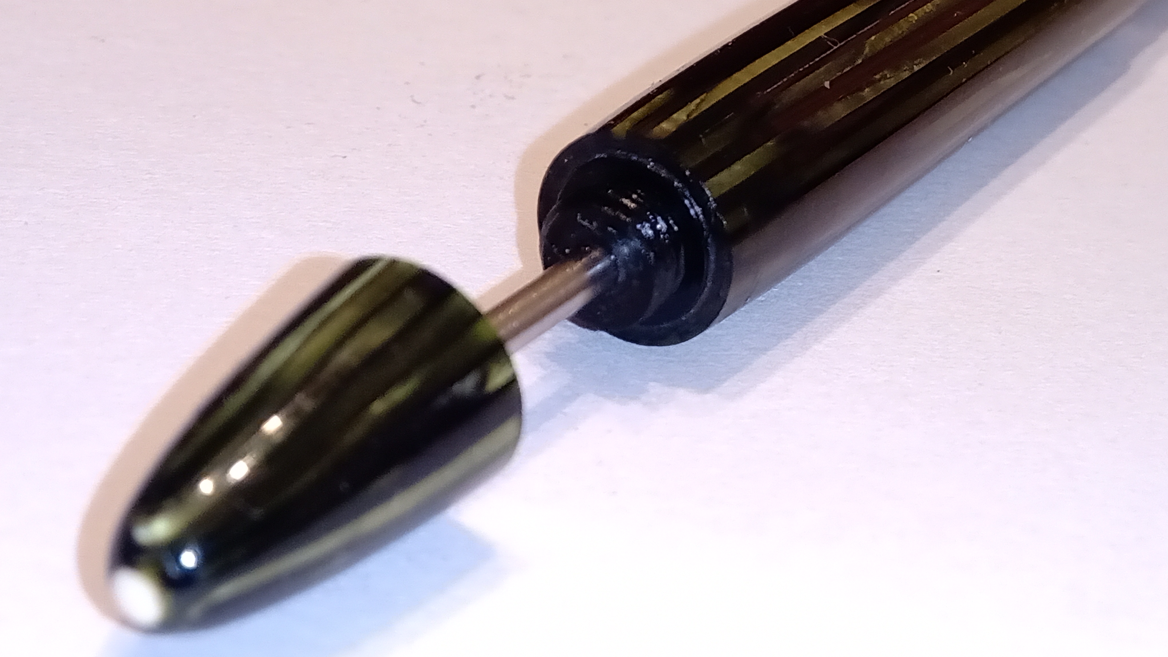 Nel caso del pennino, va prima avvitato delicatamente per conoscere la posizione in cui deve trovarsi il canale di alimentazione, quindi rimuoverlo, posizionare l'alimentatore nella posizione contrassegnata dal canale del pennino, quindi avvitare il pennino posizionando due Piccoli giri di nastro di teflon sul filo, che eviteranno che si perda e si macchi le dita, senza dover mettere colla o shelac di alcun tipo...
