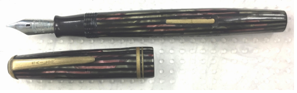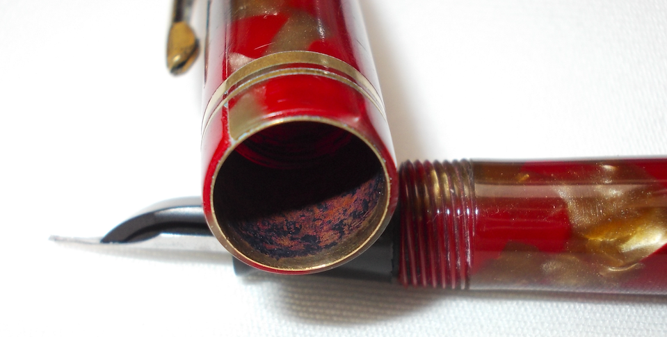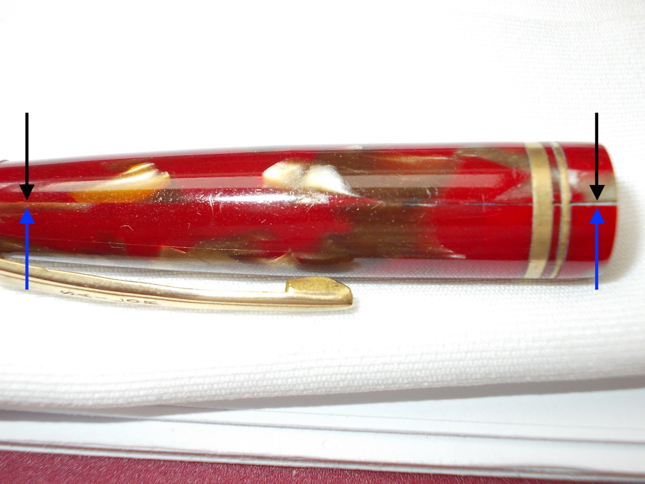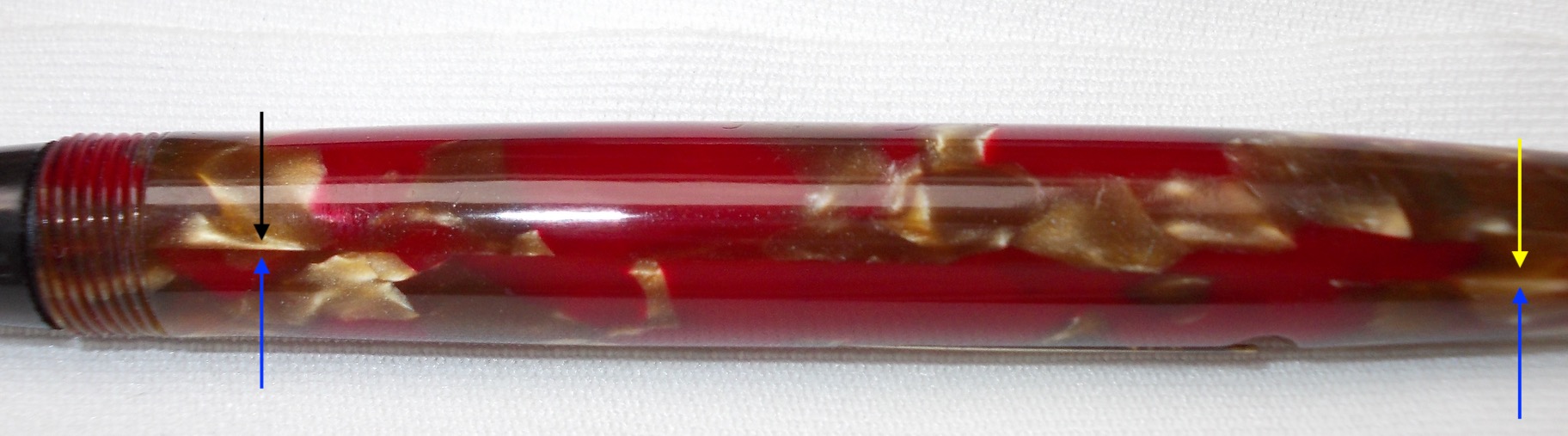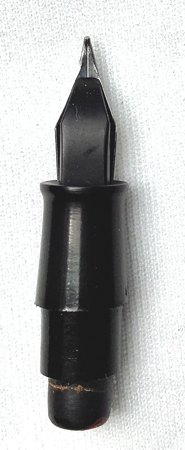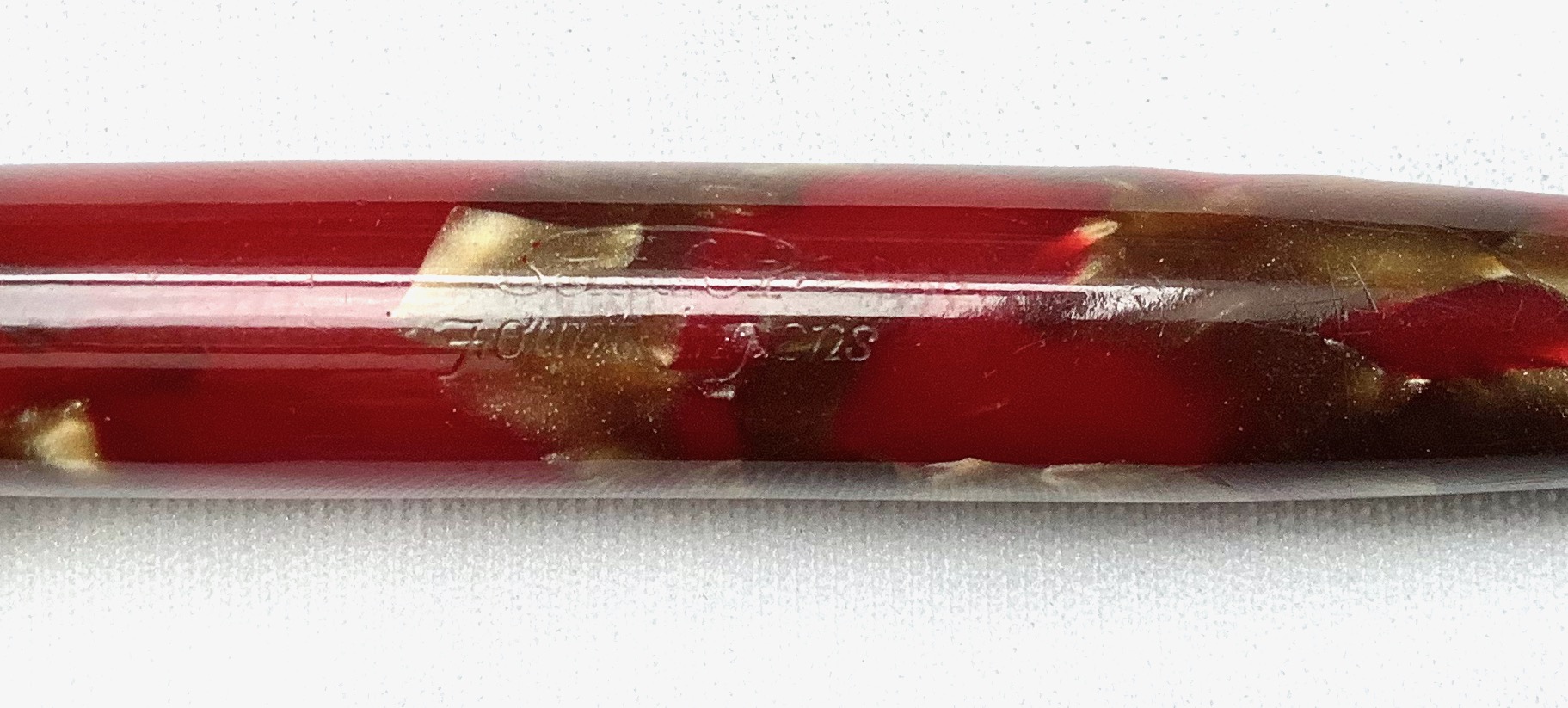 Il periodo è probabilmente fine anni '40 inizio anni '50 , considerata la fabbricazione economica (direi scontata nell'immediato dopoguerra) del pennino in acciaio e della celluloide fasciata , più economica rispetto alla barra piena da passare alla tornitura. Di seguito alcune immagini che mostrano la linea di giunzione della celluloide ripiegata .
