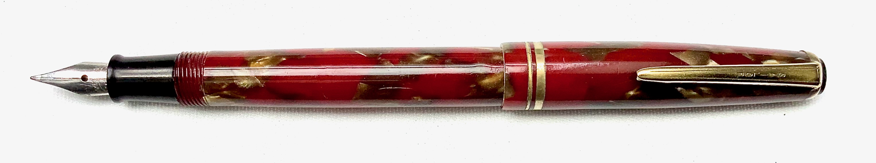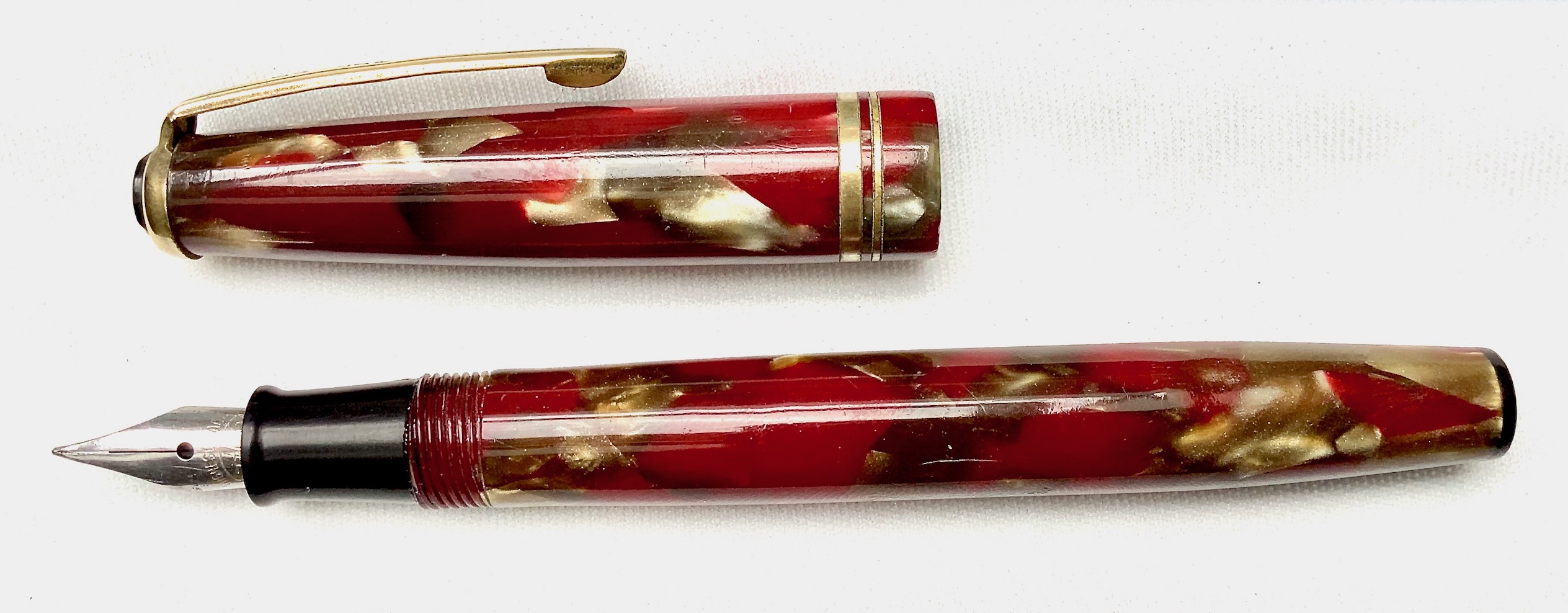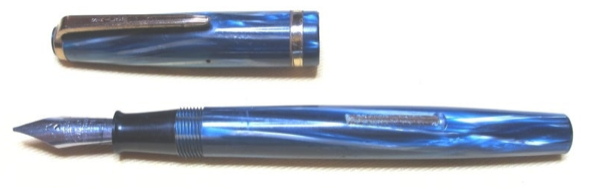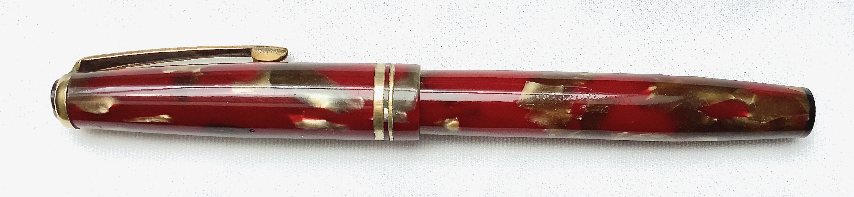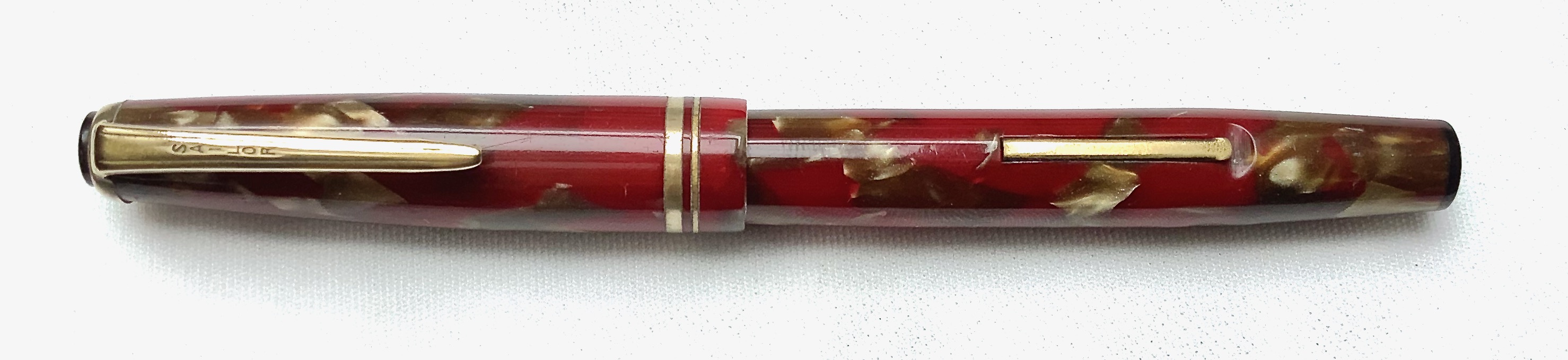 Il periodo è probabilmente fine anni '40 inizio anni '50 , considerata la fabbricazione economica (direi scontata nell'immediato dopoguerra) del pennino in acciaio e della celluloide fasciata , più economica rispetto alla barra piena da passare alla tornitura. Di seguito alcune immagini che mostrano la linea di giunzione della celluloide ripiegata .