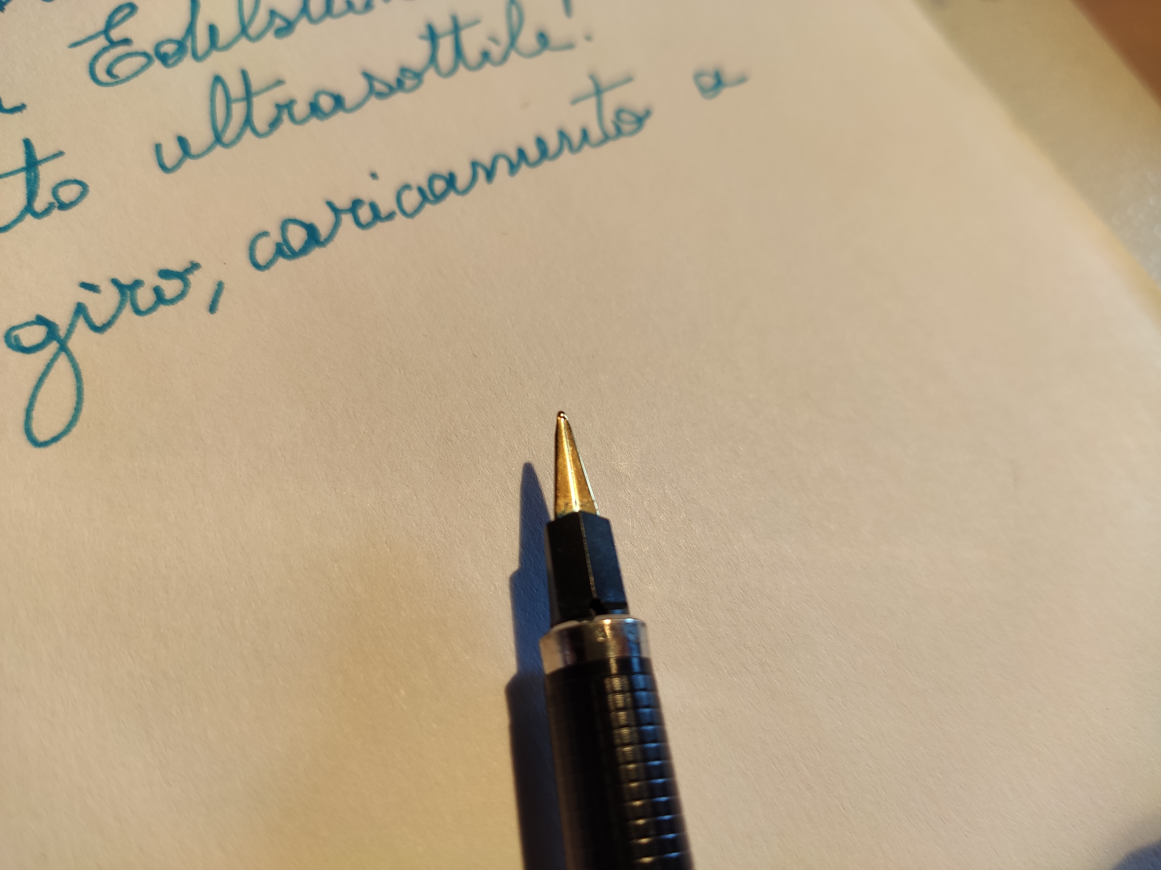 Il pennino in particolare mi incuriosisce, non ne avevo ancora visto uno fatto in questo modo. Allego anche un breve esempio di scrittura. Definirei il tratto un fine tendente al medio, non eccessivamente scorrevole, la penna presenta un lieve attrito che ricorda la presa tipica delle penne a sfera. Qualcuno ha idea di che cosa si tratta (modello, anno indicativo)?