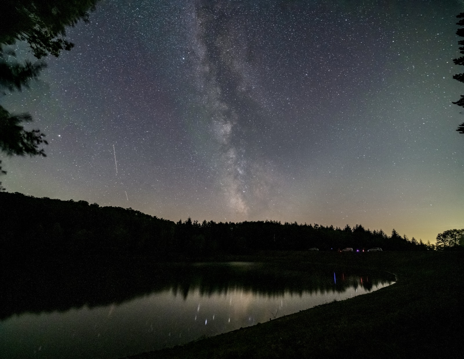 Il Lago dell’Aina a Londa (FI). La luce verde che si vede in cielo è il cosiddetto Airglow, la naturale luminescenza dell’atmosfera dovuta alla ionizzazione degli atomi di ossigeno e azoto ad opera del Sole durante il giorno. Difficilissimo da fotografare, è indice di cielo veramente scuro e poco inquinato da luci artificiali.