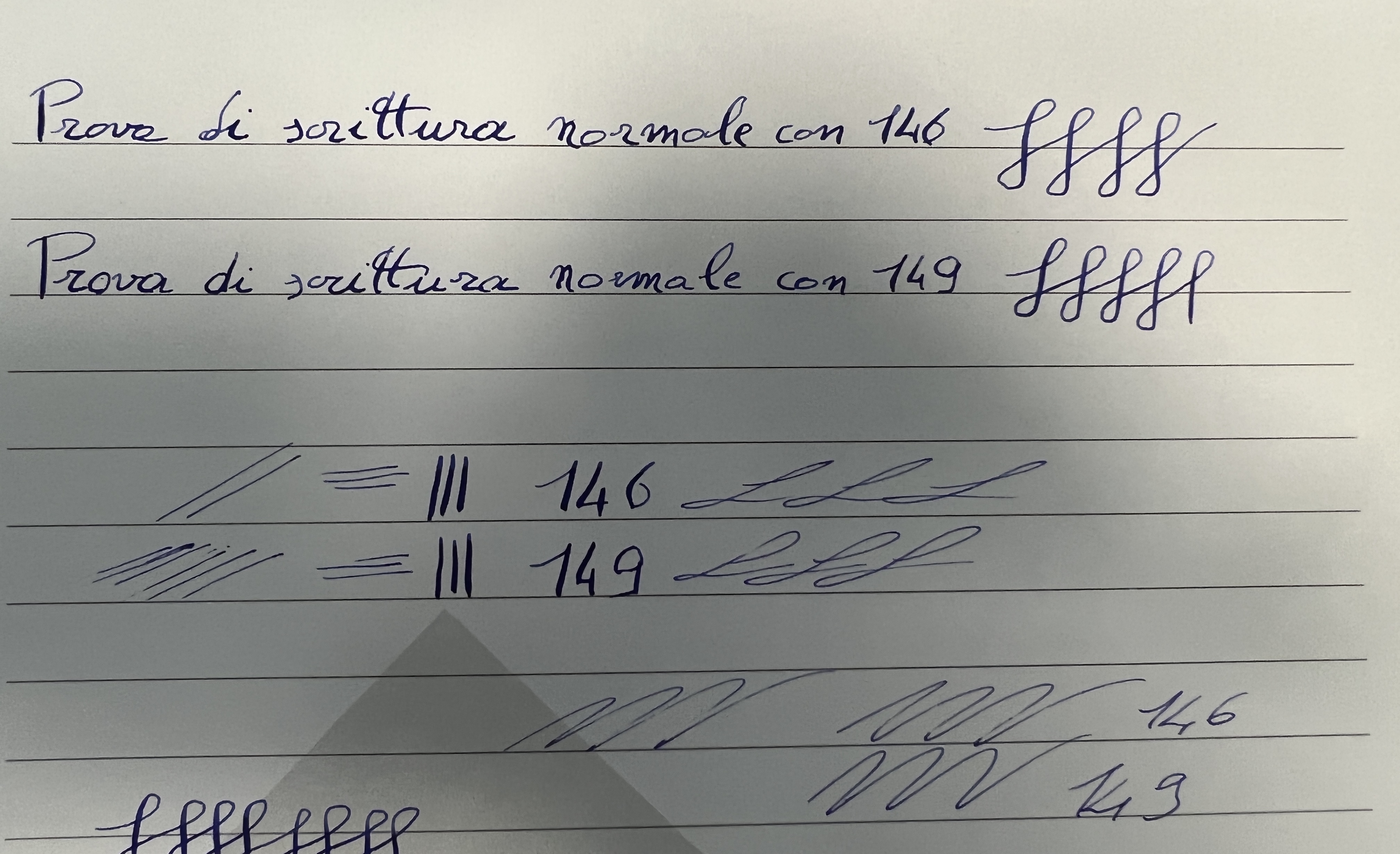 Tuttavia dire che la penna non dovrebbe scrivere se si inizia esercitando subito pressione (nel modo giusto), non mi sembra necessariamente corretto. In molti caratteri come le i, t inizi a scrivere con una discendente larga esercitando subito pressione, quindi non dovrebbe succedere che, scrivendo con la giusta calma e postura ci siano degli skip così evidenti. Con la mia 149 posso scrivere 10 “i” minuscole di fila e non ho problemi di flusso.