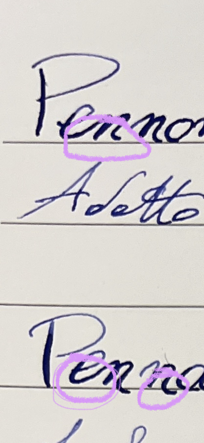 Scusami se mi permetto anche di farti un’osservazione, a vedere la tua scrittura sembra che ci sia pressione anche nei tratti orizzontali successivi a quelli verticali discendenti, e a veder come il tratto s’interrompe di netto penso che nella scrittura fermi il tratto in cui hai esercitato pressione, per toglierla tutta d’un tratto, facendo un po’ un effetto “pinzetta”… non credo faccia troppo bene al pennino, inoltre rischi di “raschiare” la carta con il rebbio sinistro, facendo finire pezzettini di carta tra i rebbi, il che non aiuta la capillarità…