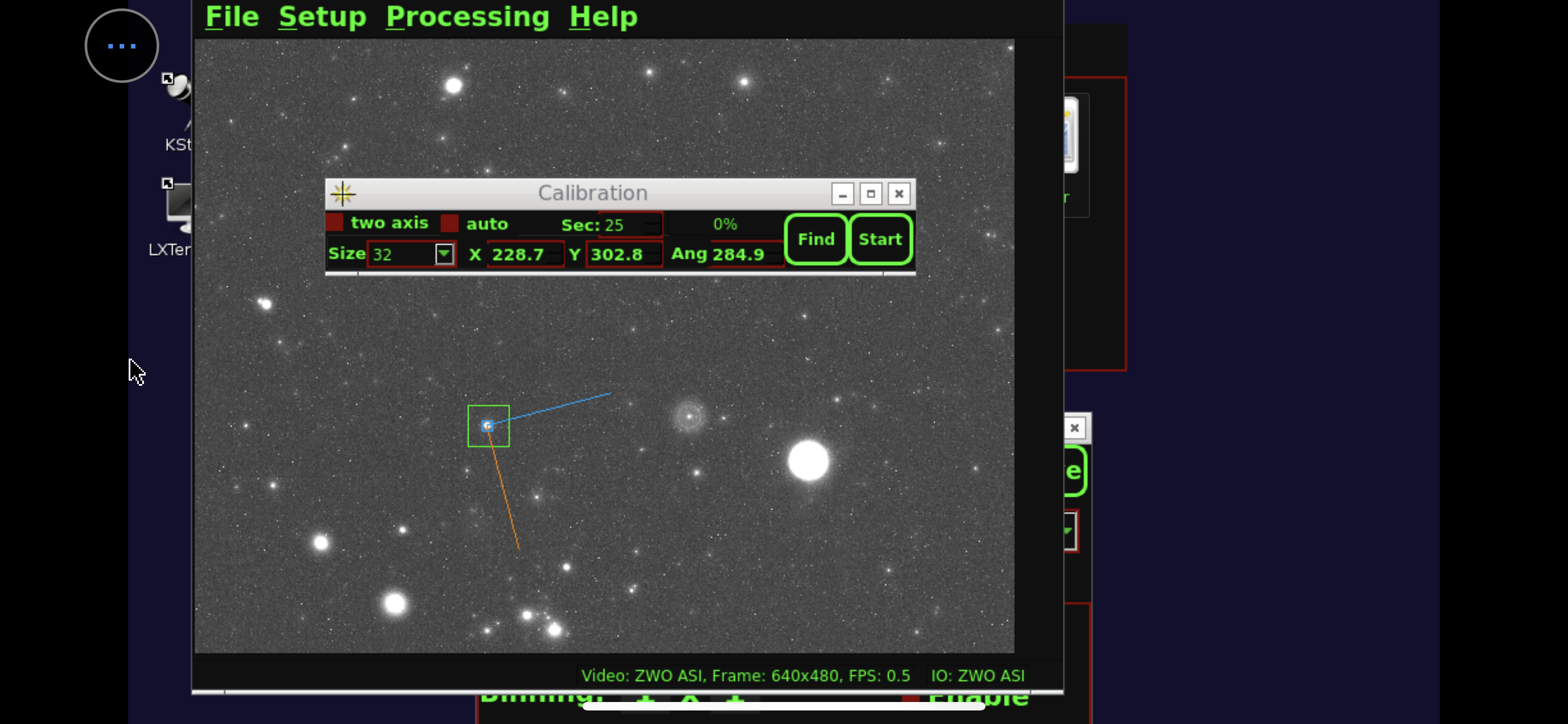 Aprendo l'apposito pannello "Focus" abbiamo una misurazione della dimensione della stella in pixel. L'uso di una stella luminosa come Vega fa molto comodo con filtri così stringenti perché ci permette di usare un tempo di refresh del live view di 5 decimi di secondo, vedendo le regolazioni quasi in tempo reale. Una stella più piccola richiederebbe tempi più lunghi rendendo noiosa e imprecisa la regolazione. Partiamo con una pessima messa a fuoco da 10 pixel (segno che ho inavvertitamente toccato la ghiera di messa a fuoco durante il trasporto dentro e fuori dal garage) che porto velocemente a valori più consoni. 2 è già un ottimo valore, ma si può migliorare e, infatti, riesco a scendere fino a 1,1. Ora possiamo finalmente puntare il soggetto da fotografare: la Crescent Nebula che può essere trovata nella pulsantiera sia come "oggetto denominato" o con il numero di catalogo NGC6888. La montatura riparte e in un paio di secondi centra il bersaglio. Allunghiamo il tempo di refresh del live view a 20 secondi per controllare di essere nel posto giusto. Una volta trovata la giusta inquadratura (che nel mio caso vede la Crescent al centro, ma poteva vederla spostata più in là per includere meglio la stella Sadr), è il momento di sfruttare l'autoguida per bloccare l'inquadratura.