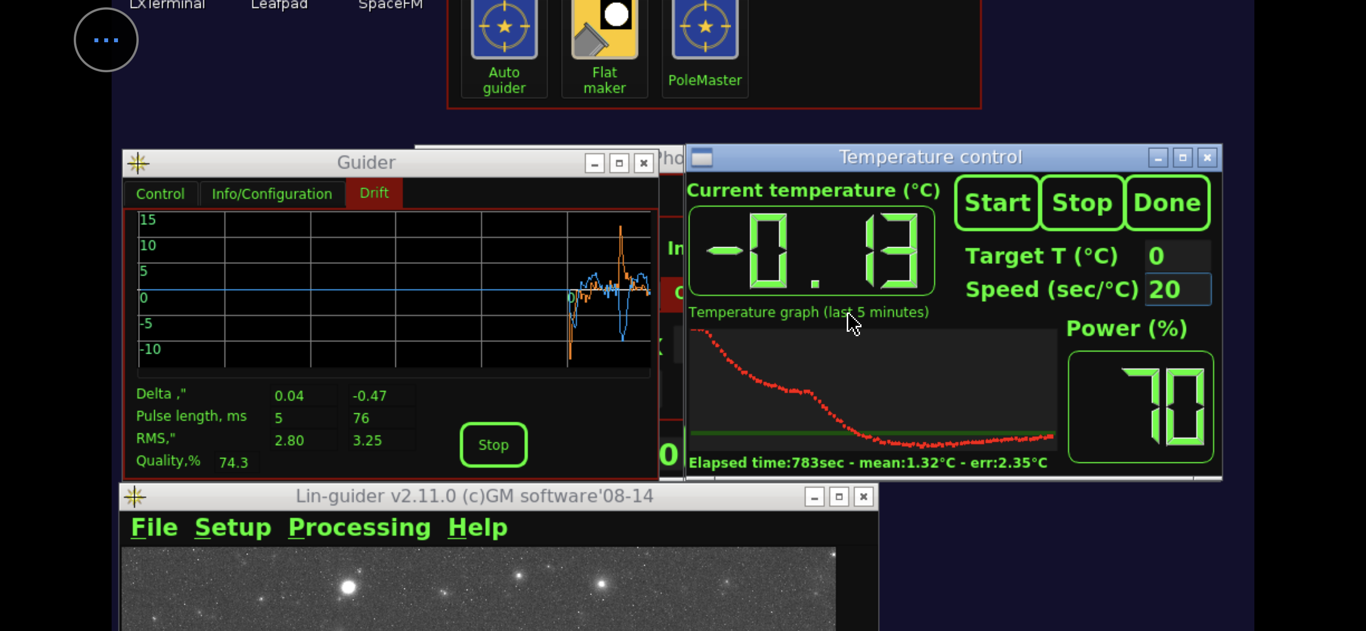 L'apposito software sfrutterà l'inquadratura della seconda fotocamera per scegliere una stella, farla muovere di qualche pixel inviando impulsi alla montatura per capire con che angolo si muovo gli assi (calibrazione) e poi farà tutto il possibile per mantenere quella stella nel punto esatto in cui era all'inizio e correggerne eventuali spostamenti dovuti a errori di bilanciamento, di allineamento al PNC, folate di vento, varie ed eventuali. Un grafico segnalerà l'ampiezza degli spostamenti dell'inquadratura e le correzioni che l'autoguida ha dovuto apportare per tornare a 0. L'unica cosa che resta da fare è impostare la sequenza di scatti e aspettare la fine del crepuscolo per farla iniziare (per le operazioni appena descritte serve una manciata di minuti, è molto più lungo leggere la descrizione dei passaggi che la loro effettiva attuazione).