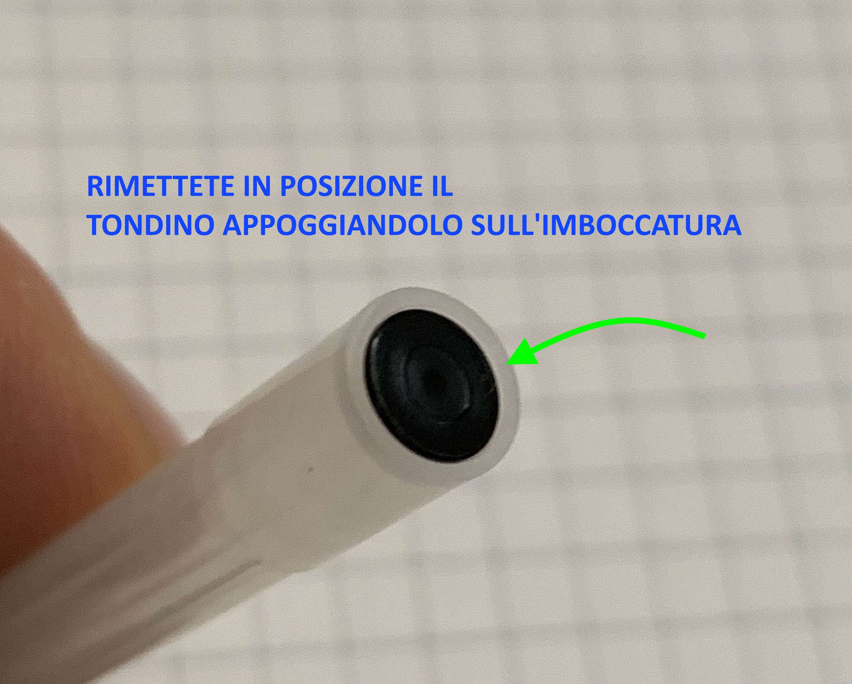 ATTENZIONE, se andate oltre potete ri-estrarre il tondino come avete fatto la prima volta, ma sarà più difficile perchè sarete finiti nel punto più stretto della cartuccia e inoltre adesso è piena di inchiostro, qundi andate delicati quando premete il tondino in posizione.