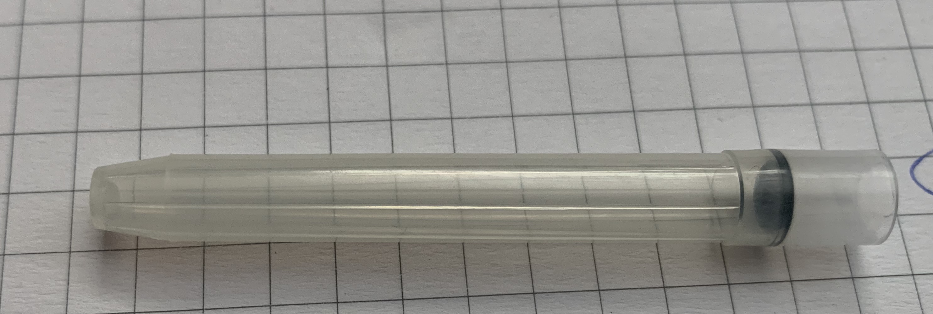 4. Ricaricate la cartuccia con il vostro inchiostro usando la siringa. ATTENZIONE non riempite fino all'orlo la cartuccia altrimenti quando la chiudete la pressione dell'aria farà schizzare l'inchiostro. Al MASSIMO arrivate fino a dove inizia il colletto più largo dell'imboccatura, meglio un pochino più sotto, per riferimento la prima volta potete guardare una cartuccia Pilot nuova ancora carica (ecco a che serviva), giusto per sicurezza come livello state 1 o 2 mm sotto.