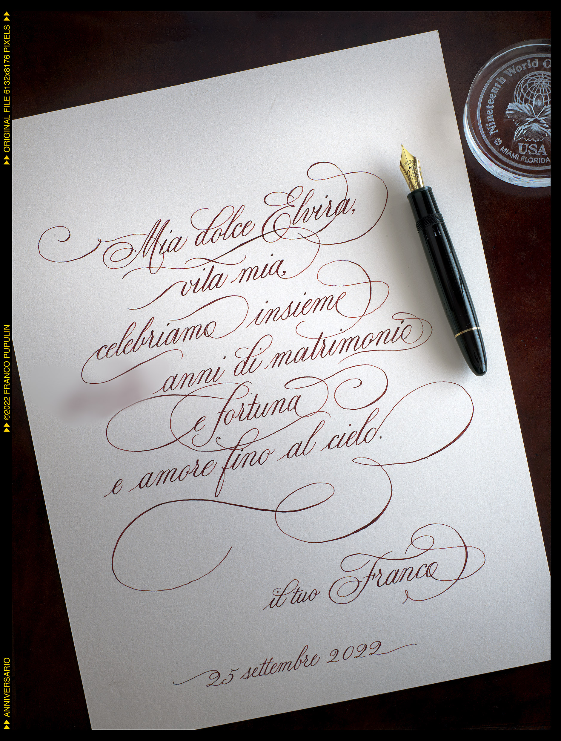 Ecco il mio bigliettone di buon anniversario fatto trovare al mattino. Montblanc 149 Calligraphy, carta Fabriano Unica color crema e inchiostro Parker Quink Red.