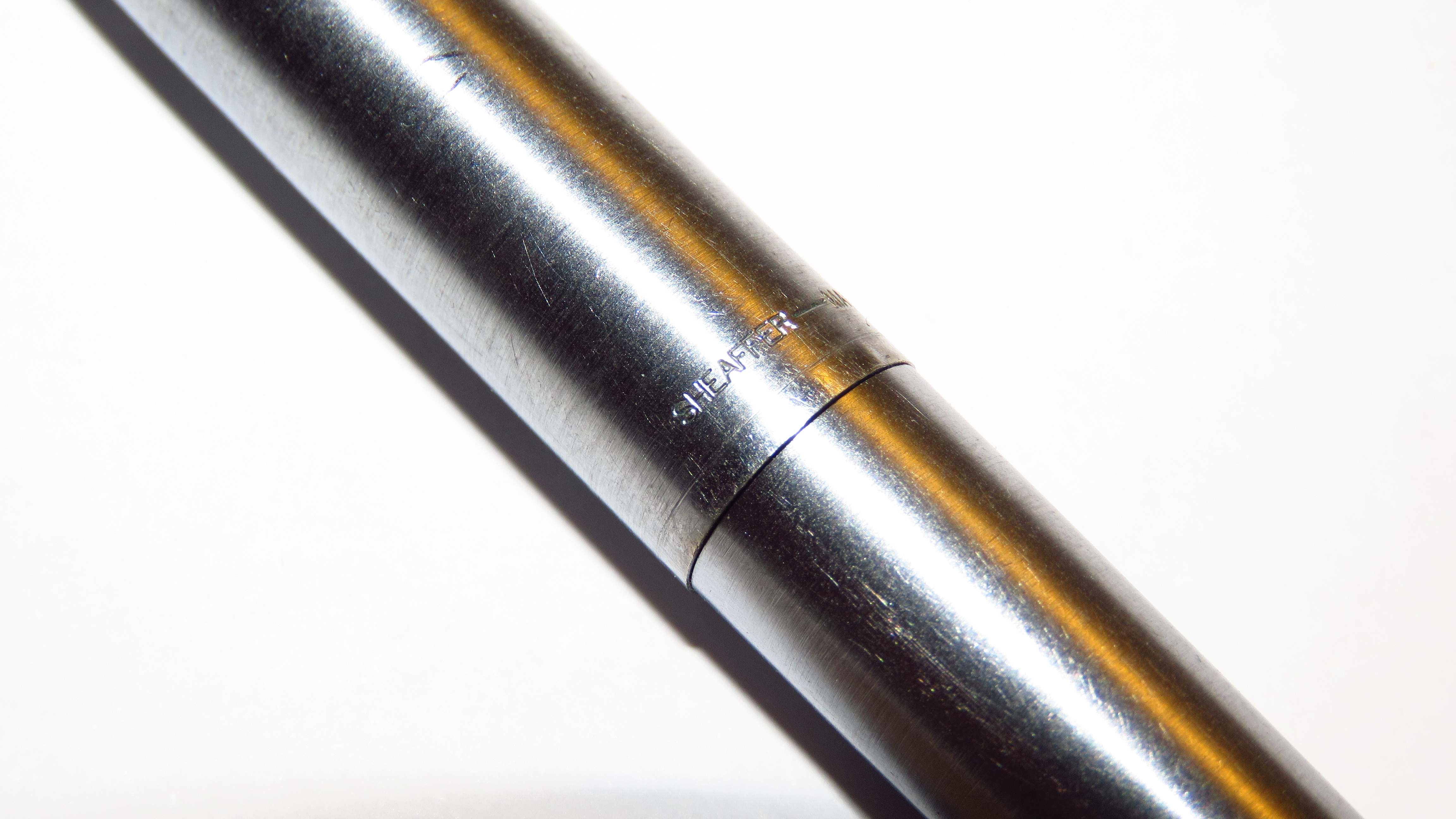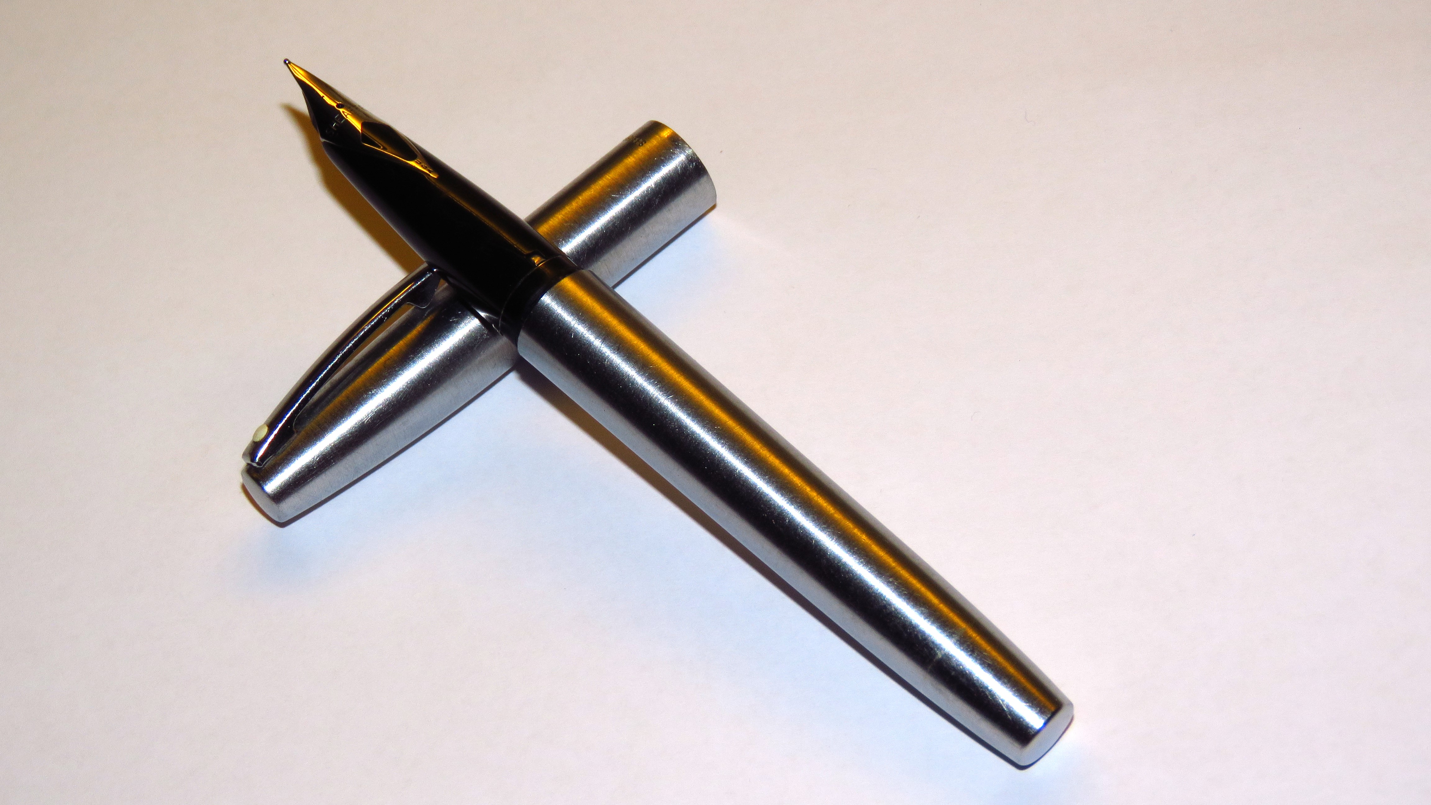 Pennino a coda di rondine, tratto F. Scrive meravigliosamente bene grazie alla pallina di iridio lavorata a sfera.