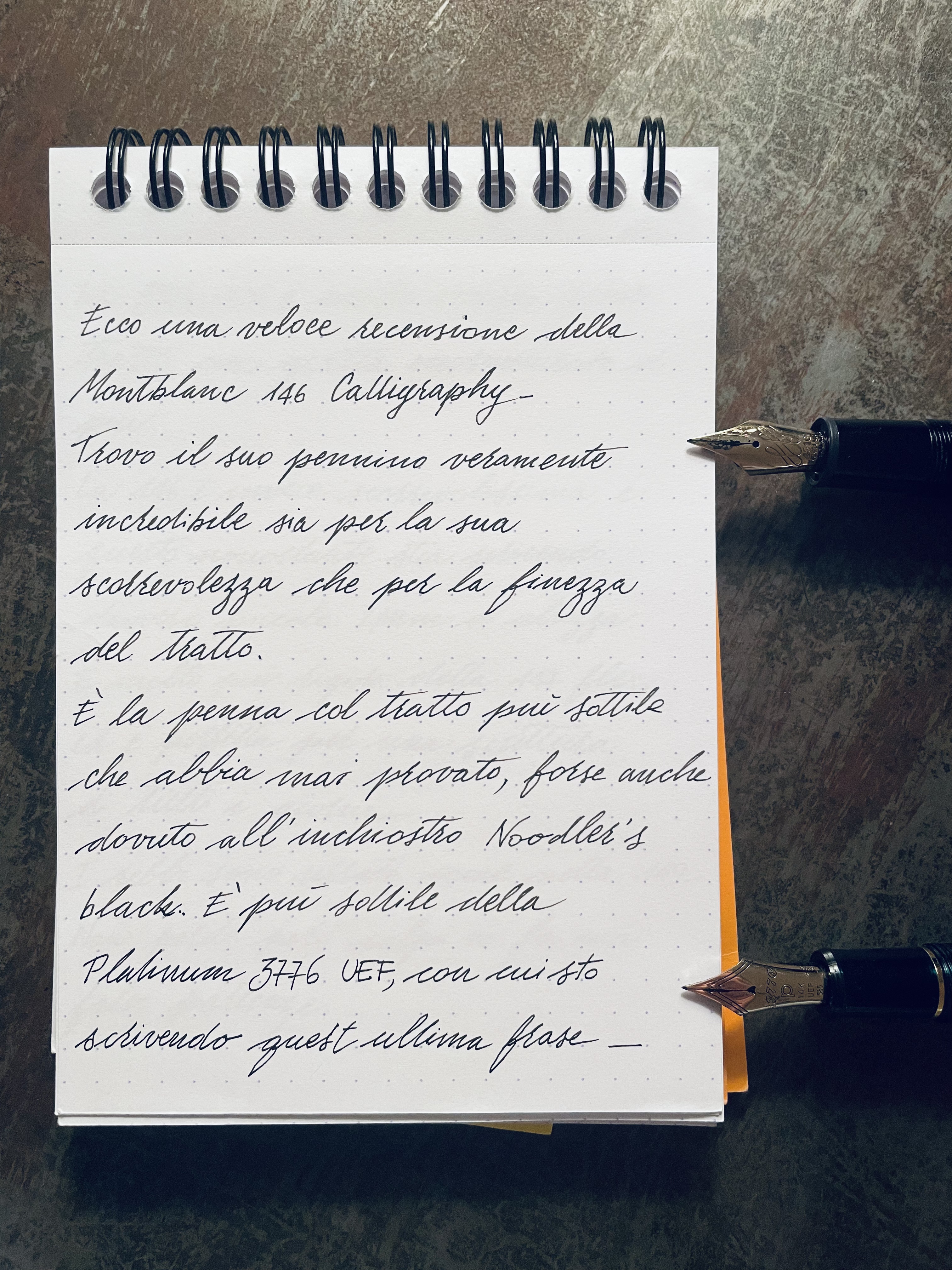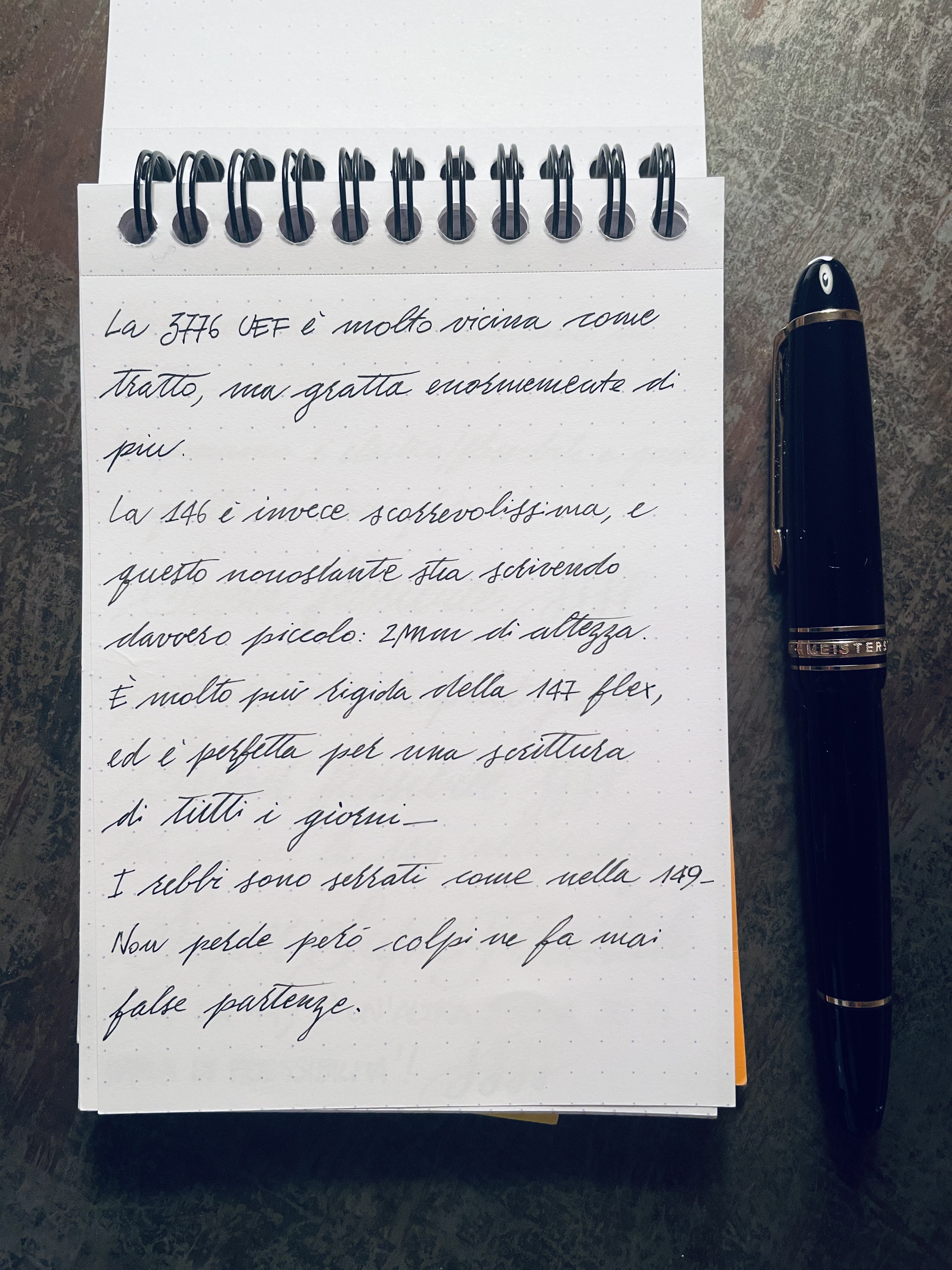 Trovo la 146 una penna stupenda, direi una EEF giapponese come tratto. Non fa una falsa partenza, non gratta per nulla e ha poco feedback. A parità di pressione da variazioni molto minori rispetto alla sorella maggiore in quanto il pennino è decisamente più rigido. Nei prossimi giorni vi prometto che farò qualcosa di più ordinato e fatto bene….